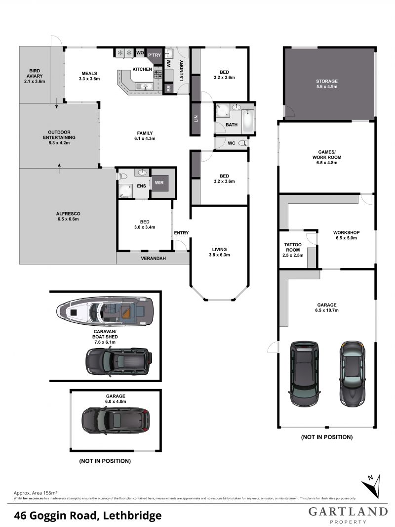 Now for the sheds! Start with a 10.65x6.4m shed with 2 roller doors as well as a single side roller door. Continue through to a 5x6.4m workshop and a 4.8 x 6.4m games or work room featuring double sliding doors. All are powered and concreted.