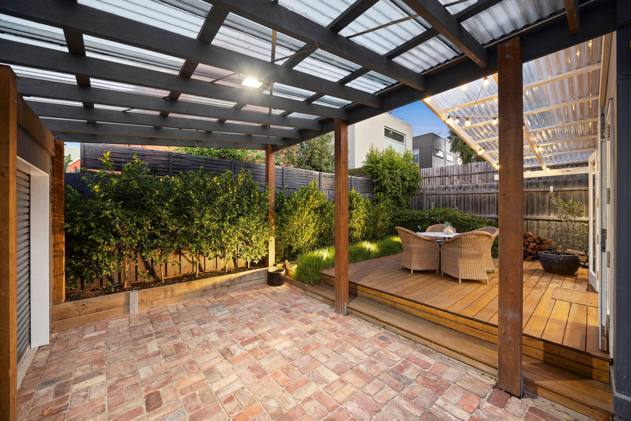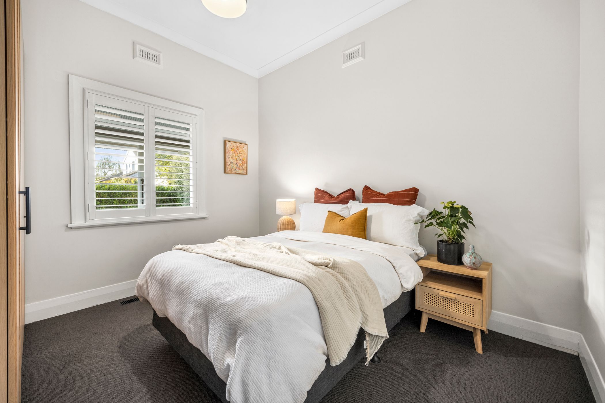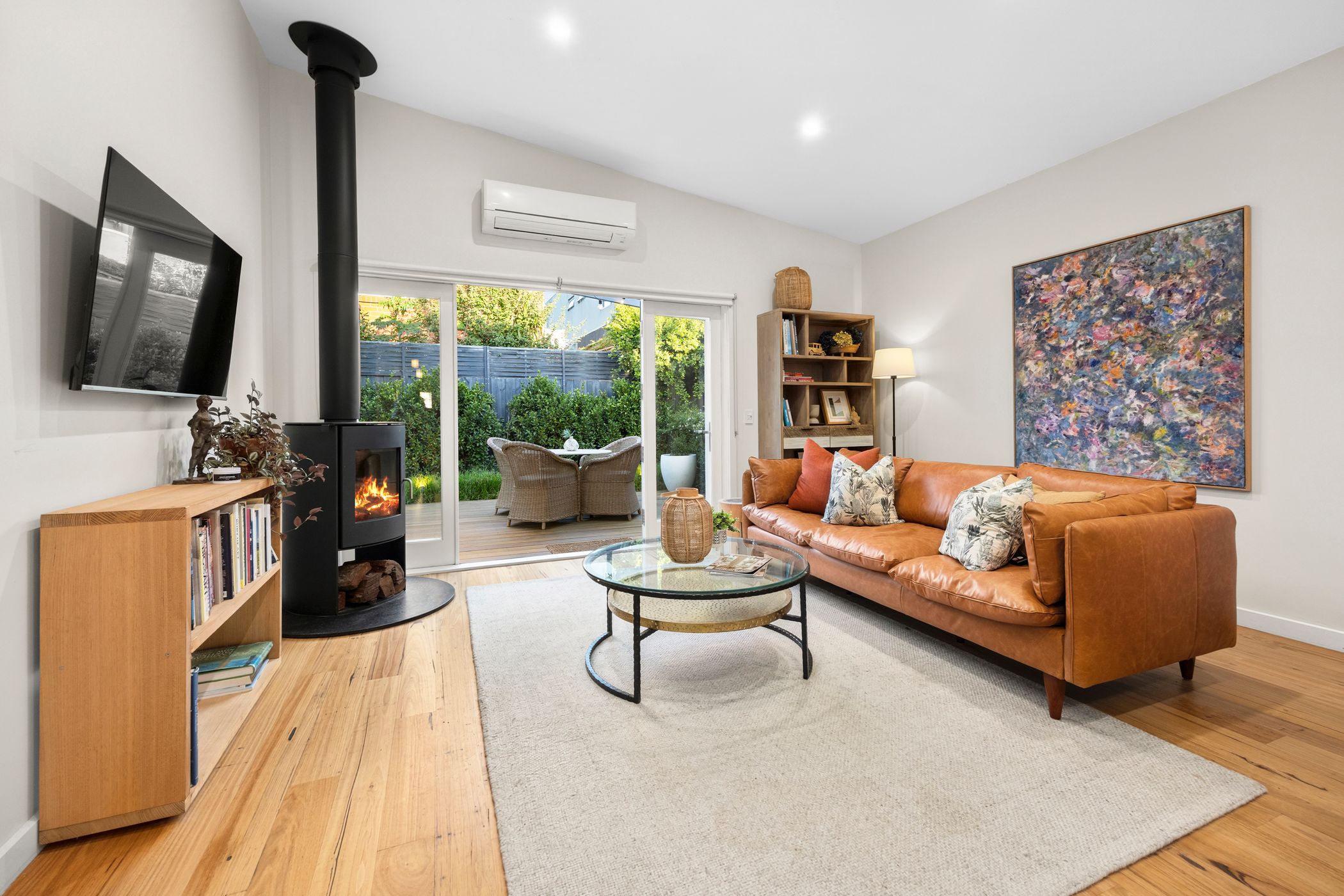 Accommodation includes a beautifully appointed master suite complete with a fully fitted walk-in robe and chic ensuite. Two additional bedrooms feature built-in robes and share a stylish central bathroom with shower over bath and a stone-topped vanity. A European laundry adds everyday practicality, while ducted heating, split-system air conditioning and the ambient wood fire ensure year-round comfort. Externally, secure electric gate access via the side laneway leads to a carport and off-street parking for two vehicles, complemented by useful storage sheds.