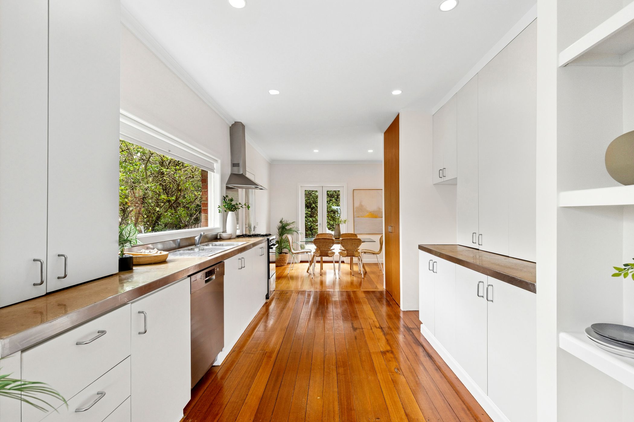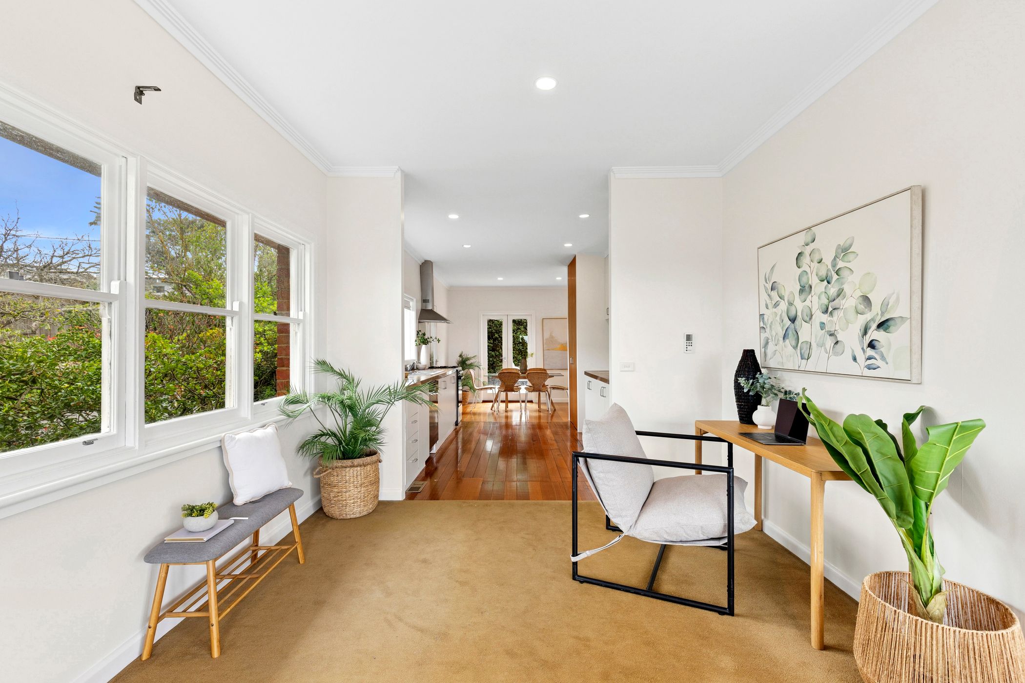 Inside, natural light streams through multi-light timber sash windows, playing across high ceilings and a lounge anchored by a wood fireplace with slate surround. Central to the flow of the home, the updated kitchen impresses with concrete formed benchtops, stainless steel appliances and abundant preparation and storage, creating a space as functional as it is striking. The adjacent meals area is filled with verdant green views, with French doors opening to a private patio creating the perfect stage for afternoon soirees and effortless alfresco entertaining.