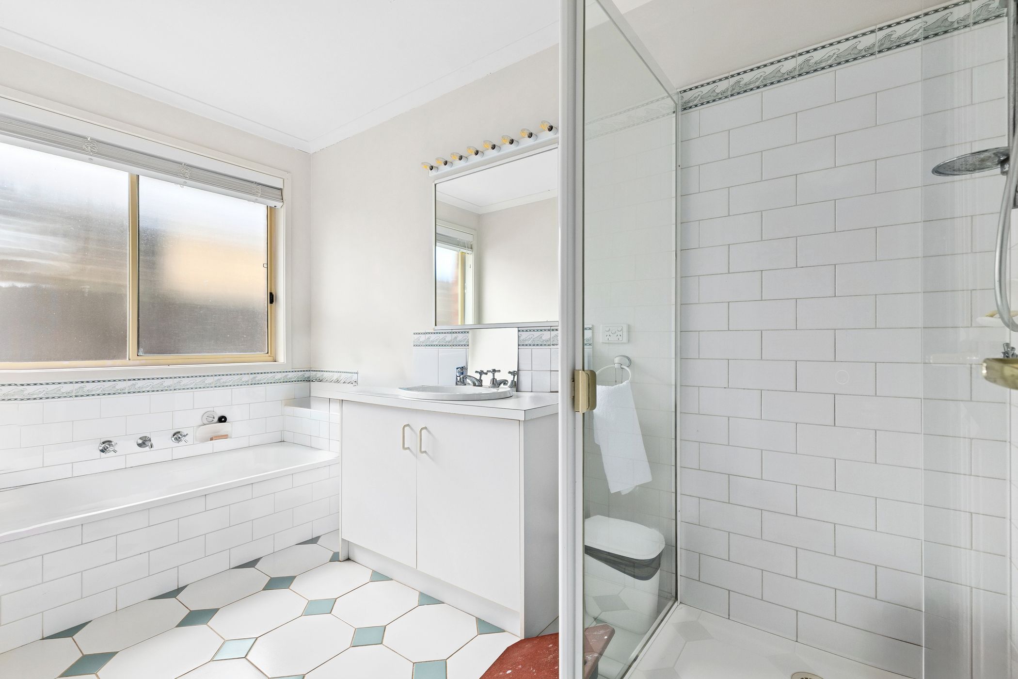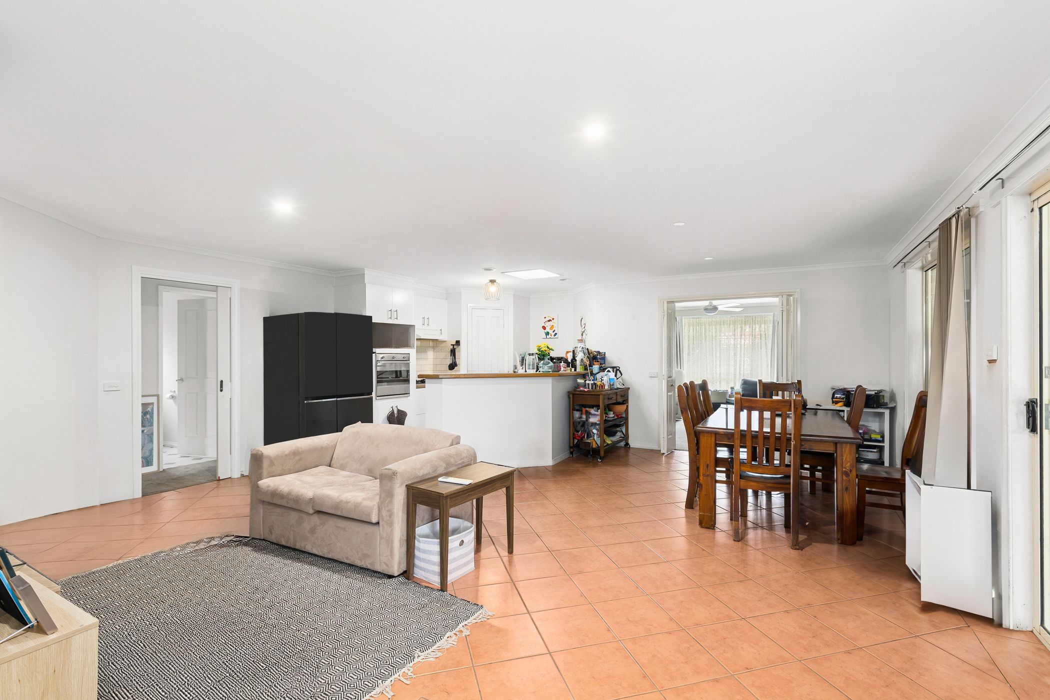 The functional kitchen features gas cooking and ample cabinetry, while a separate rear hallway leads to two additional bedrooms with built-in robes, a family bathroom, laundry and separate W/C.