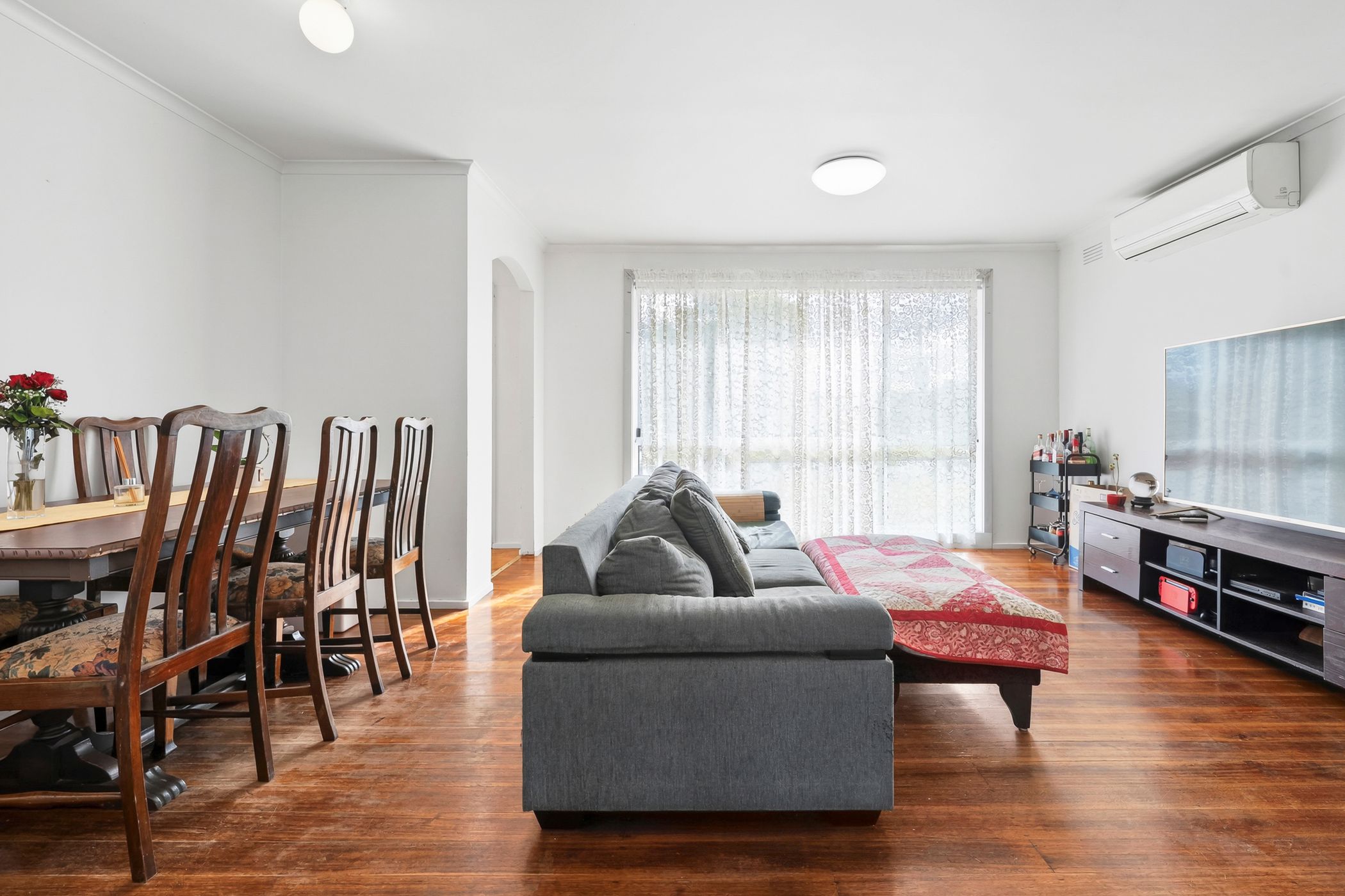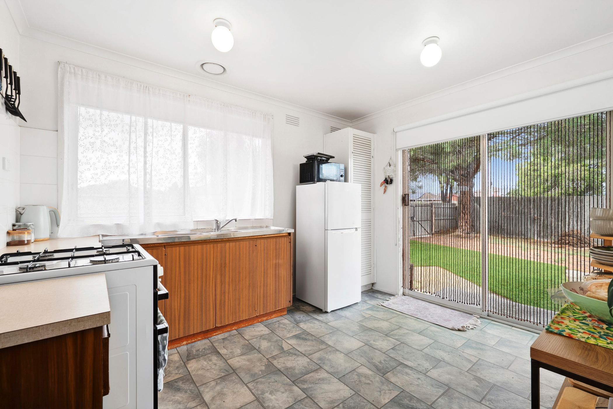 A welcoming entry leads to a sun-filled lounge and dining area, creating a warm and relaxed space. The adjoining kitchen is well appointed with gas cooking and offers functional preparation and storage space.