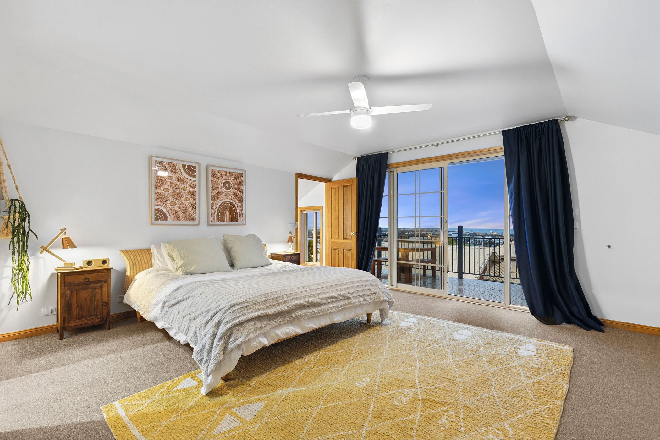Also on the ground floor: a central bathroom, laundry with under-stair storage, and internal access to the double garage. Upstairs, the private main suite offers a peaceful retreat with its own ensuite, expansive walk-in robe, split-system heating/cooling, ceiling fan, and a private deck with spiral staircase. On clear days, enjoy breathtaking views stretching from the You Yangs to Melbourne and the Bellarine Peninsula.