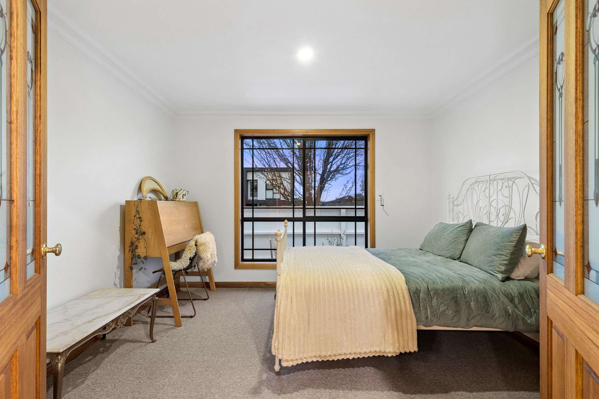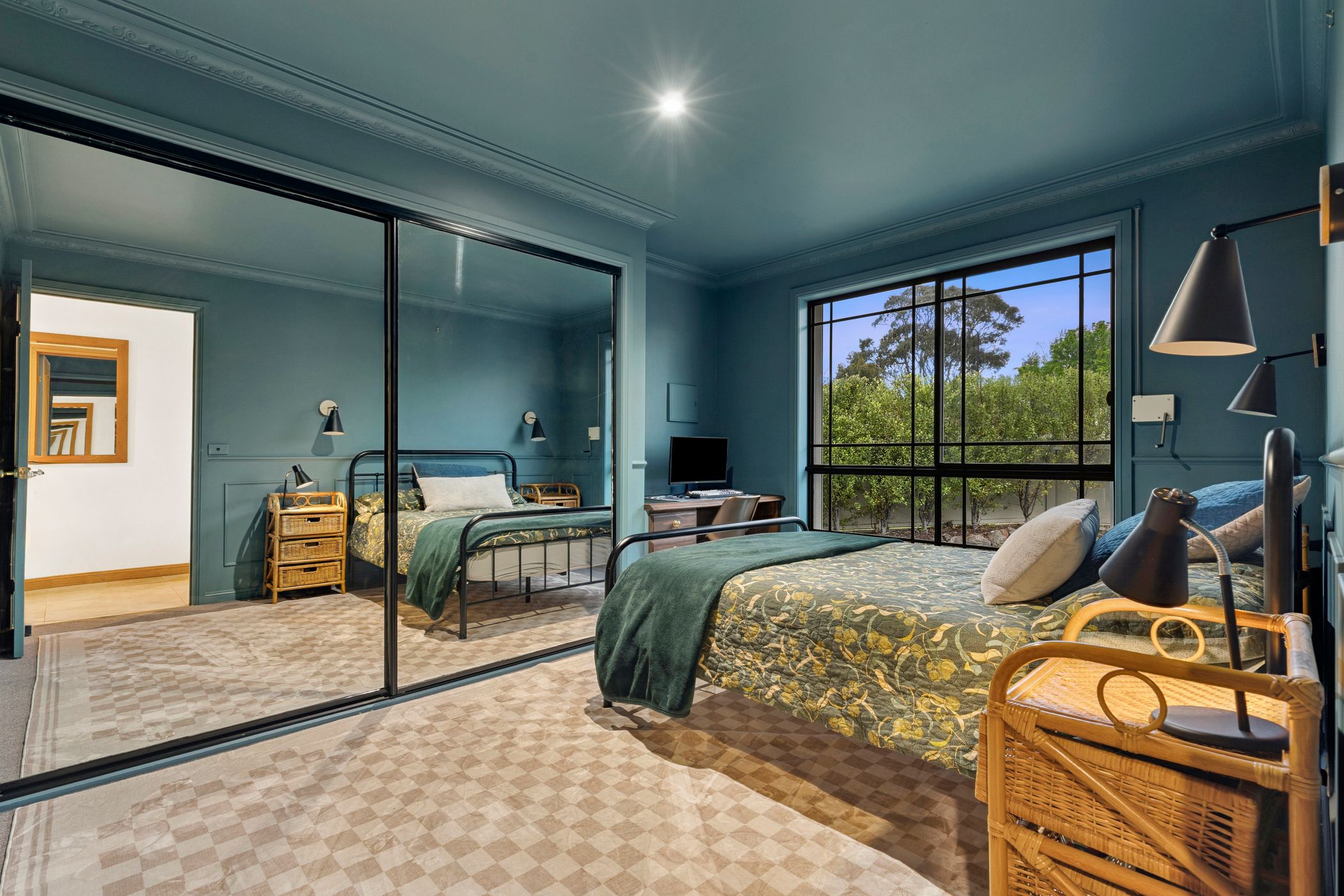 Step inside and feel instantly at home. Original tiled entryways and warm timber accents-including rich hardwood floors-are complemented by creamy walls and whisper-white ceilings, creating a serene and welcoming atmosphere. The ground floor offers three versatile bedrooms: two with mirrored built-in wardrobes, one with French doors perfect as a study or lounge, and another painted in moody blue, enhanced by a built-in desk, decorative wall panels, and wall sconces.