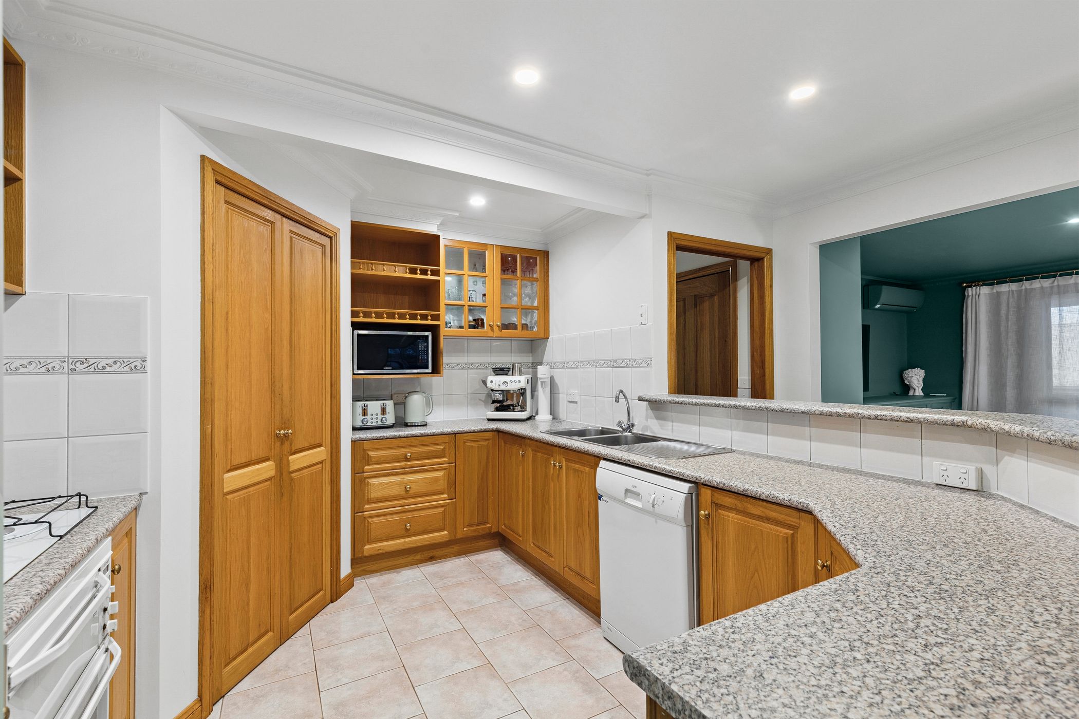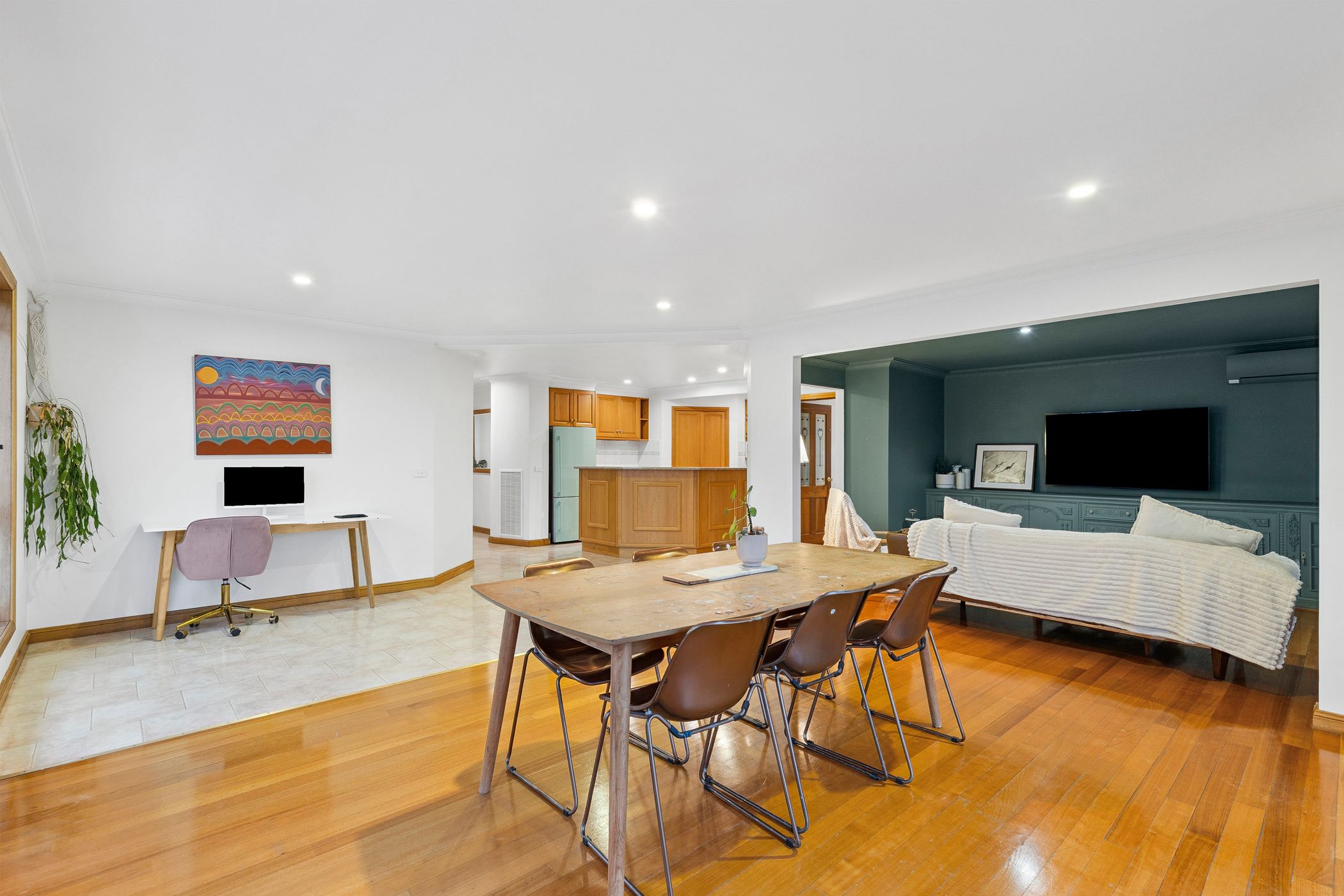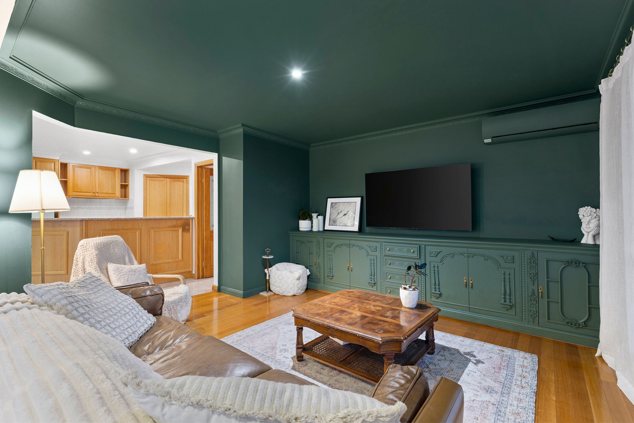At the heart of the home lies a spacious open-plan kitchen, living, and dining zone. The kitchen features a walk-in corner pantry, dishwasher, built-in oven, and wide four-burner gas cooktop. A sun-drenched dining area and flexible family space flow into a moody green lounge with built-in cabinetry and split-system heating/cooling. This entire zone opens to a covered outdoor entertaining area, ideal for hosting in any season.