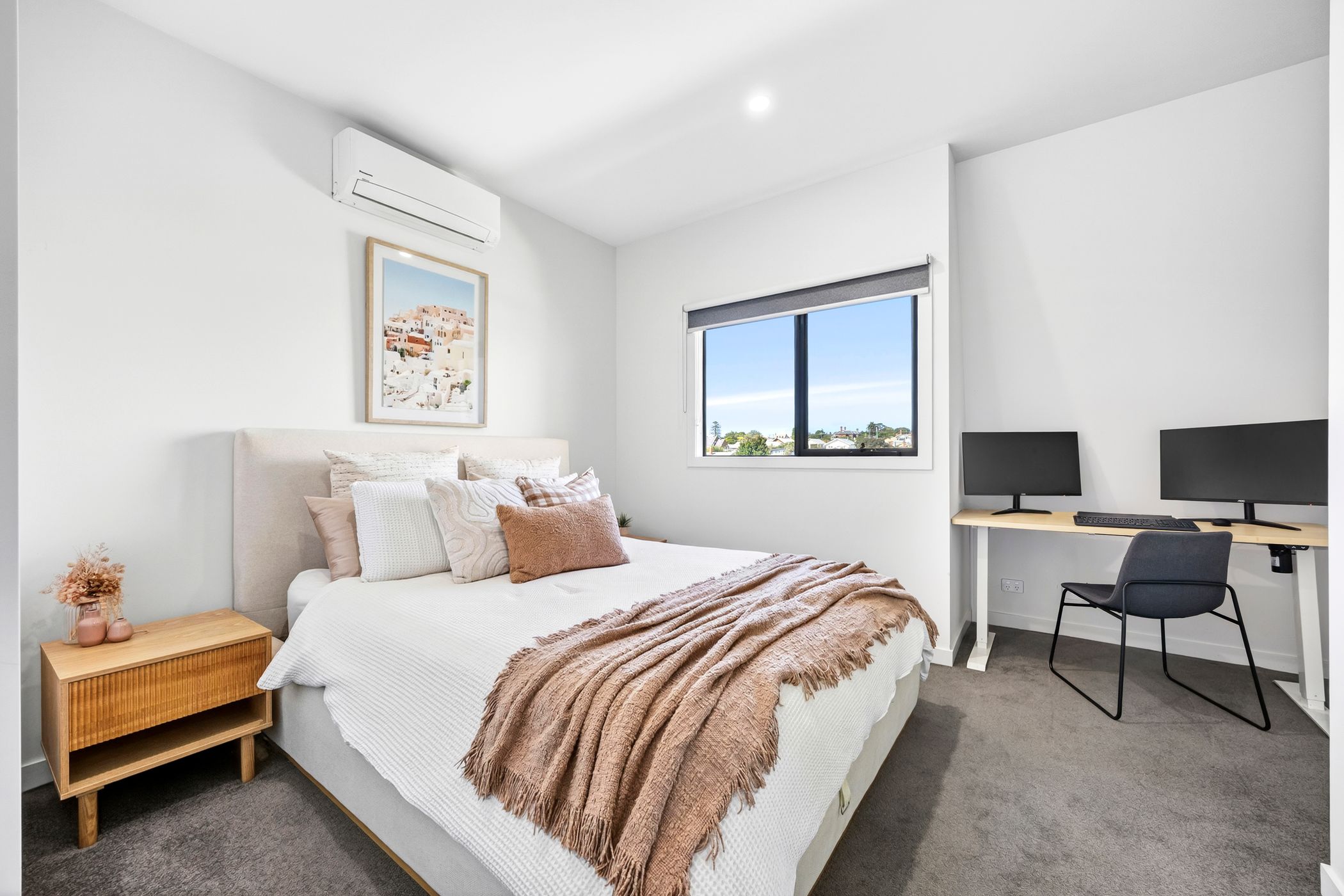 Upstairs, the mid-level forms the lively hub of the home, where open-plan living, dining and kitchen zones are framed by sliding doors at both ends, inviting natural light and fresh air to flow throughout. A north-facing balcony with an electric awning provides the perfect setting for morning coffee or relaxed entertaining. At the centre of the space, the sleek kitchen impresses with stone benchtops, quality appliances and a built-in pantry.