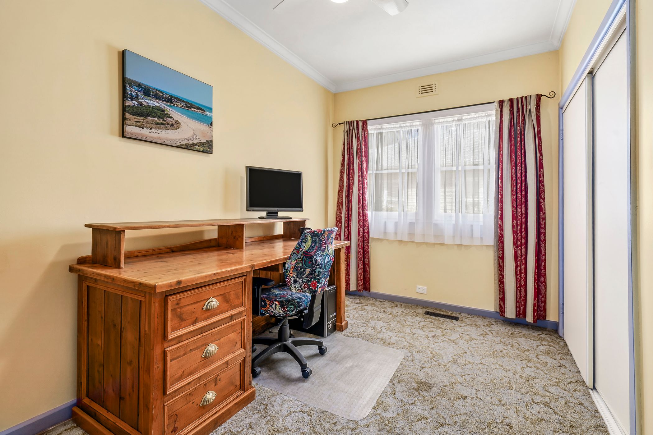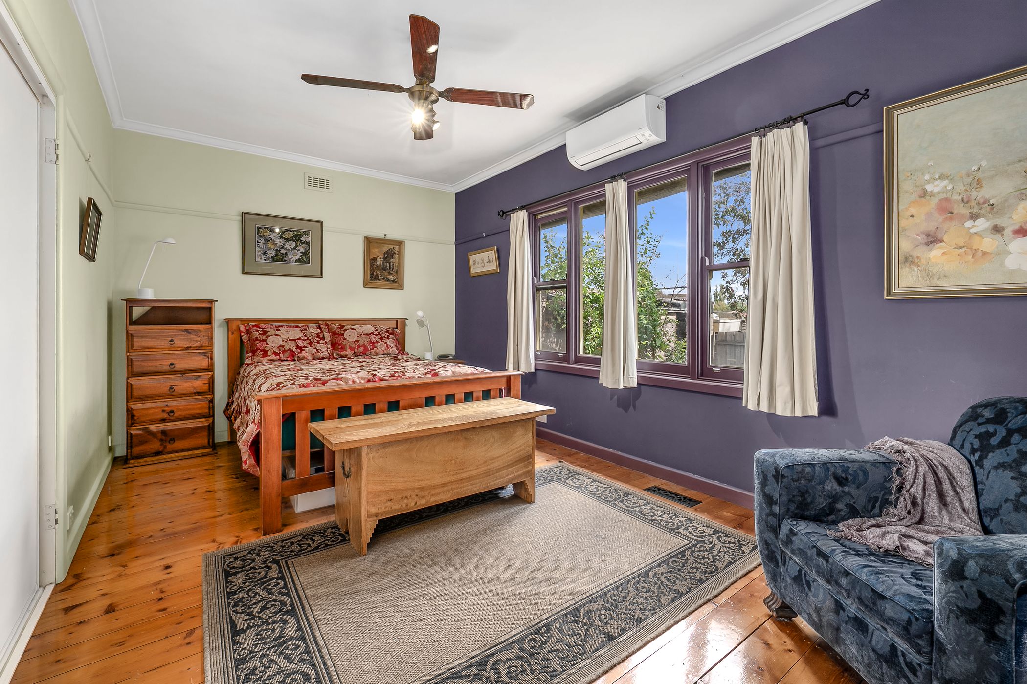 Three well-proportioned bedrooms, each with built-in robes, are centrally positioned around the main bathroom, creating a simple and efficient floorplan. A separate laundry with the added convenience of a second toilet completes the interior. Multiple reverse cycle heating/cooling units and ceiling fans provide comfort through the seasons.