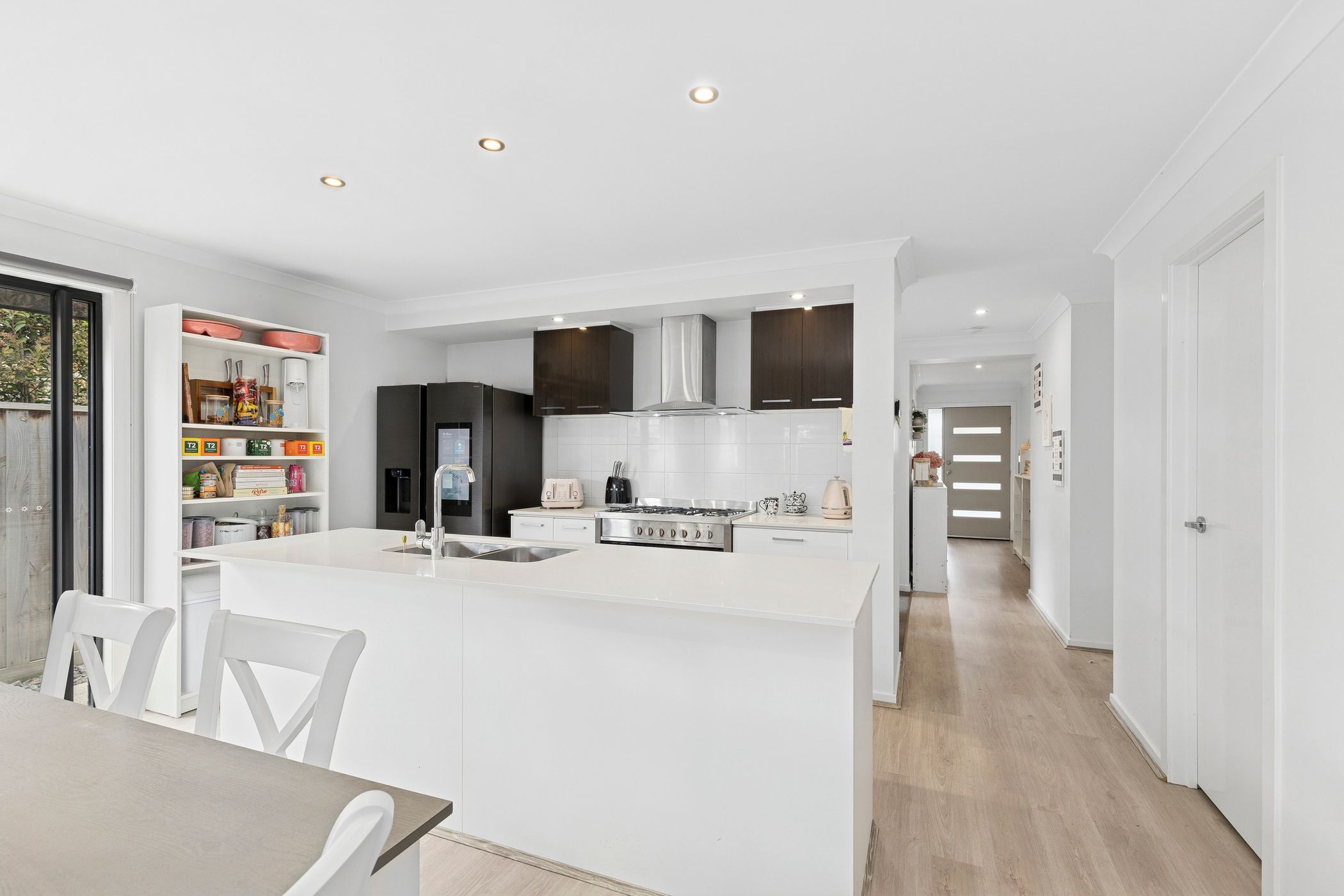 The open plan kitchen, living and dining area forms the heart of the home, bringing everyone together in one bright and spacious zone. The kitchen is sure to impress with its 20mm stone benchtops, double undermount sink, 900mm oven with gas cooktop, large fridge space and a generous walk-in pantry.
