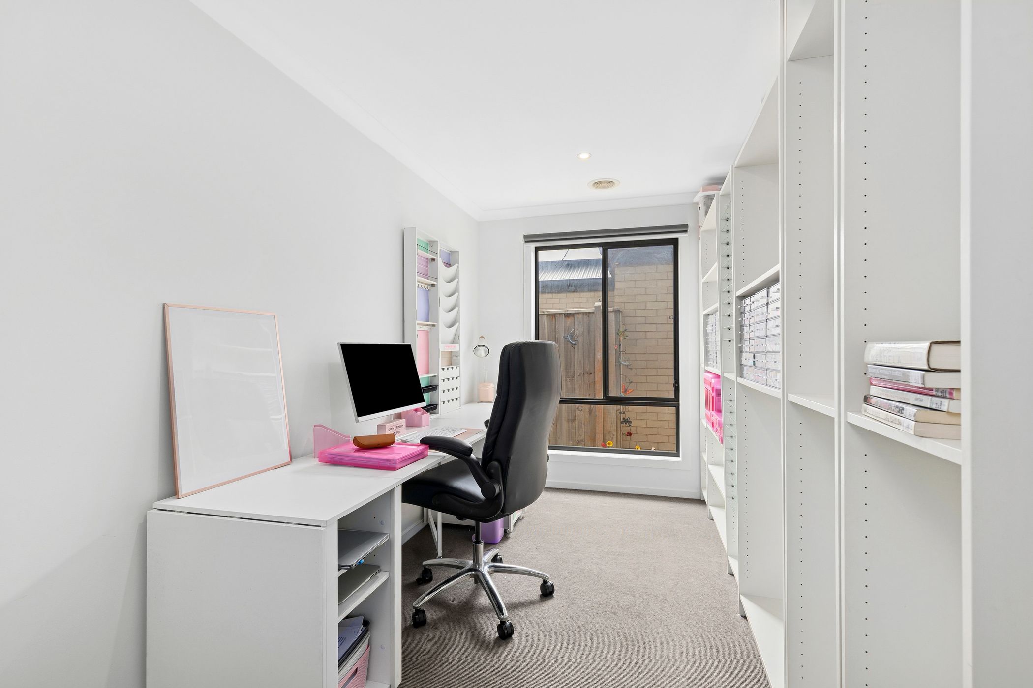 At the front of the home, the main bedroom suite provides a peaceful retreat with a walk-in robe and a stylish ensuite featuring a stone topped vanity, single basin and a large shower with a handheld showerhead. Further inside, there's a comfortable carpeted study, ideal for working from home or other hobbies, plus a second bedroom close by.
