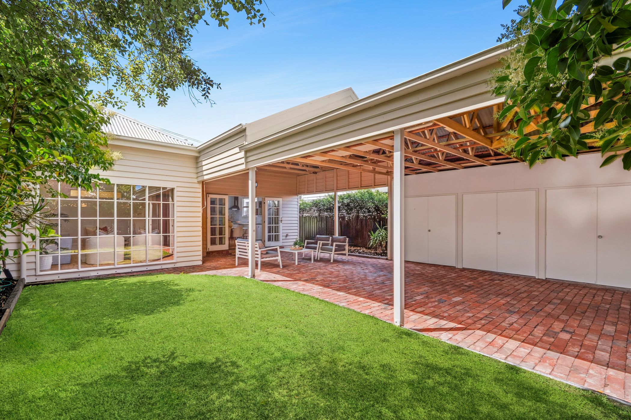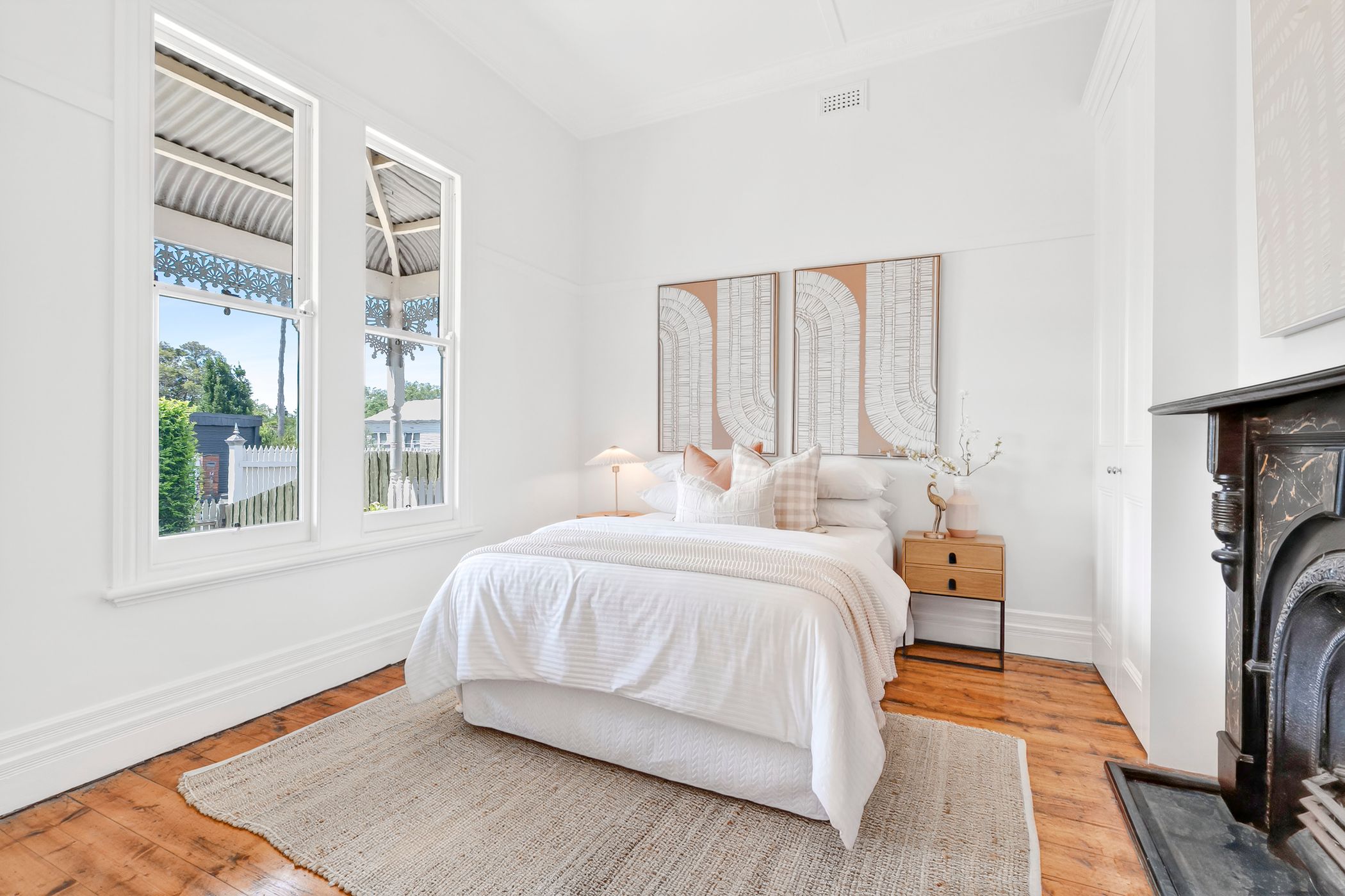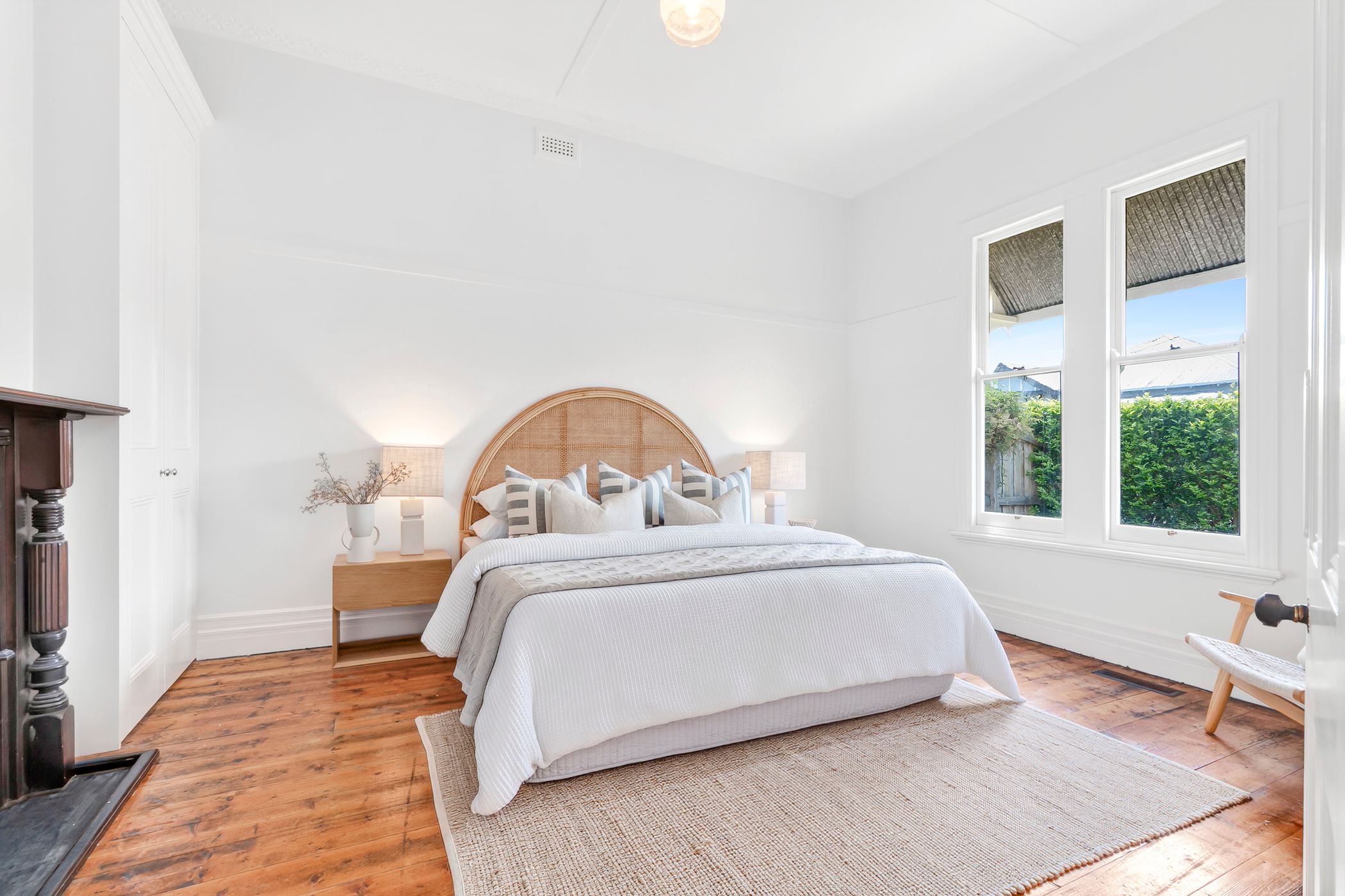 Three generous bedrooms with built-in robes include two with original fireplaces and exquisite ceiling roses. They are serviced by a spacious, sun-drenched bathroom complete with shower, spa bath, dual vanities and toilet. A separate laundry with a second toilet further enhances functionality. Ducted heating, split-system air conditioning and an alarm system ensure year-round comfort and security.