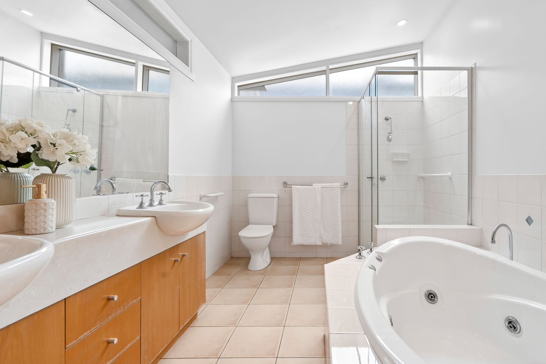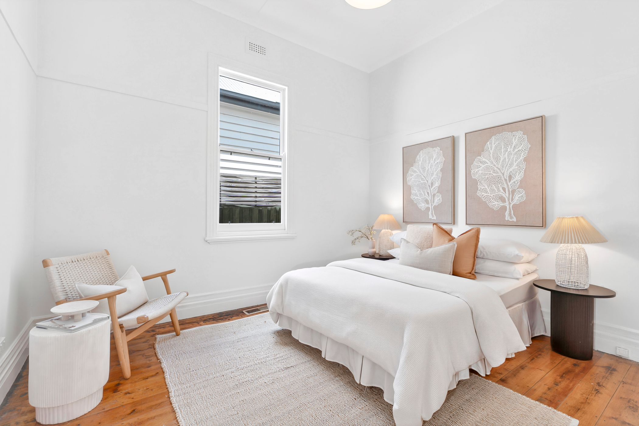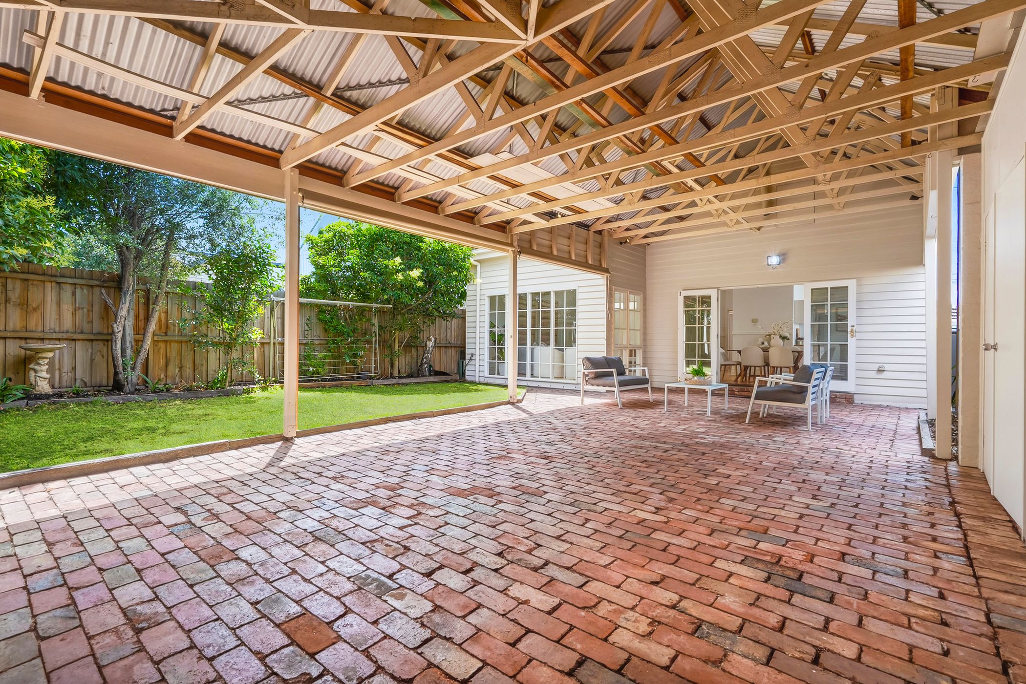 Three generous bedrooms with built-in robes include two with original fireplaces and exquisite ceiling roses. They are serviced by a spacious, sun-drenched bathroom complete with shower, spa bath, dual vanities and toilet. A separate laundry with a second toilet further enhances functionality. Ducted heating, split-system air conditioning and an alarm system ensure year-round comfort and security.
