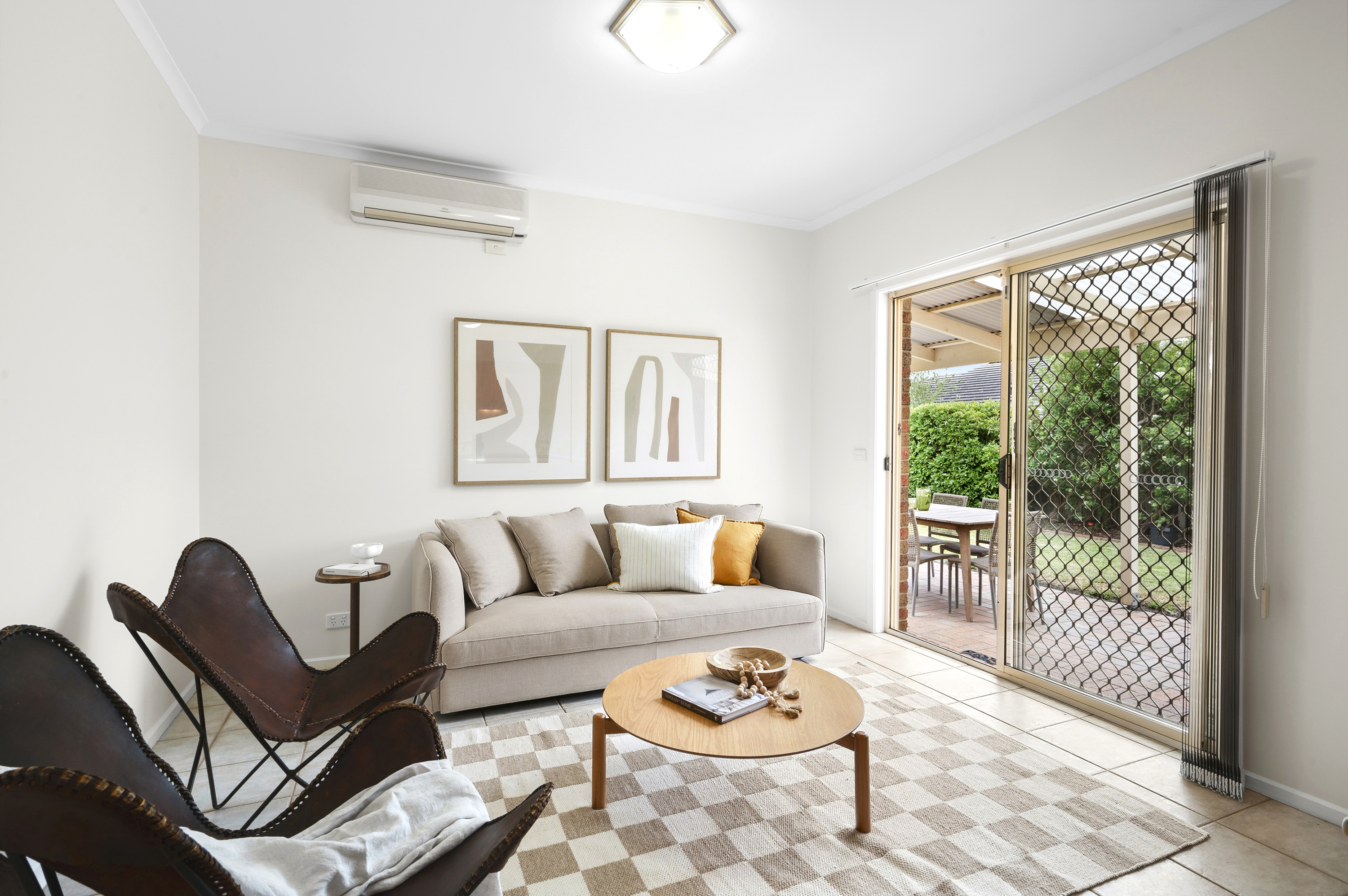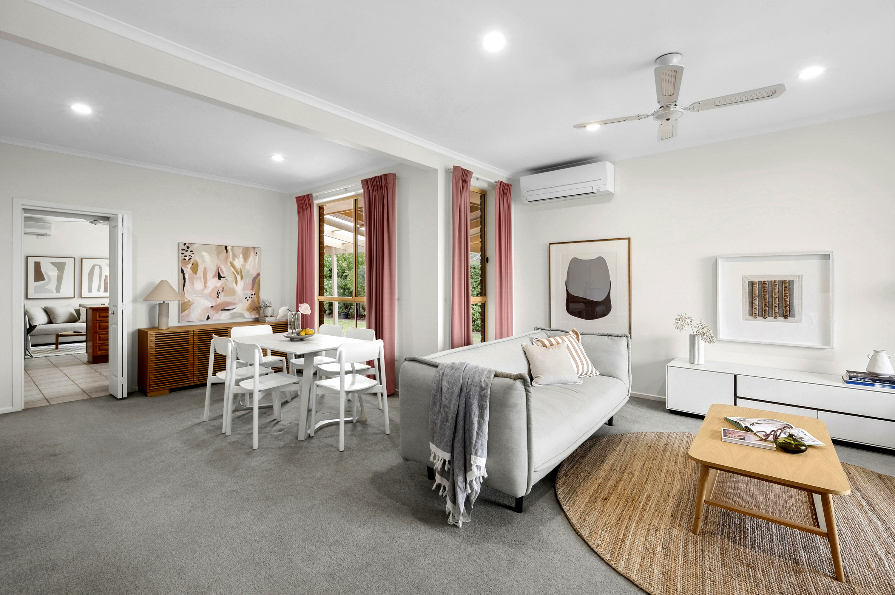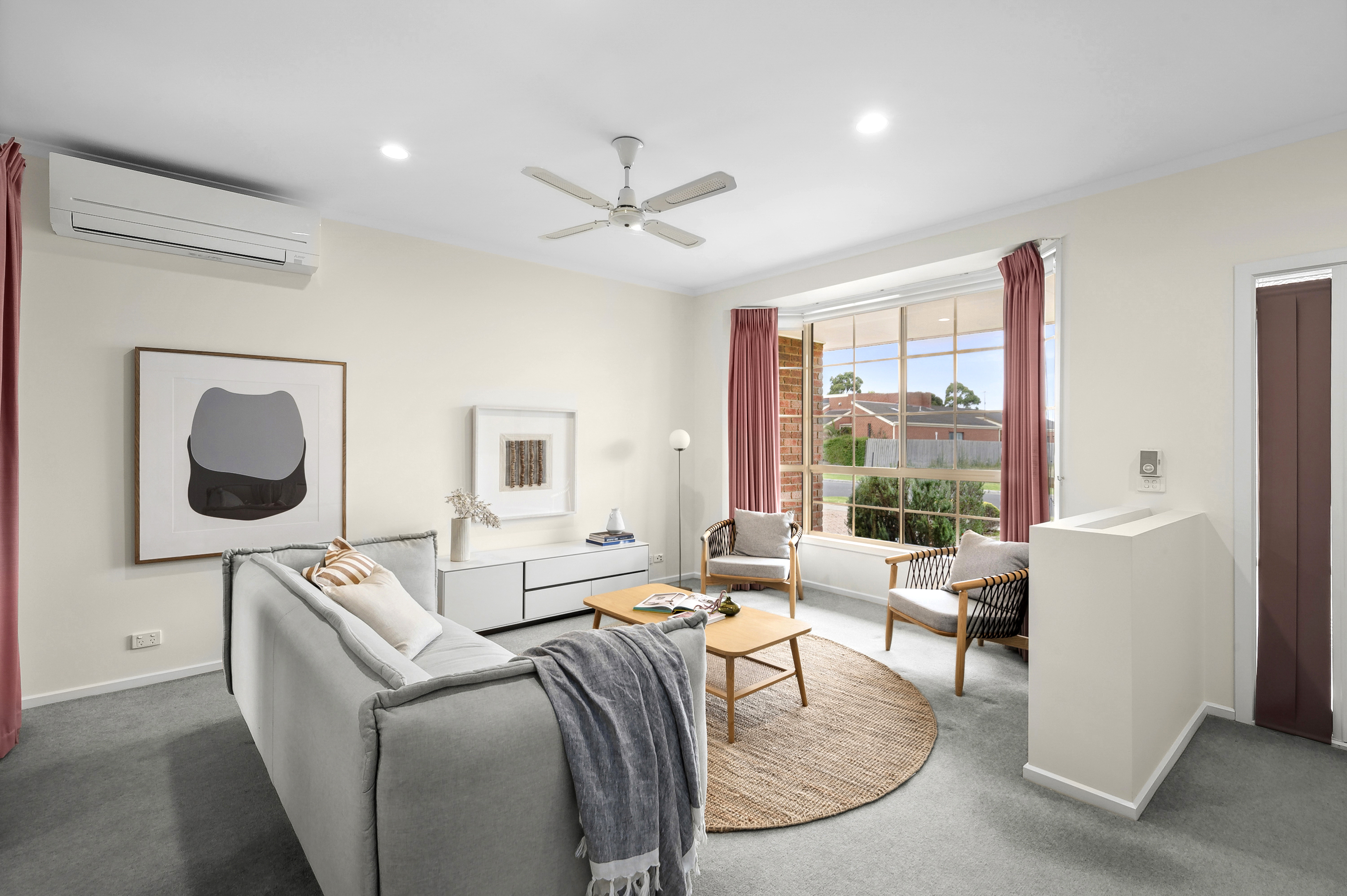 At the heart of the home, the timber kitchen is both practical and welcoming, boasting electric cooking, a dishwasher, and ample cupboard space. Split-system heating and cooling ensure year-round comfort, while large windows fill the home with natural light.
