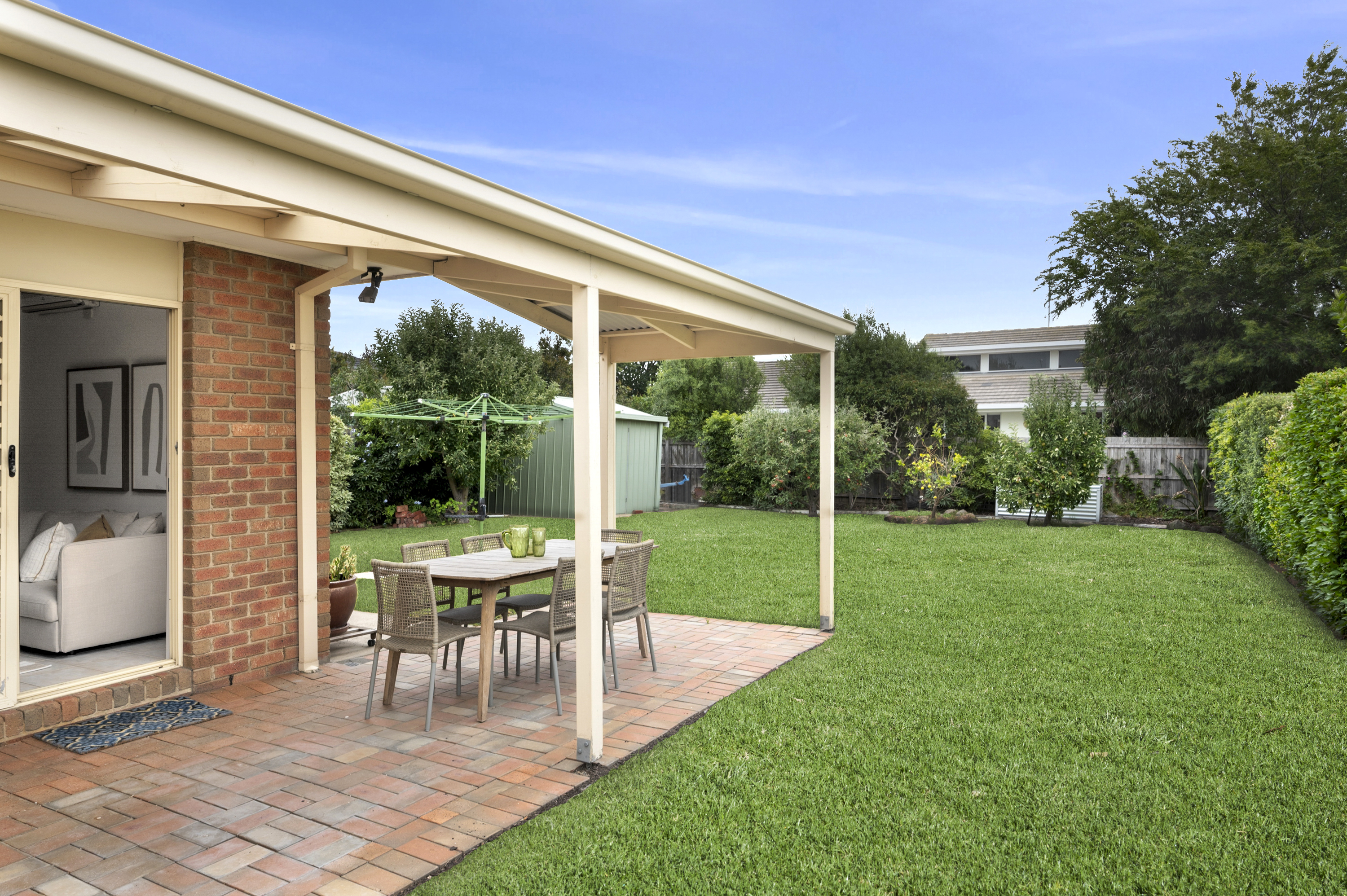 Step outside to an inviting undercover entertaining area, perfect for hosting gatherings, overlooking a spacious backyard for the kids to play. A garden shed provides extra storage, while the double lock-up garage offers secure parking.