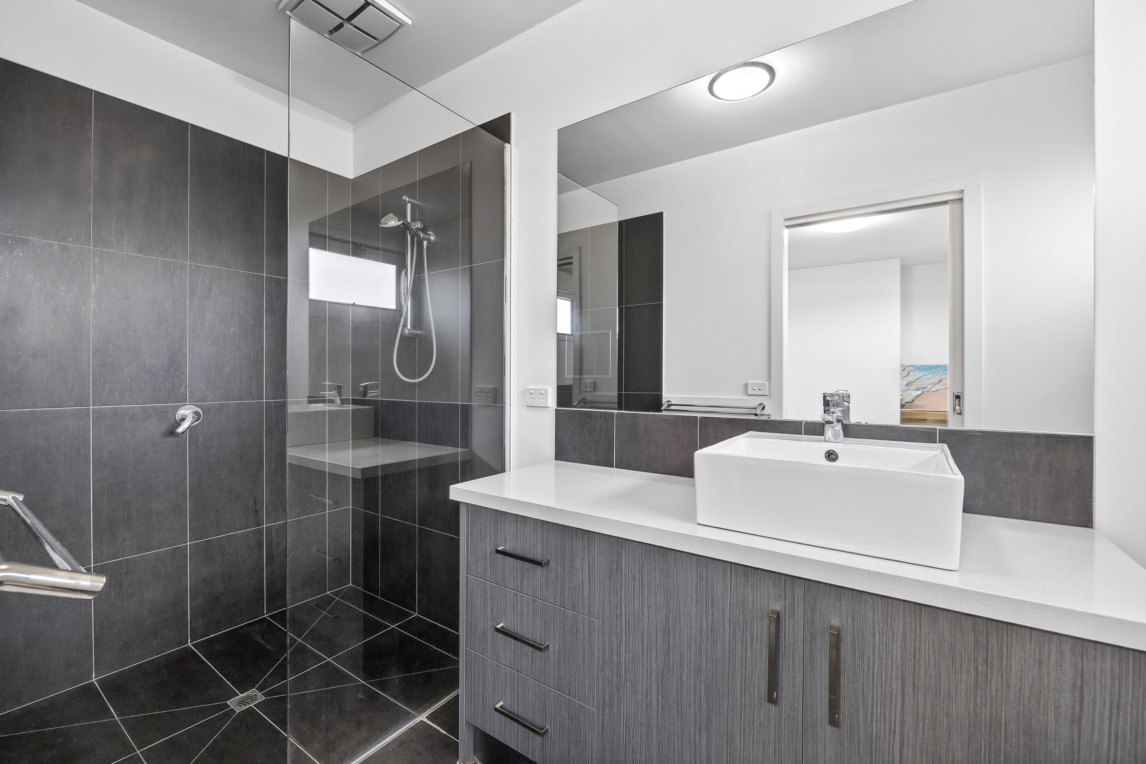Designed with functionality in mind, the home offers three well-appointed bedrooms. The private master suite is located upstairs, creating a peaceful retreat away from the rest of the home, and features a walk-in robe and stylish ensuite. Downstairs, the remaining two bedrooms include built-in robes and are serviced by a central bathroom with a built-in bath and separate toilet, perfect for families or shared living.