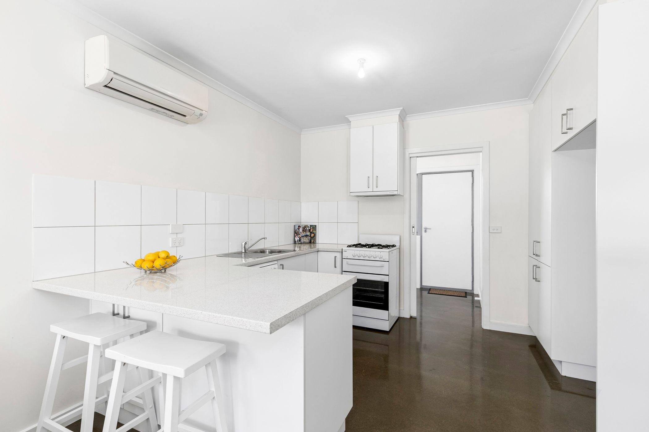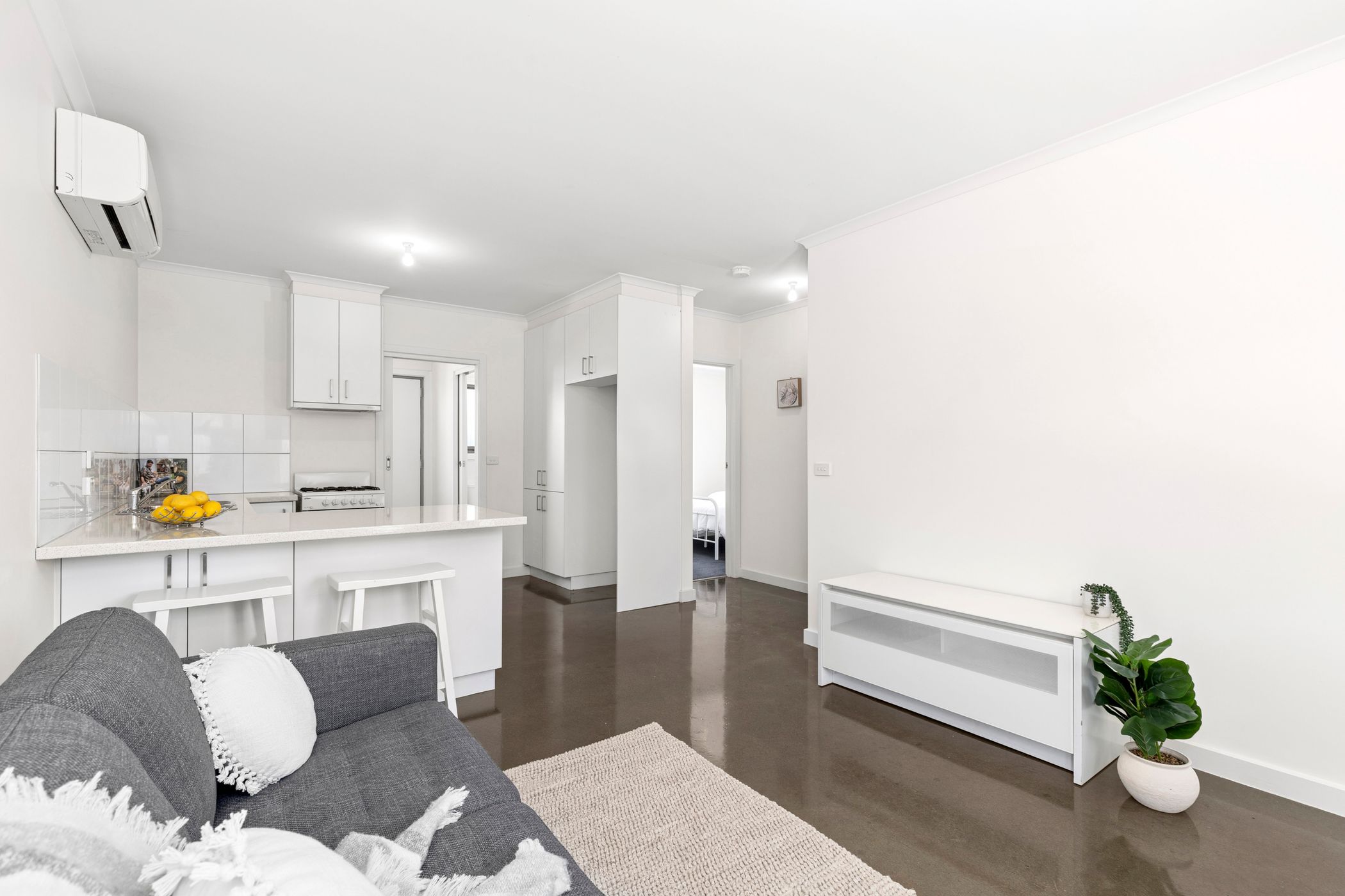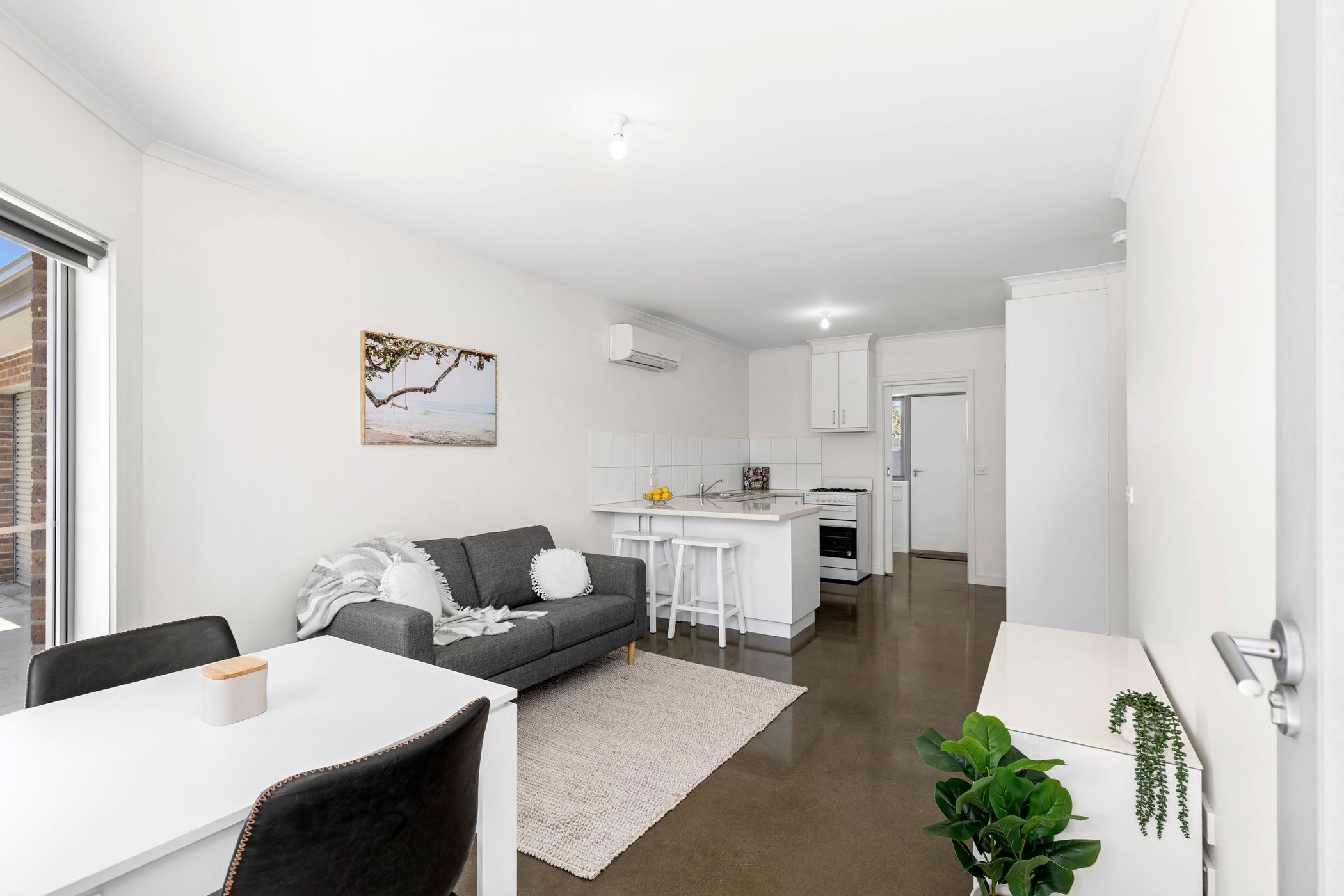 Step into the open-plan living, kitchen and dining area where polished concrete floors and fresh paint create a contemporary, inviting feel. The modern kitchen is equipped with a freestanding Chef oven and gas cooktop, Dishlex dishwasher and a built-in pantry, while the handy breakfast bar is suited to casual meals.