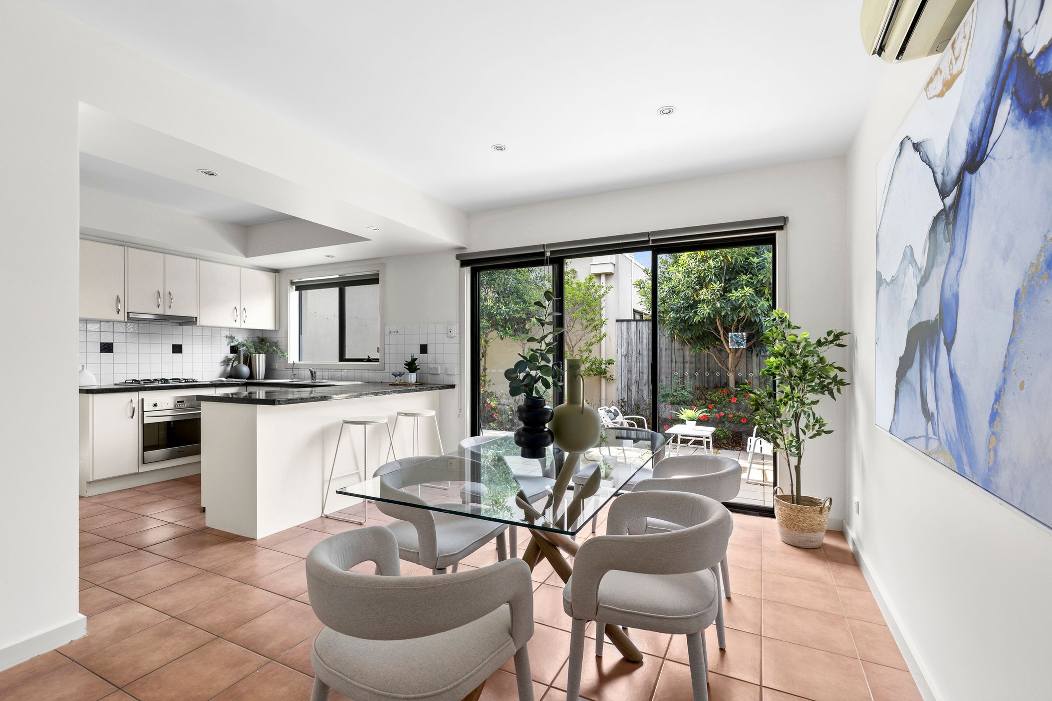 The central kitchen is both functional and inviting, complete with quality appliances, dishwasher and pantry, overlooking a fully tiled meals area that flows to a private north-facing courtyard-perfectly positioned to capture natural light throughout the day and create a warm, inviting space for entertaining or quiet retreat.
