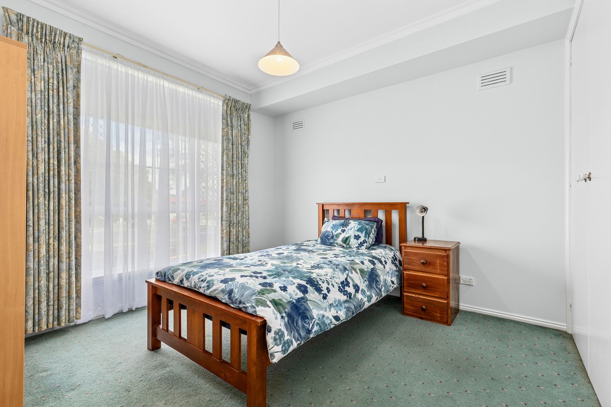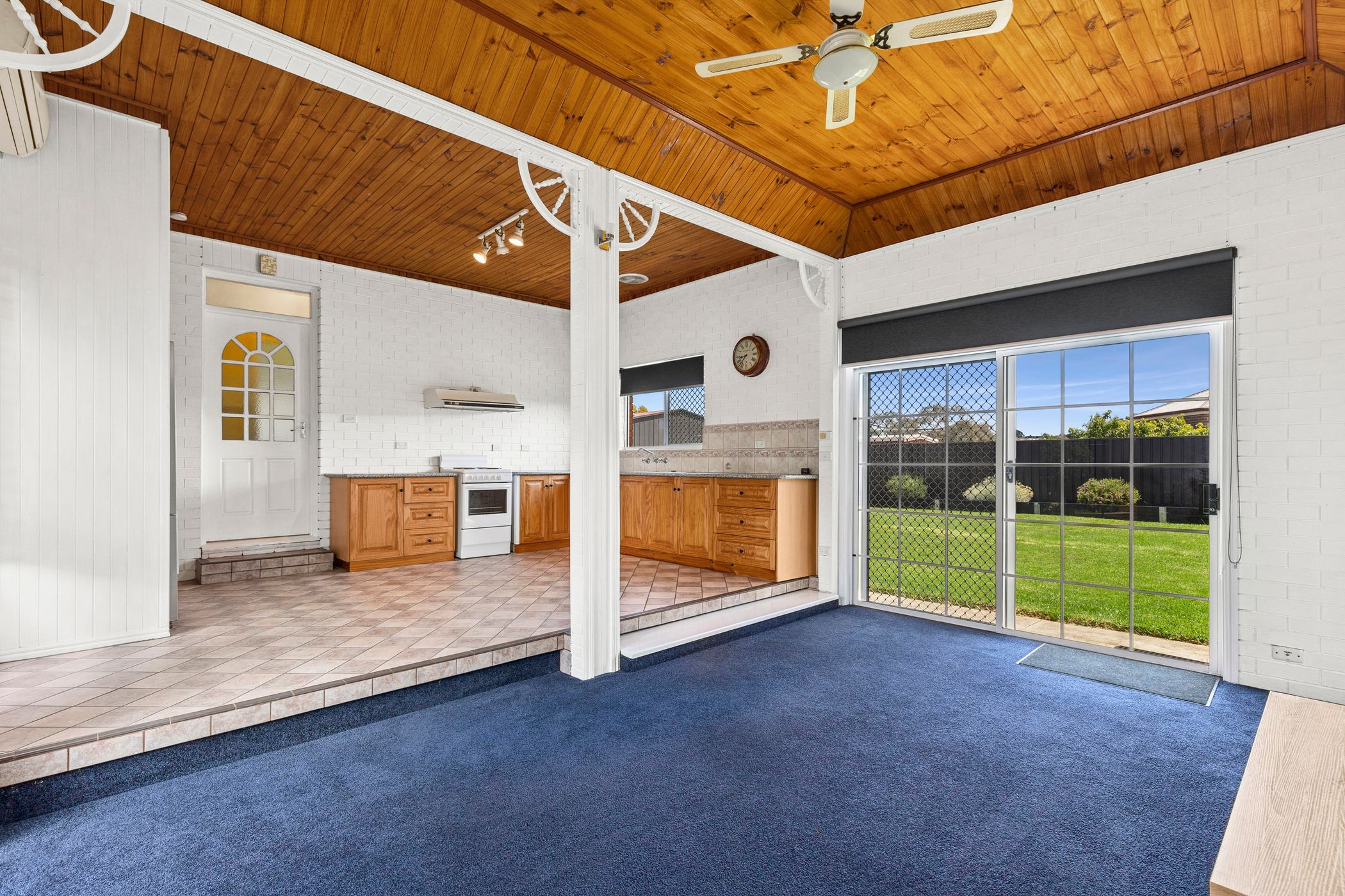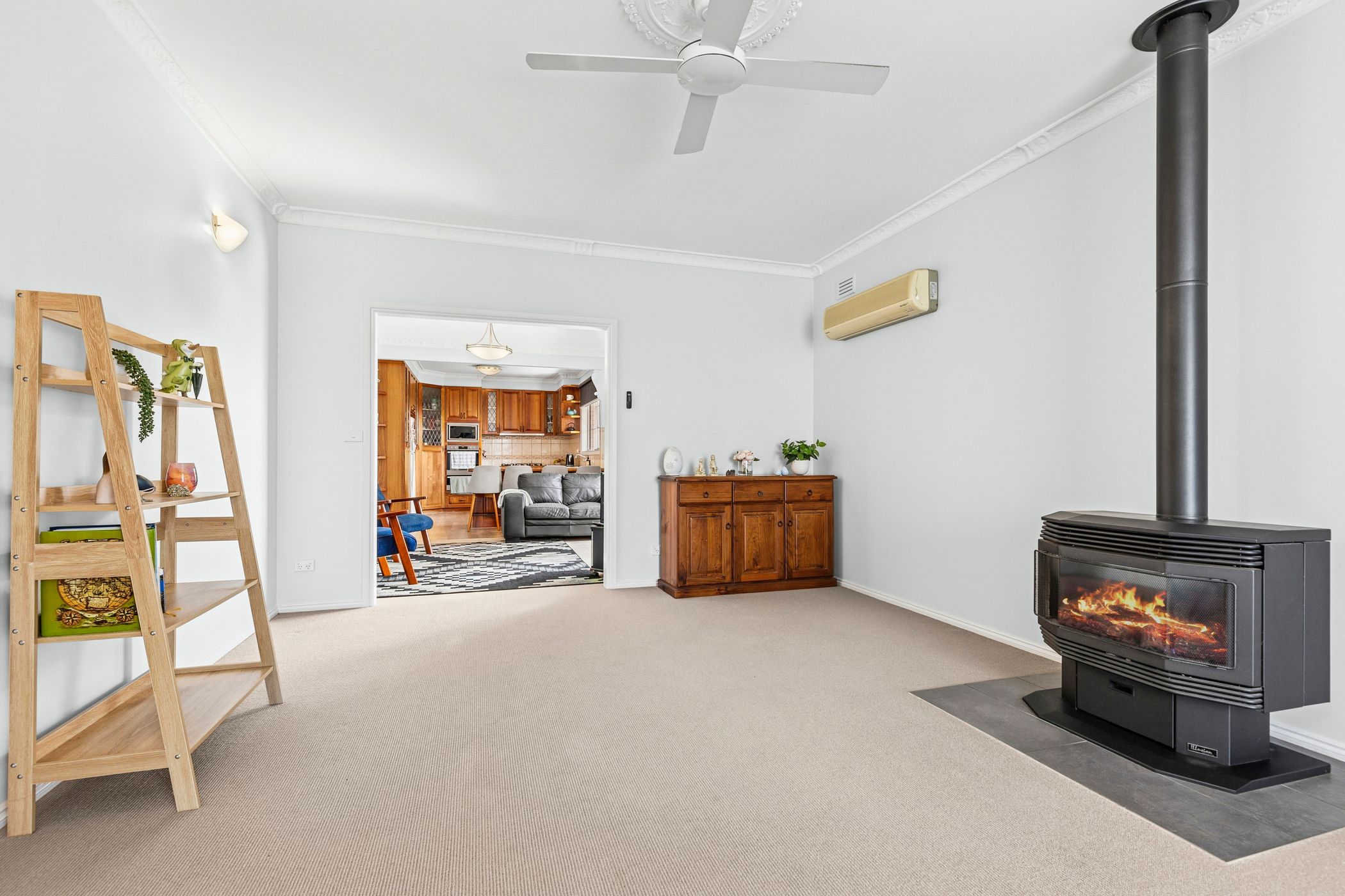 A spacious front lounge welcomes you with a cosy gas log fire, creating a warm and inviting place to unwind. The adjoining kitchen/dining/living area enjoys abundant natural light and opens out to a north-facing courtyard - the perfect spot to enjoy a coffee or relaxed outdoor living. Rich timber cabinetry, stainless steel cooking appliances and plentiful storage ensure the kitchen is both functional and full of character.