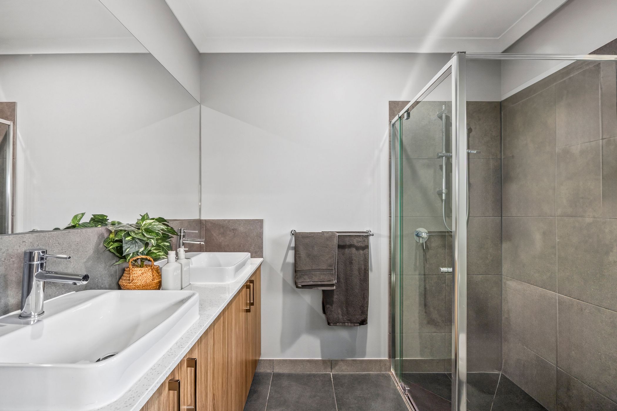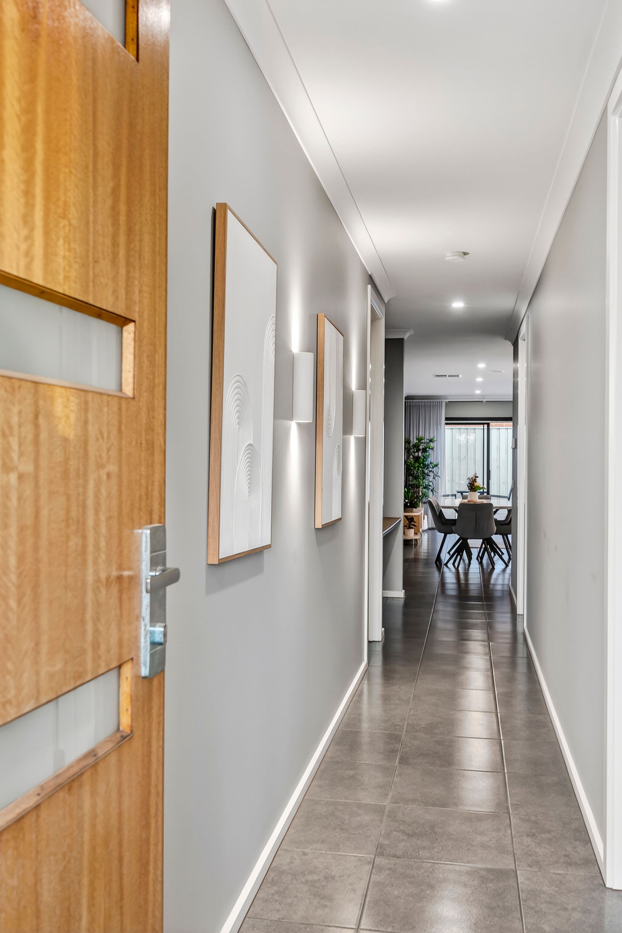 Positioned at the front of the home, the main bedroom offers a walk-in robe and private ensuite. Three additional bedrooms, all with built-in robes, are serviced by the central bathroom, while a full-sized laundry enhances the practical layout. Both bathrooms are enhanced with stylish feature strip lighting, creating a refined, hotel-inspired feel. A dedicated E-zone study nook comfortably caters to work-from-home needs.