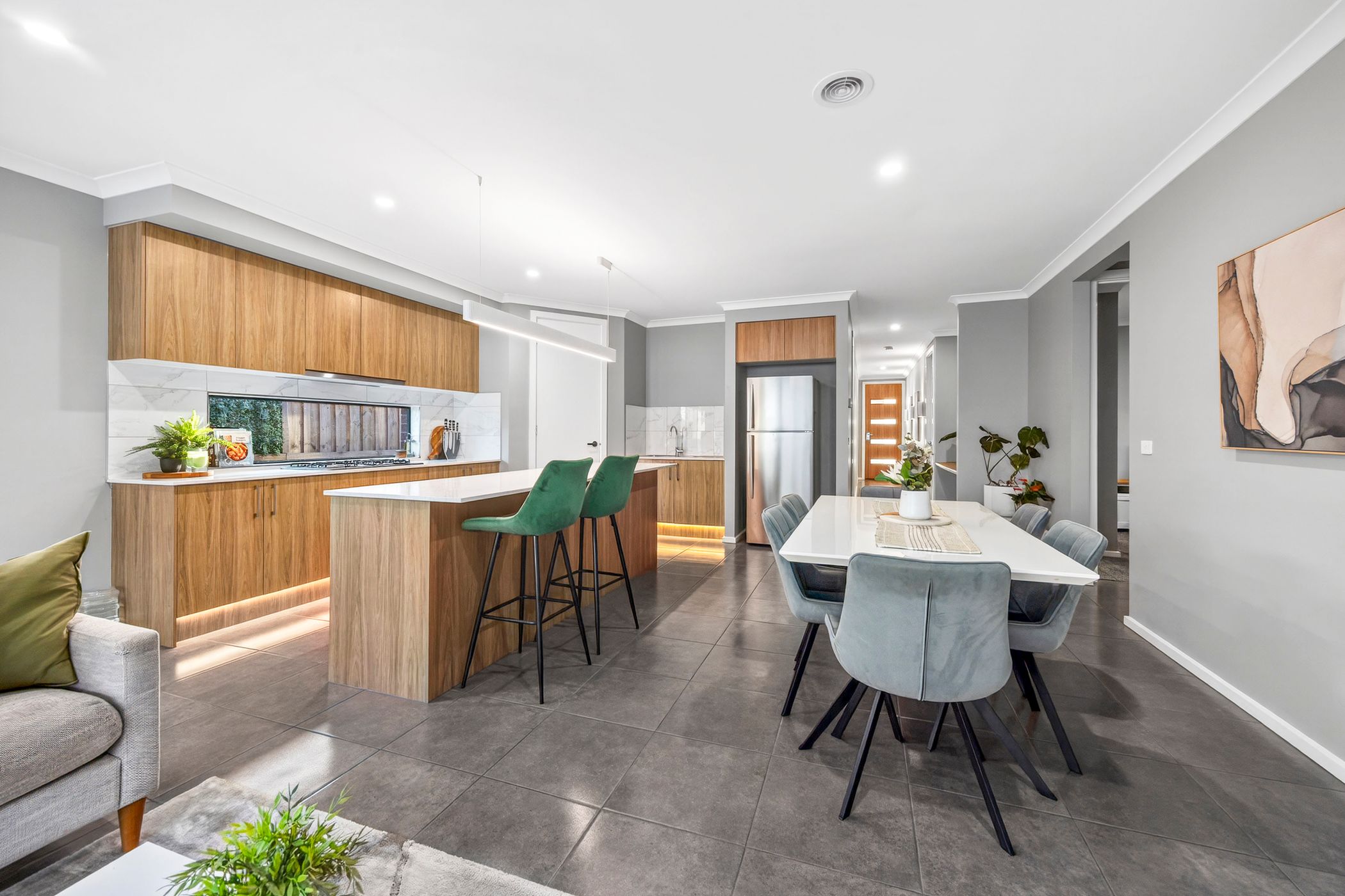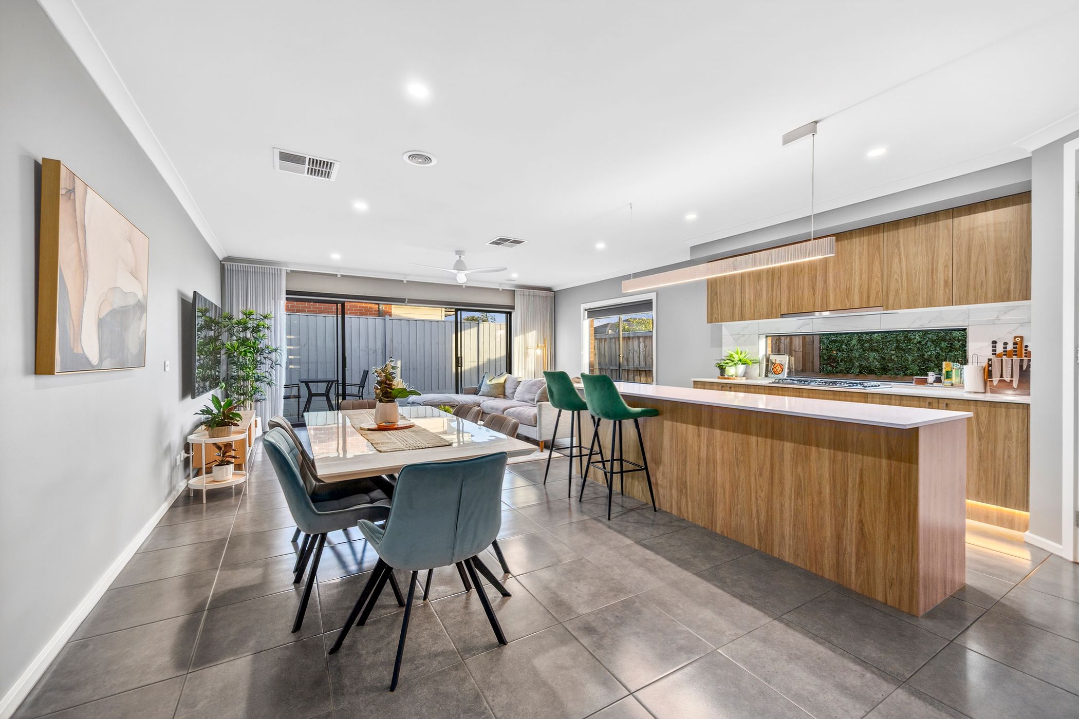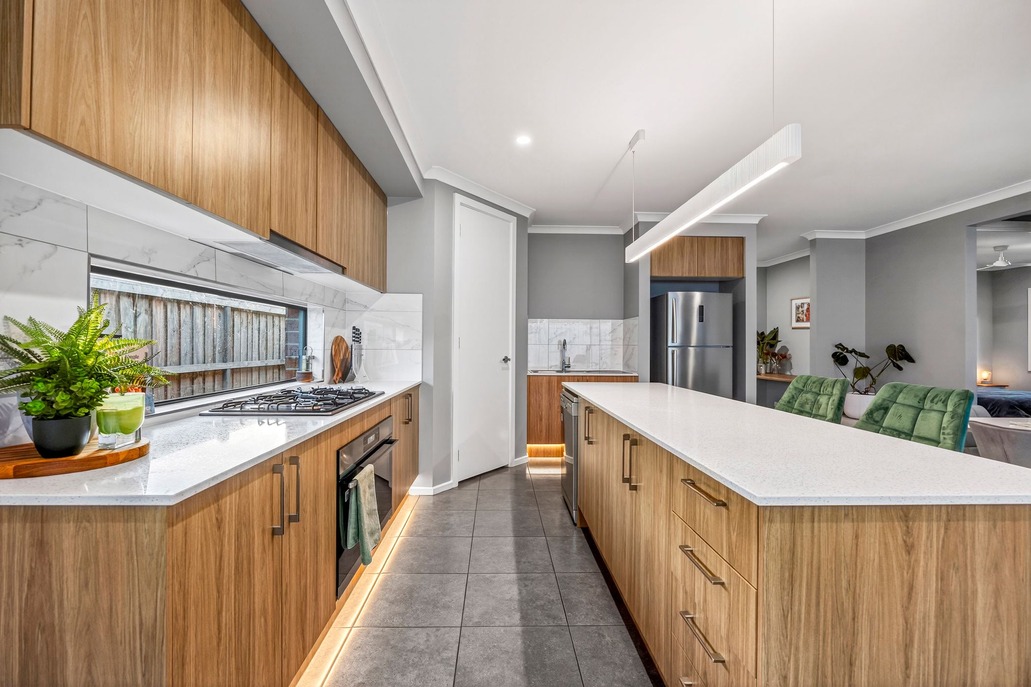 Bathed in natural light, the flawless interiors create a light and airy ambience throughout. The open-plan living, dining and kitchen zone forms a calm and inviting heart of the home, ideal for everyday living and entertaining. The generous kitchen is a standout, featuring a walk-in pantry, quality stainless-steel appliances (oven, gas cooktop, rangehood and dishwasher), ample bench space to suit a growing family, and feature strip lighting that adds a sleek, modern finish while enhancing both functionality and atmosphere.