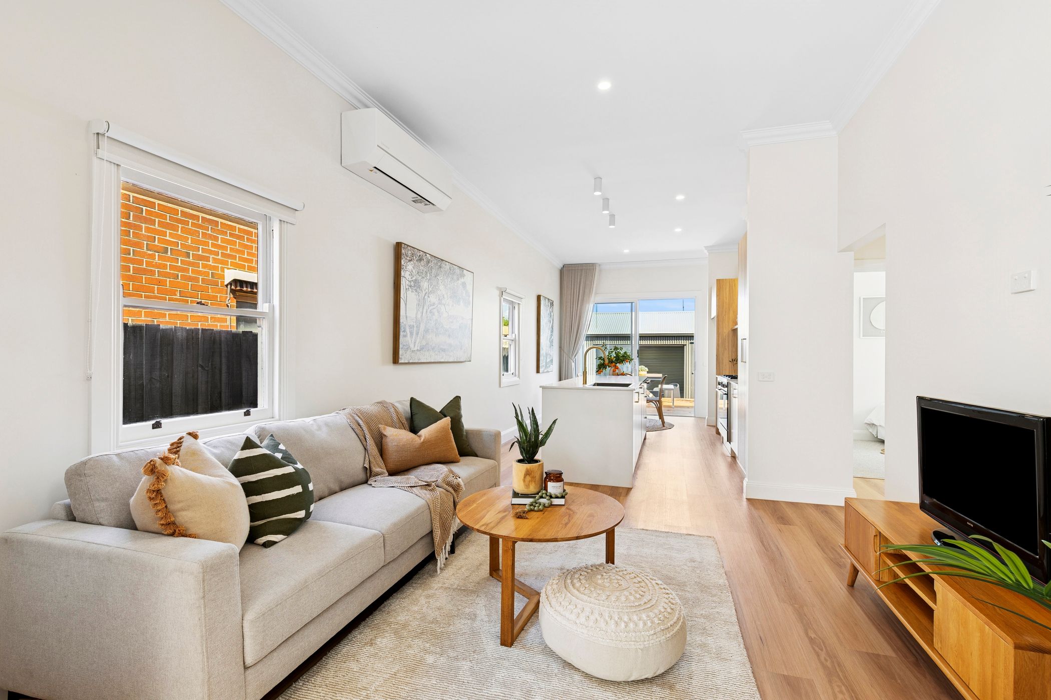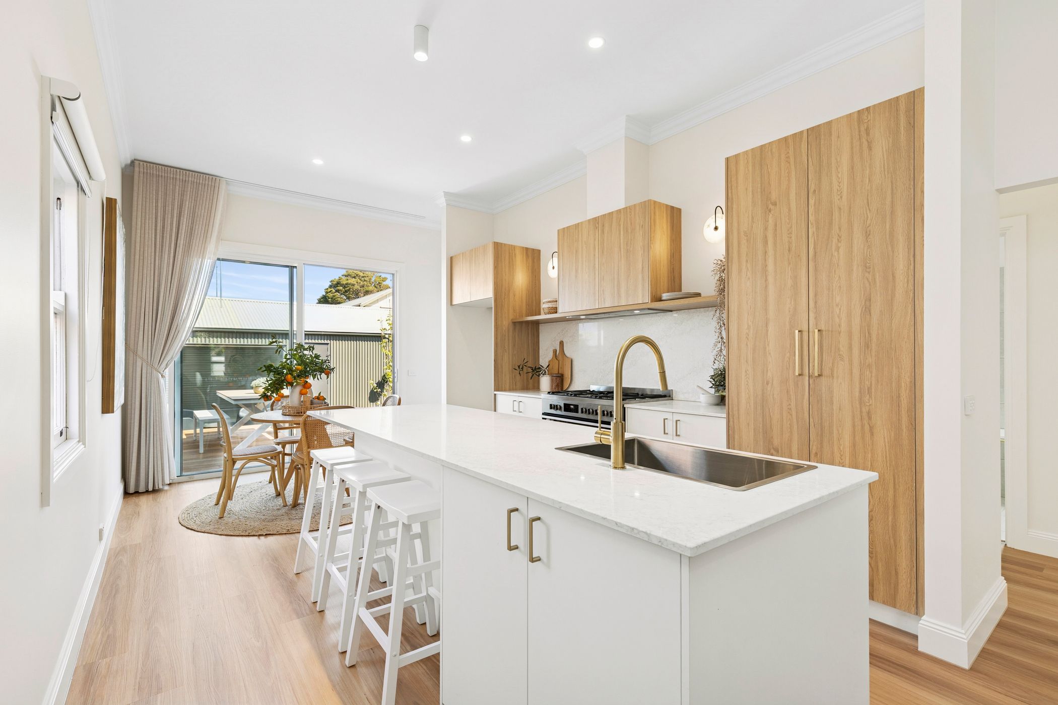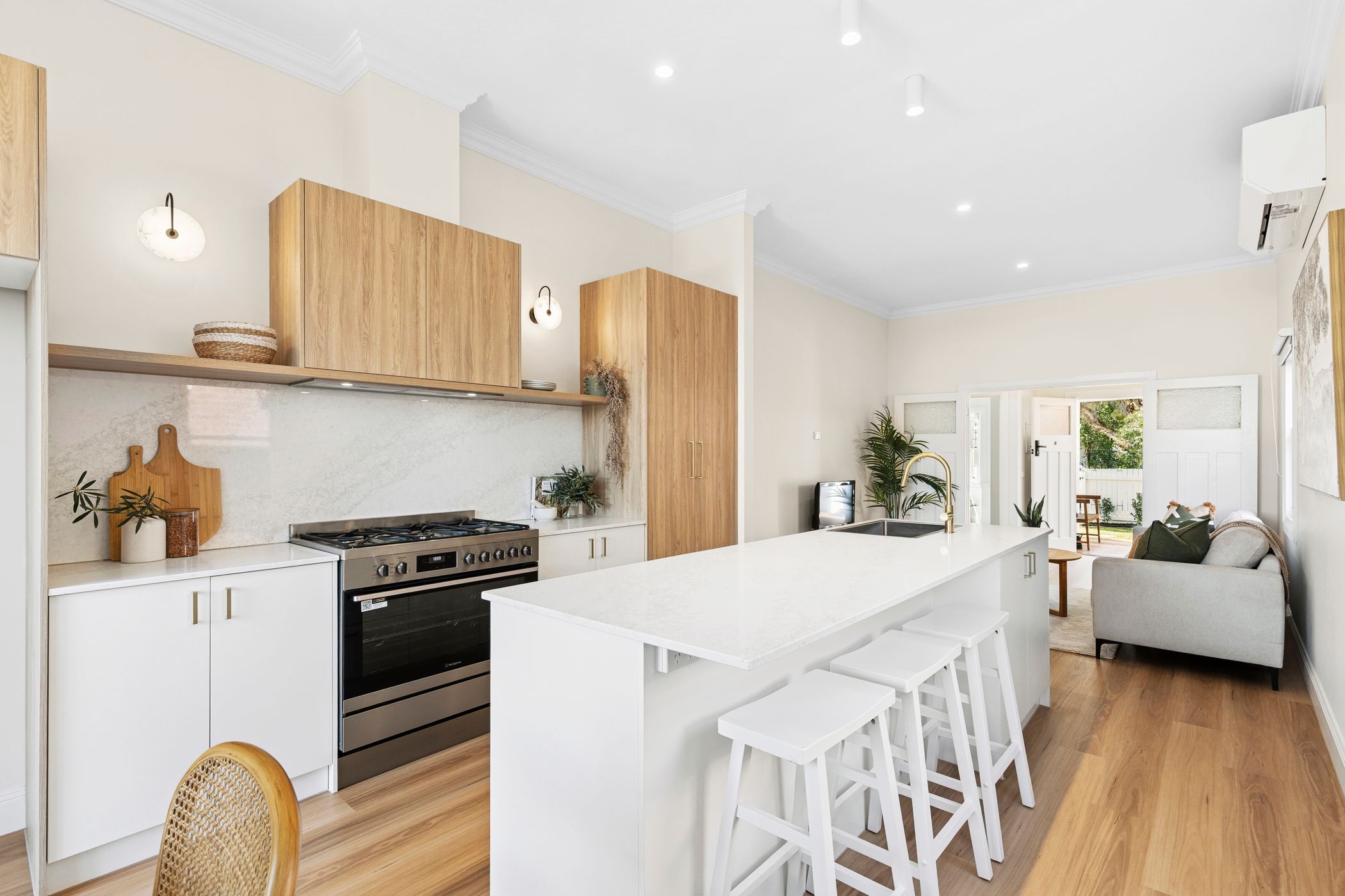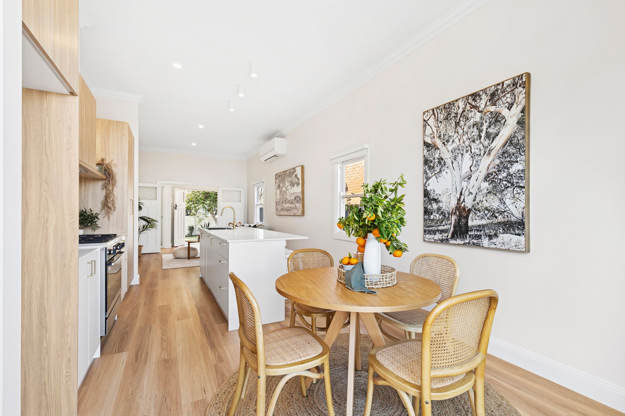 From the moment you step inside, soaring ceilings, blonde-hued timber floors and soft linen curtains create a serene, refined atmosphere. Natural light streams through original sash windows, illuminating the open-plan living, dining and kitchen space designed for connection and ease. Dual aspects invite cross-flow breezes and effortless transition to the outdoors, whether it's morning coffee in the sun-drenched front garden, alfresco dining on the private rear deck, or evenings by the firepit after the sun fades.