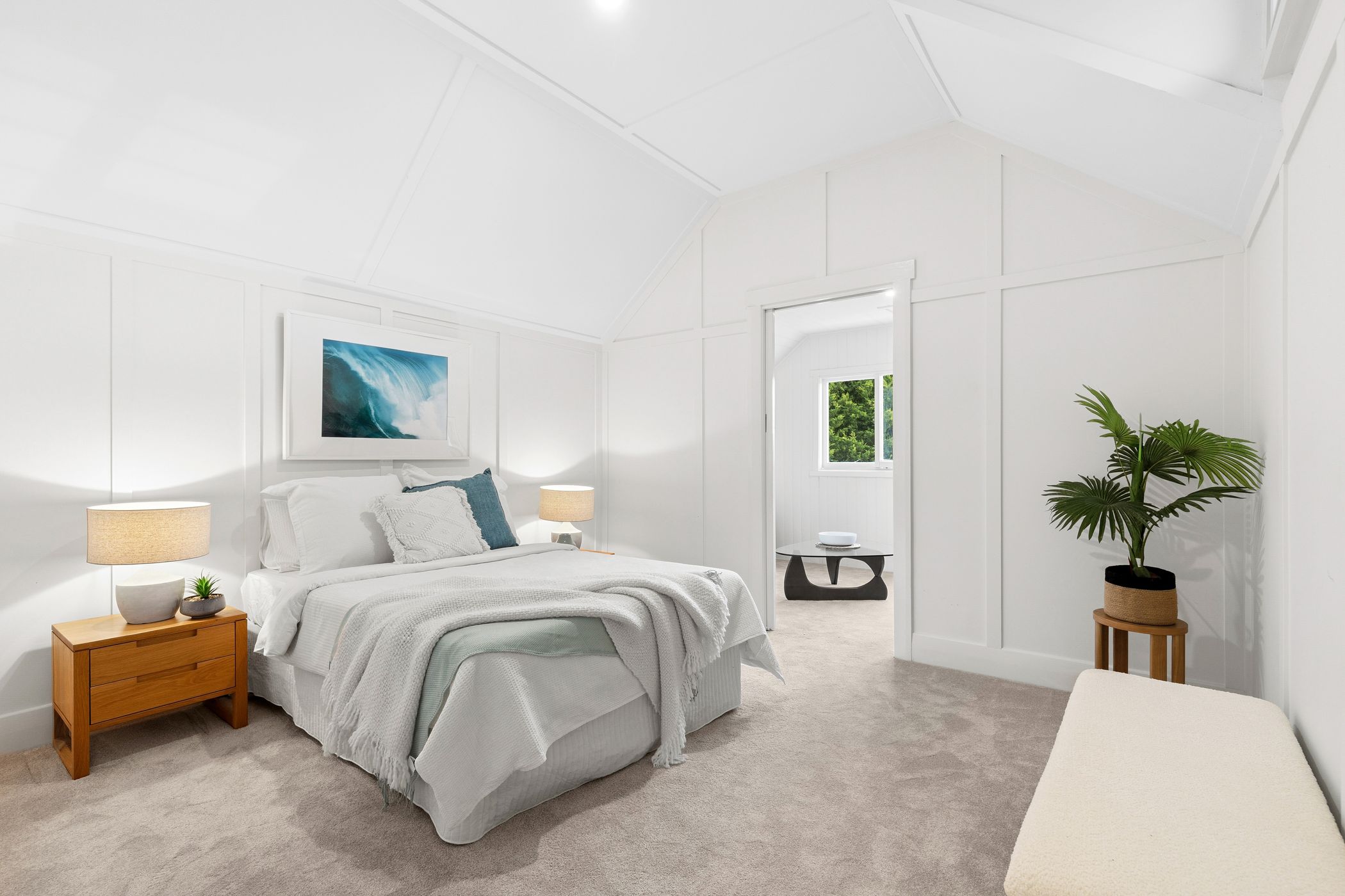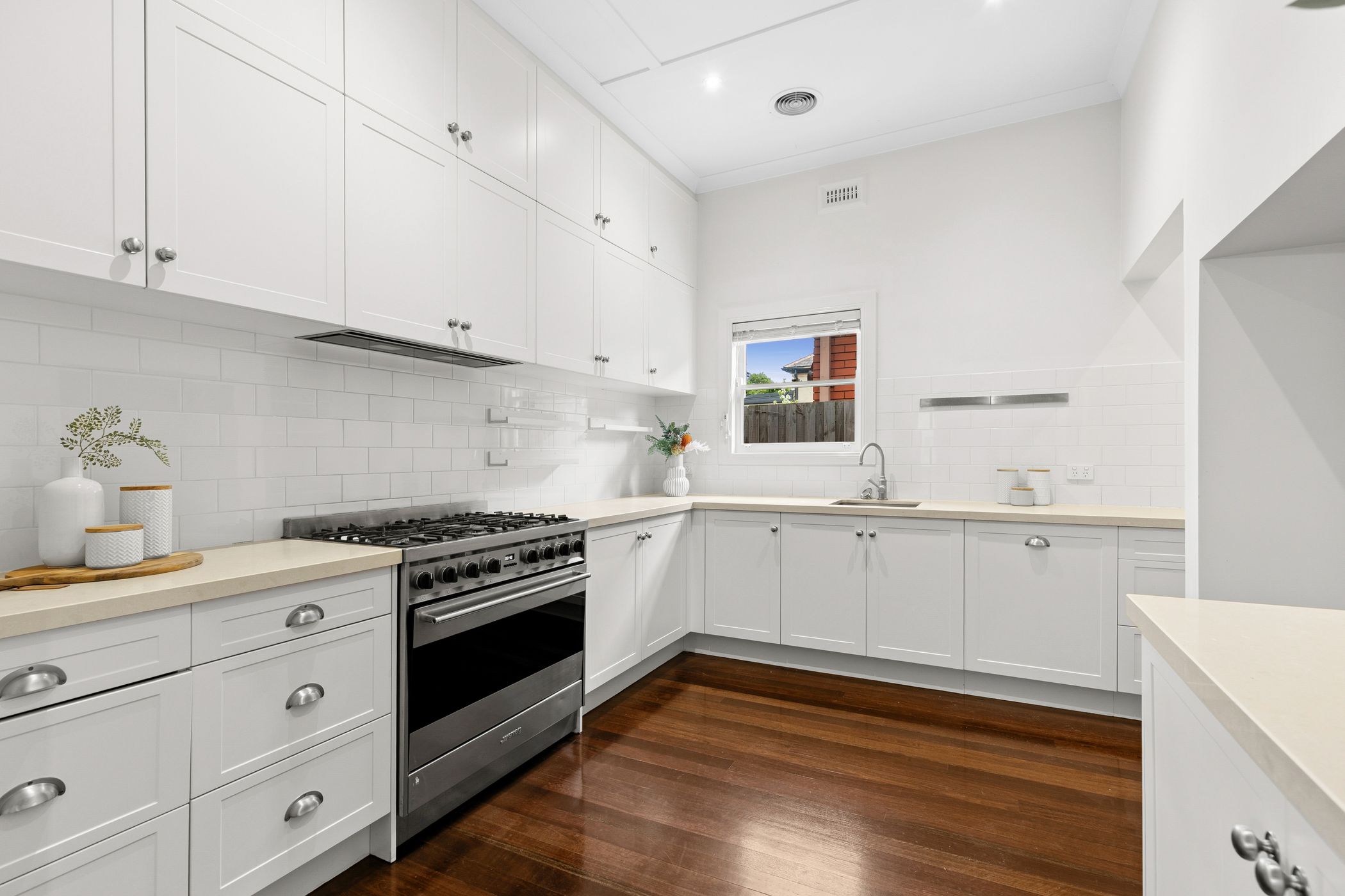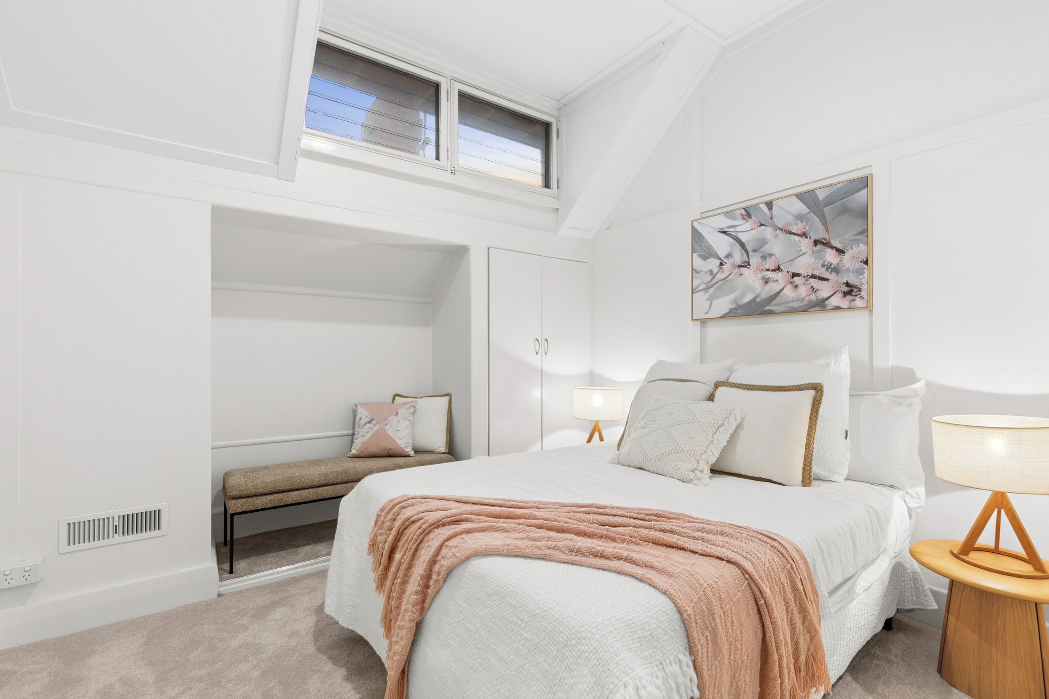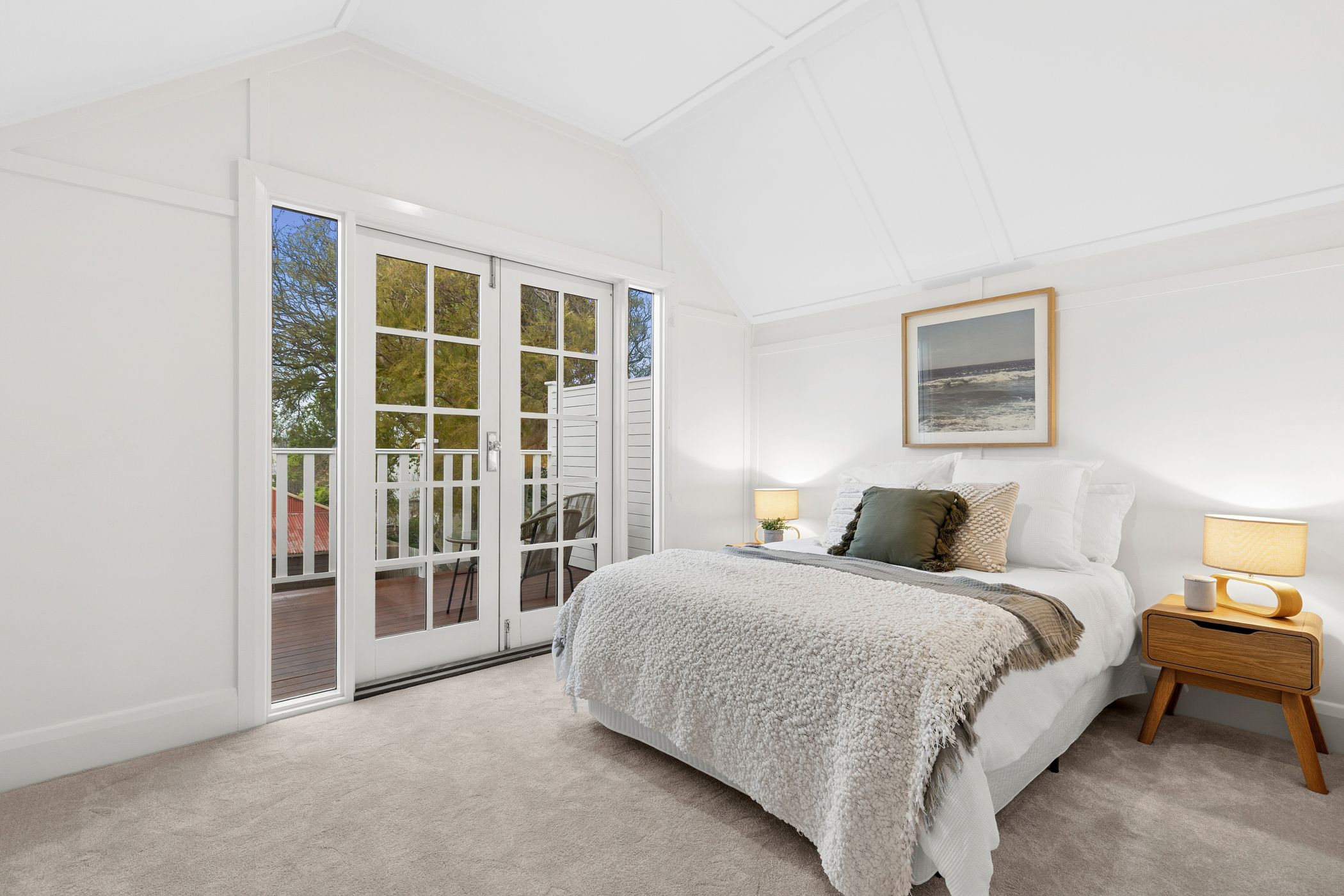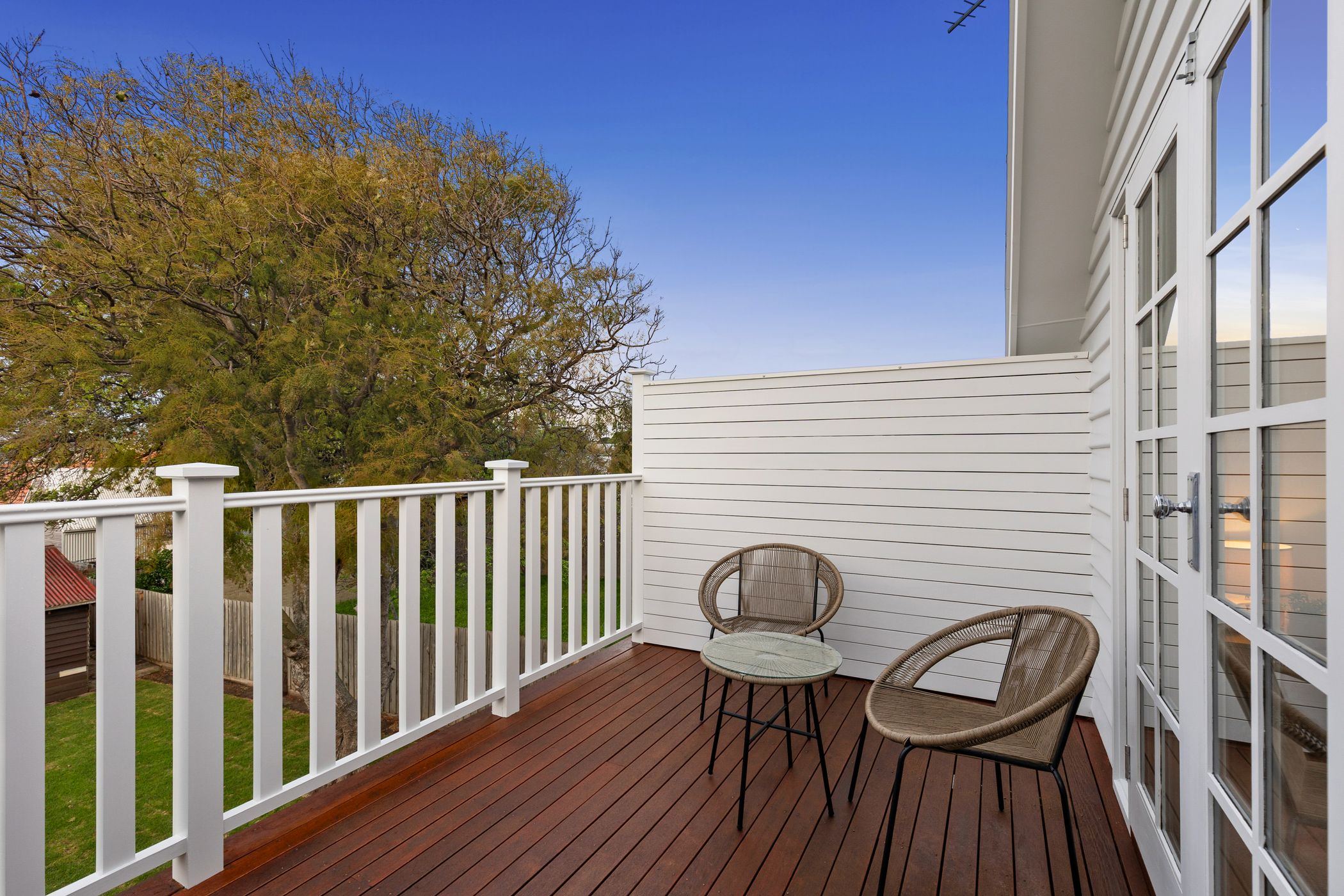 The updated kitchen combines classic style with modern convenience, featuring stone benchtops, a freestanding Smeg oven with gas cooktop and abundant storage, ideal for entertaining or relaxed family meals. Two downstairs bedrooms connect with the sun drenched north facing backyard, timber alfresco deck and lush turf, centered by a mature shade tree. Upstairs, a storybook staircase leads to three further bedrooms with pitched ceilings and louvre windows, one with a private balcony capturing treetop breezes and a sunny aspect.