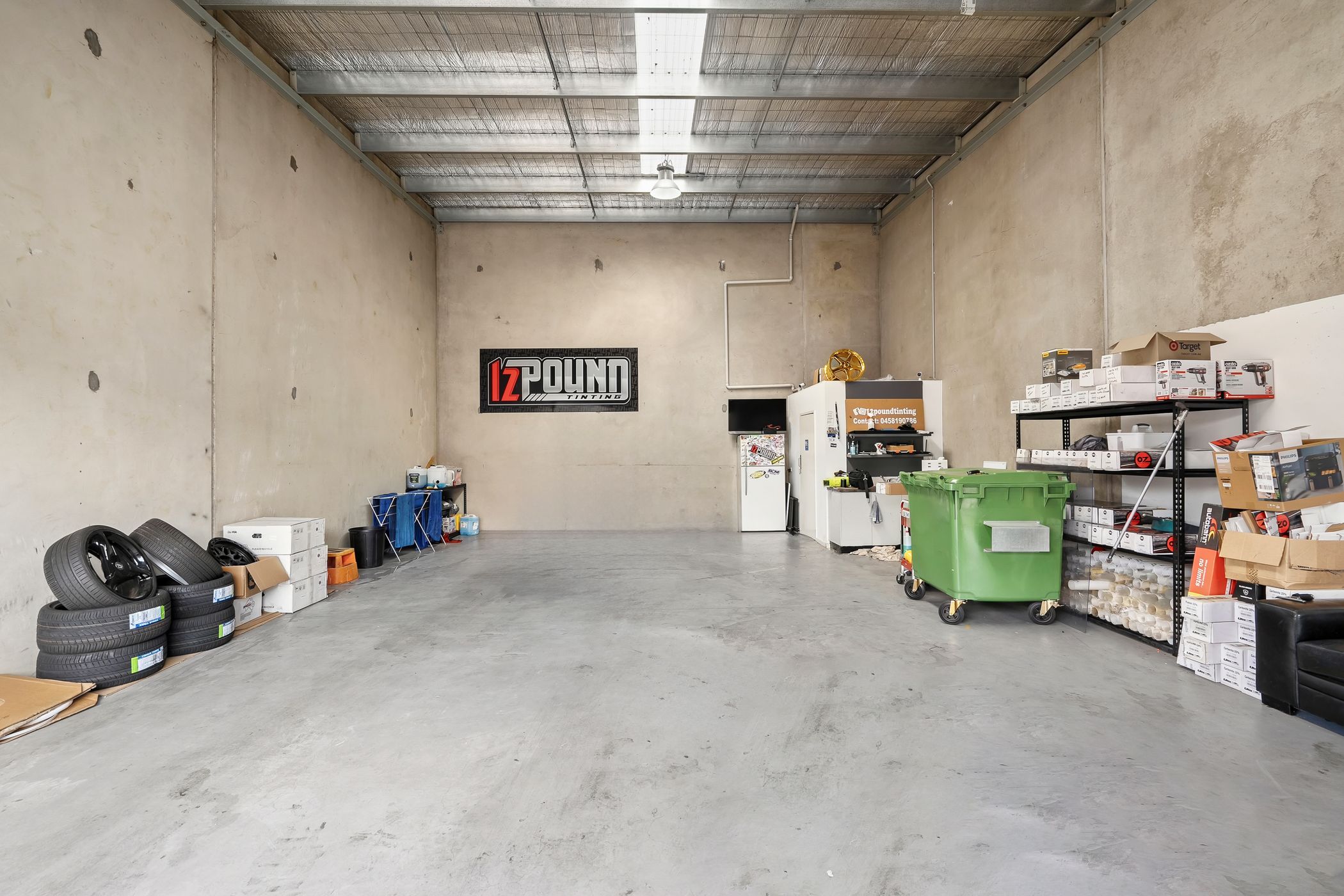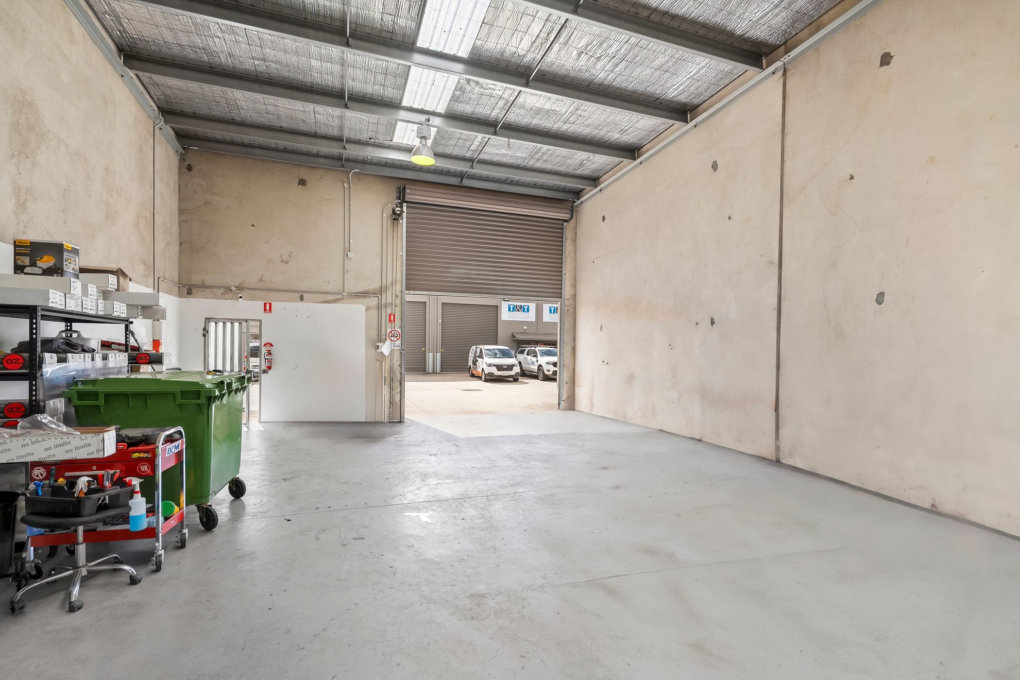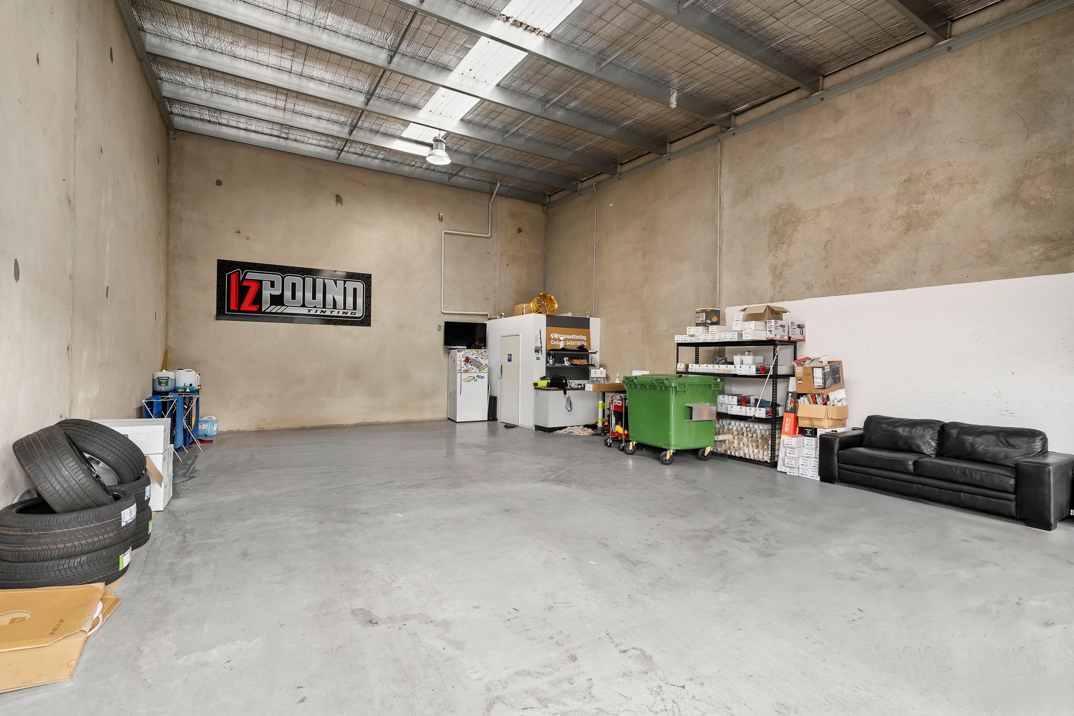 The property features a 4.5m electric roller door for high-clearance access, a dedicated pedestrian entrance, and the essential utility of three-phase power. Internal amenities include a private kitchenette and toilet facilities, ensuring the unit is fully self-contained.
