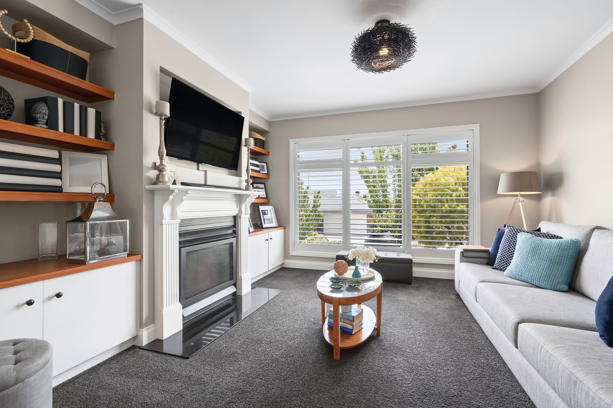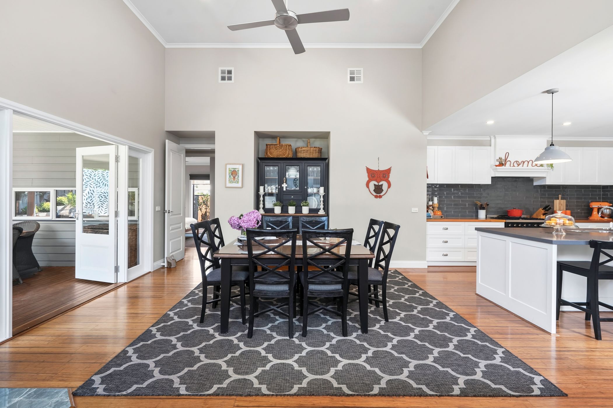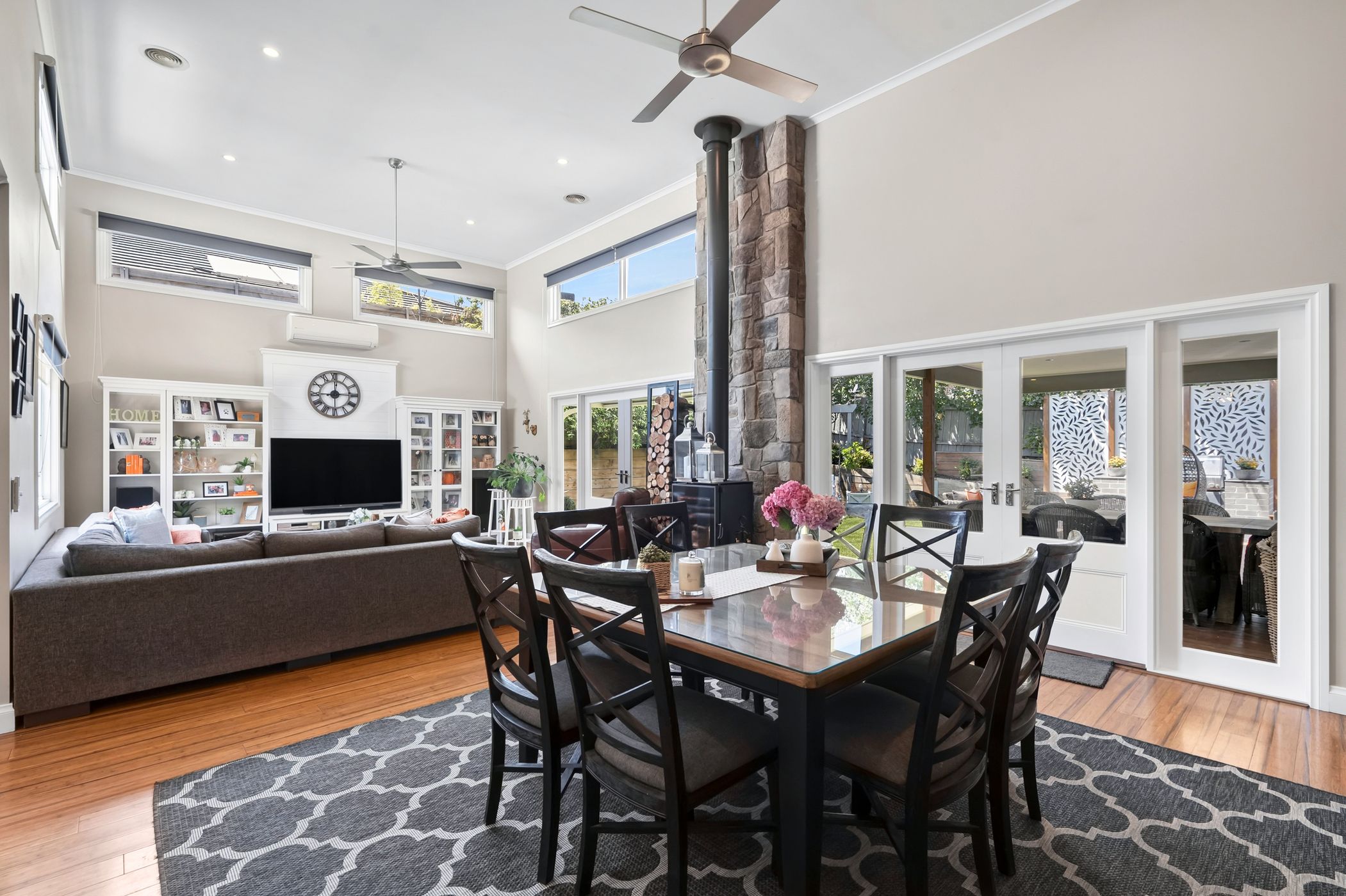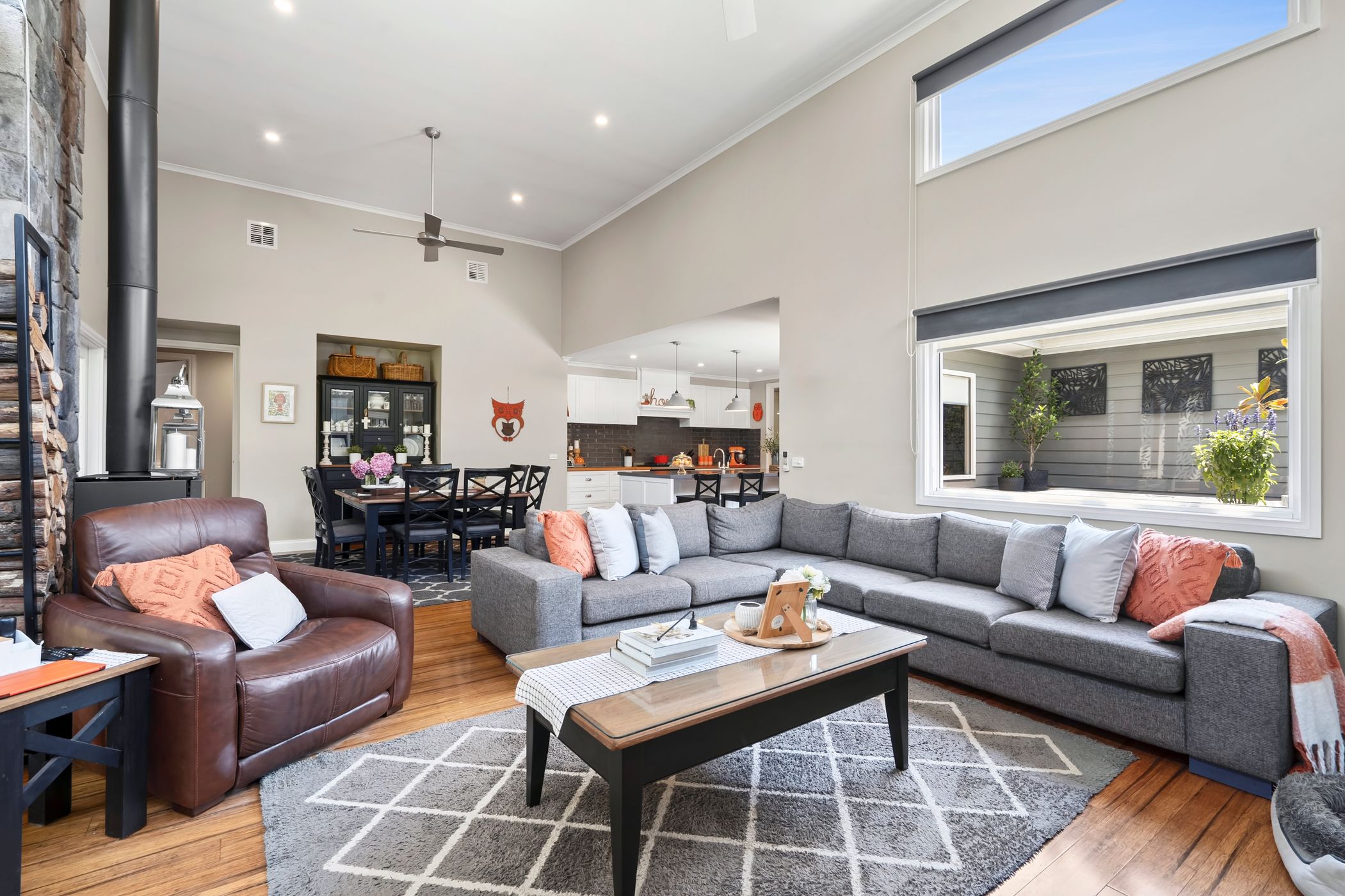 Warm timber flooring and calming neutral tones create a cohesive sense of elegance throughout the interiors. At the heart of the home, expansive open-plan living is highlighted by soaring 4.2-metre ceilings, a striking stone feature wall and cosy wood heater, providing a welcoming setting for everyday living and memorable gatherings alike. A separate formal lounge offers a peaceful retreat, enhanced by a gas log fireplace - ideal for relaxed evenings. Designed to bring people together, the gourmet kitchen features an oversized island with breakfast seating, statement pendant lighting, quality appliances and a generous butler's pantry, ensuring both style and functionality are seamlessly combined.