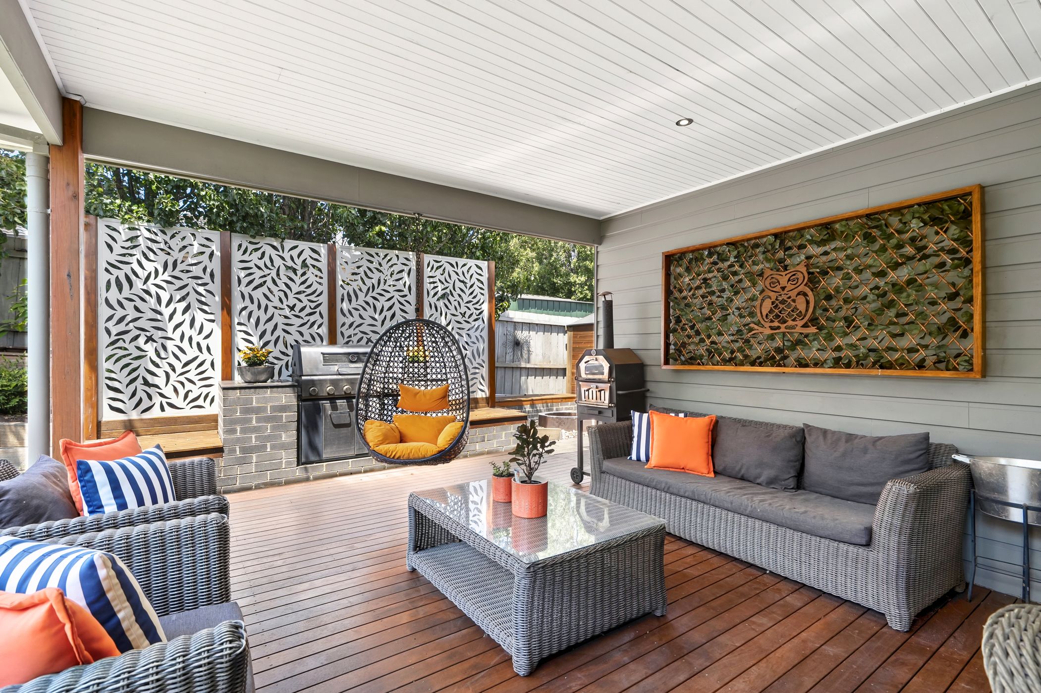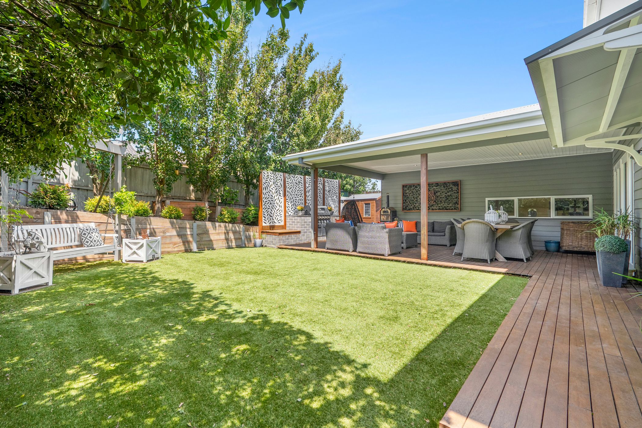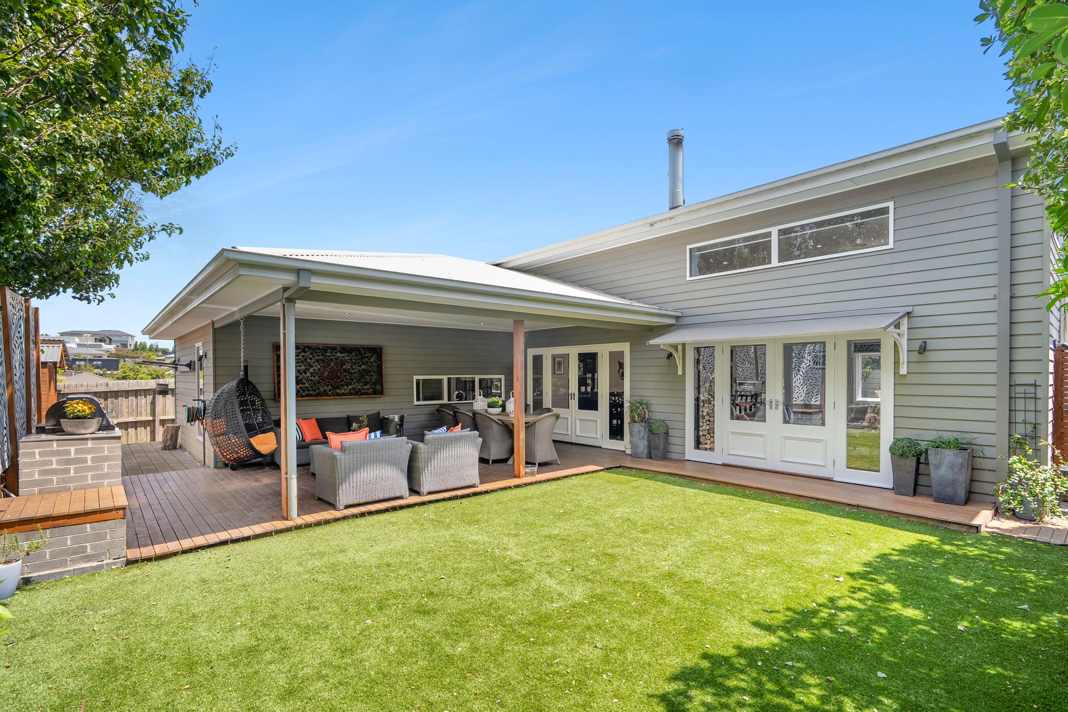 French doors open to an impressive covered alfresco deck, complete with a built-in BBQ and dedicated fire pit zone - perfect for entertaining in every season. Low-maintenance gardens with synthetic turf, established trees and a luxurious six-person spa further enhance the outdoor appeal. An oversized remote double garage provides excellent storage and convenient internal access.