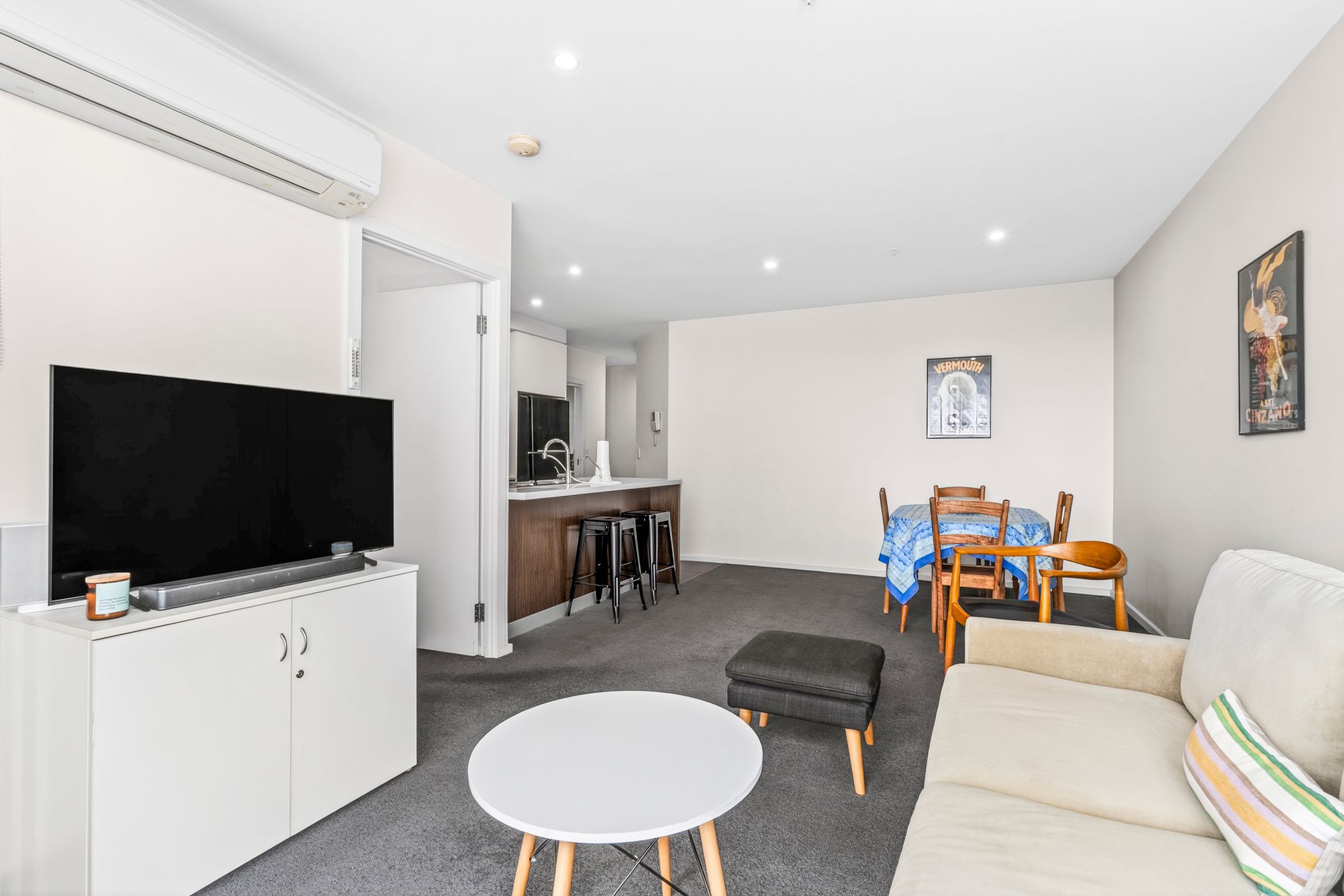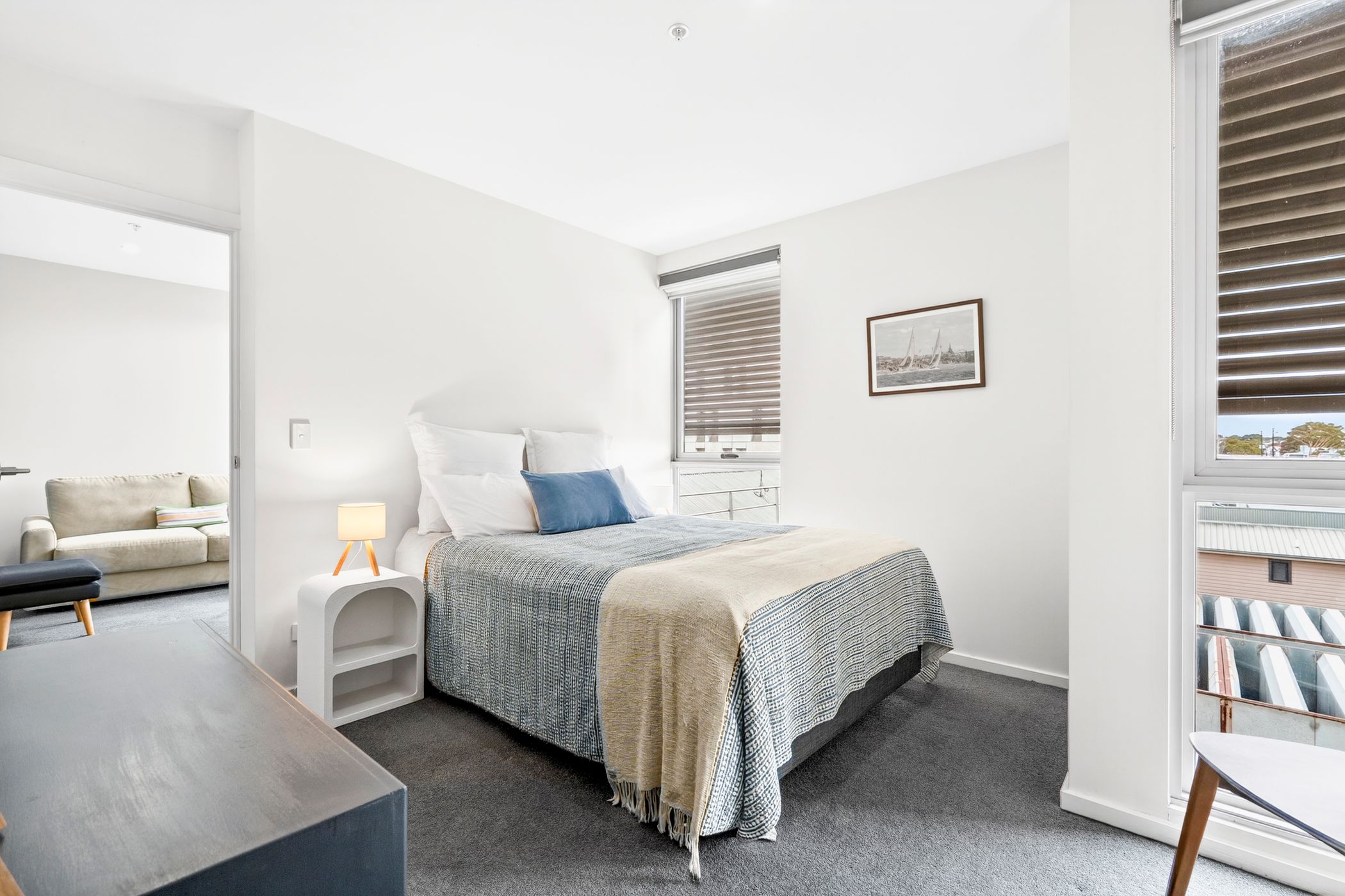 Designed with clean architectural lines, the interiors feature square-set ceilings and tiled flooring throughout the main living zone, enhancing the apartment's modern aesthetic. The open-plan living, dining and kitchen area flows seamlessly onto a private balcony - perfect for morning coffee or unwinding at day's end. The contemporary kitchen balances style and everyday functionality, equipped with stone benchtops, stainless steel appliances, a built-in pantry and a breakfast bar.