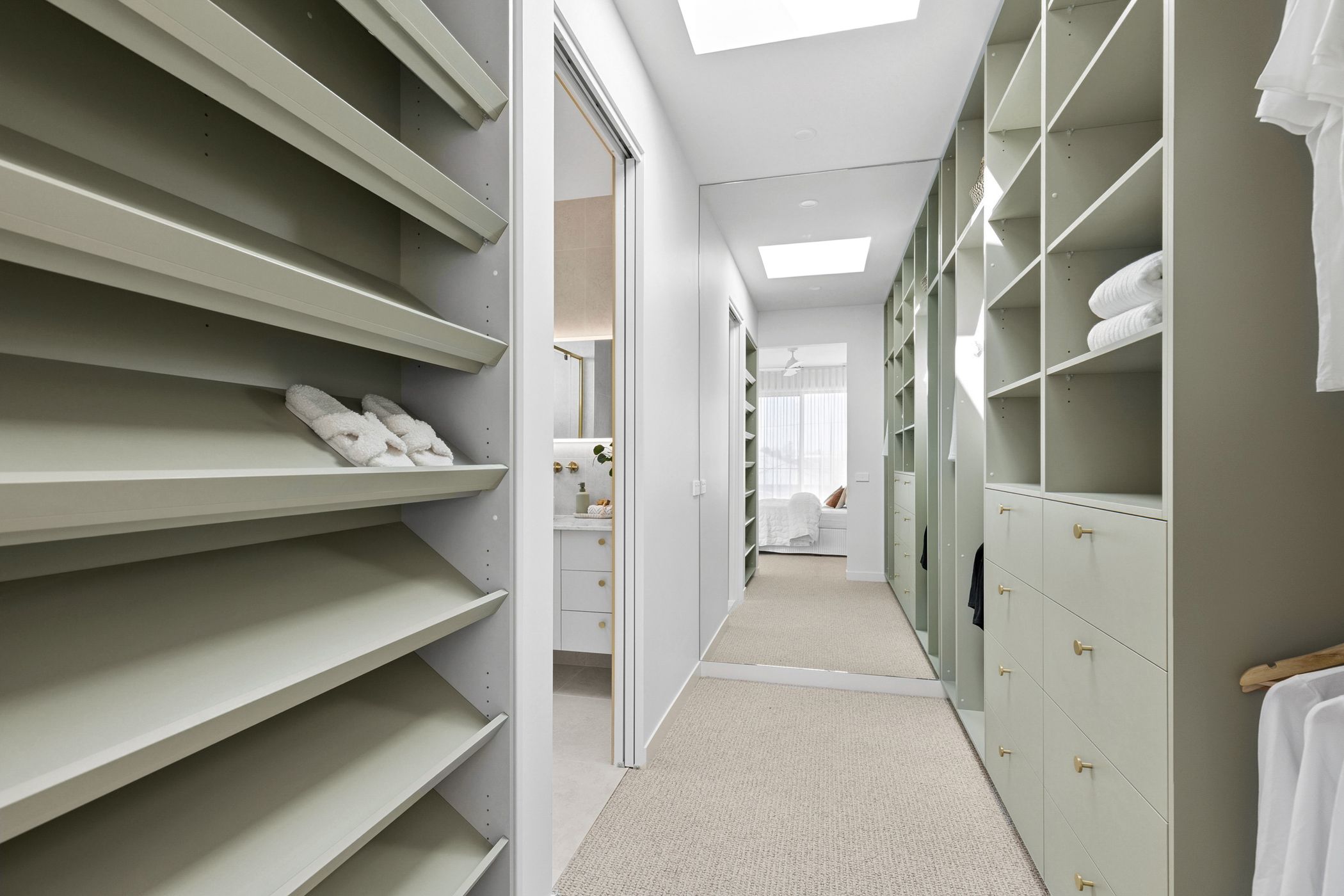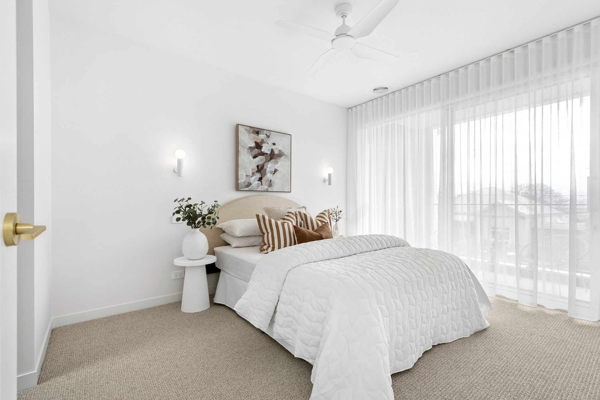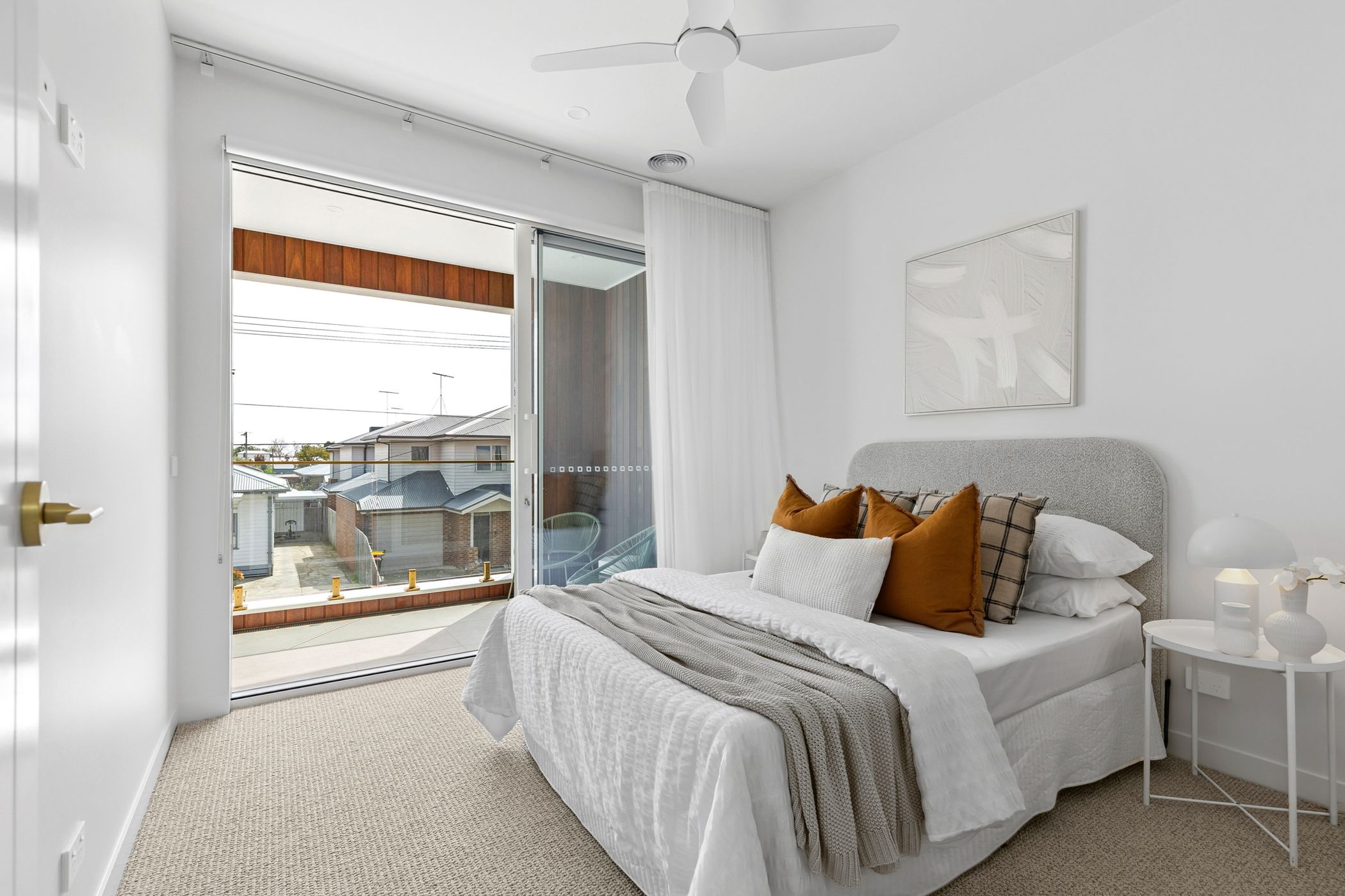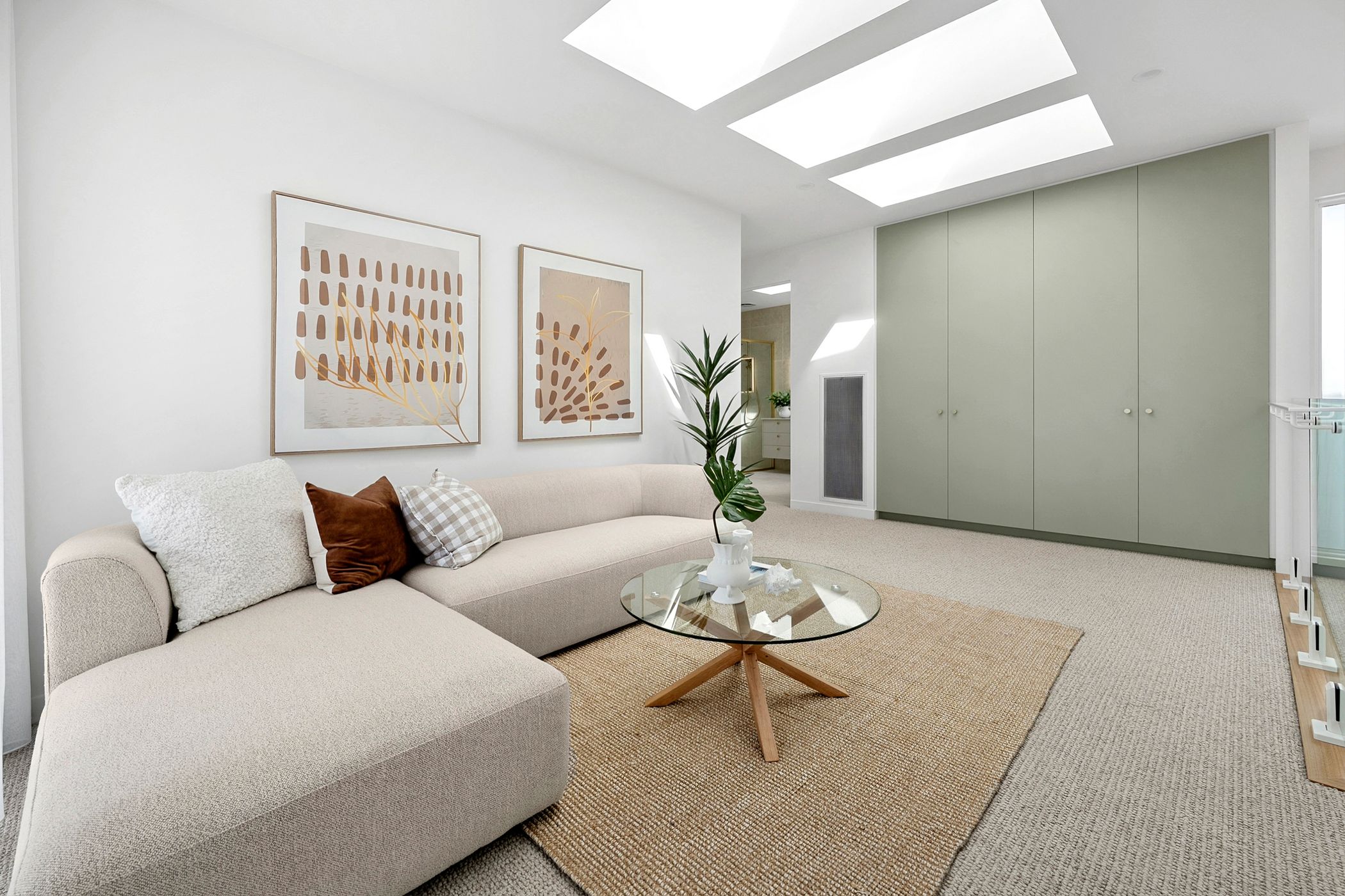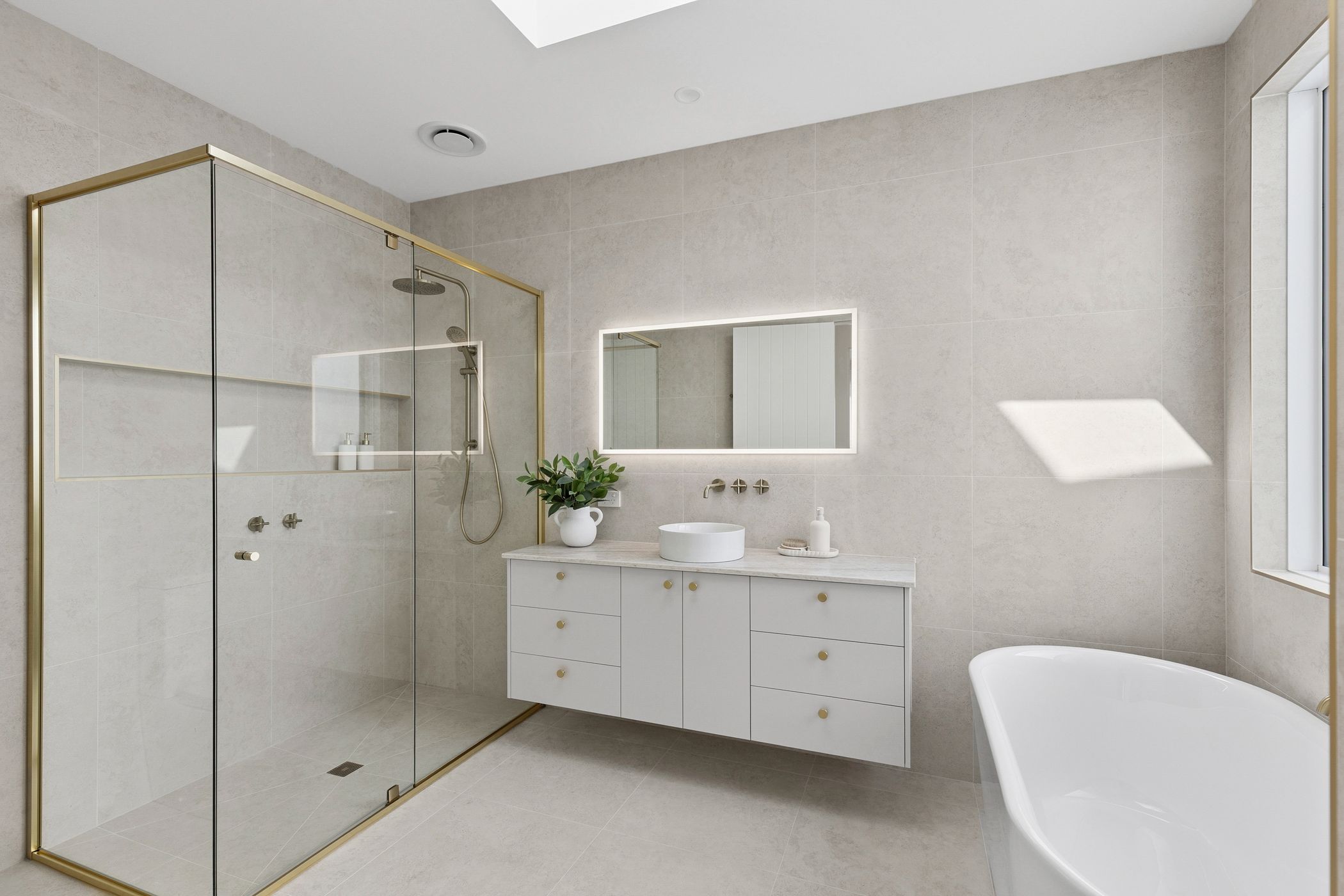 Upstairs, the luxurious master suite provides a peaceful private retreat, complete with a fully fitted walk-in robe, chic ensuite, and its own balcony-the ideal spot for a quiet morning coffee. Two additional bedrooms share a central bathroom featuring floor-to-ceiling tiles, a stone-topped vanity and a freestanding oval bathtub. A second living area on this level provides versatility as a family lounge or casual retreat.