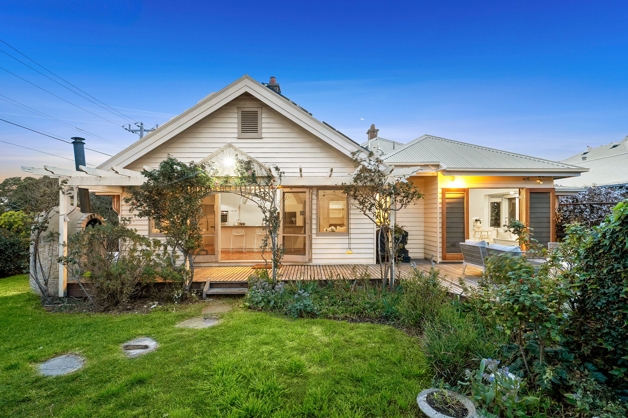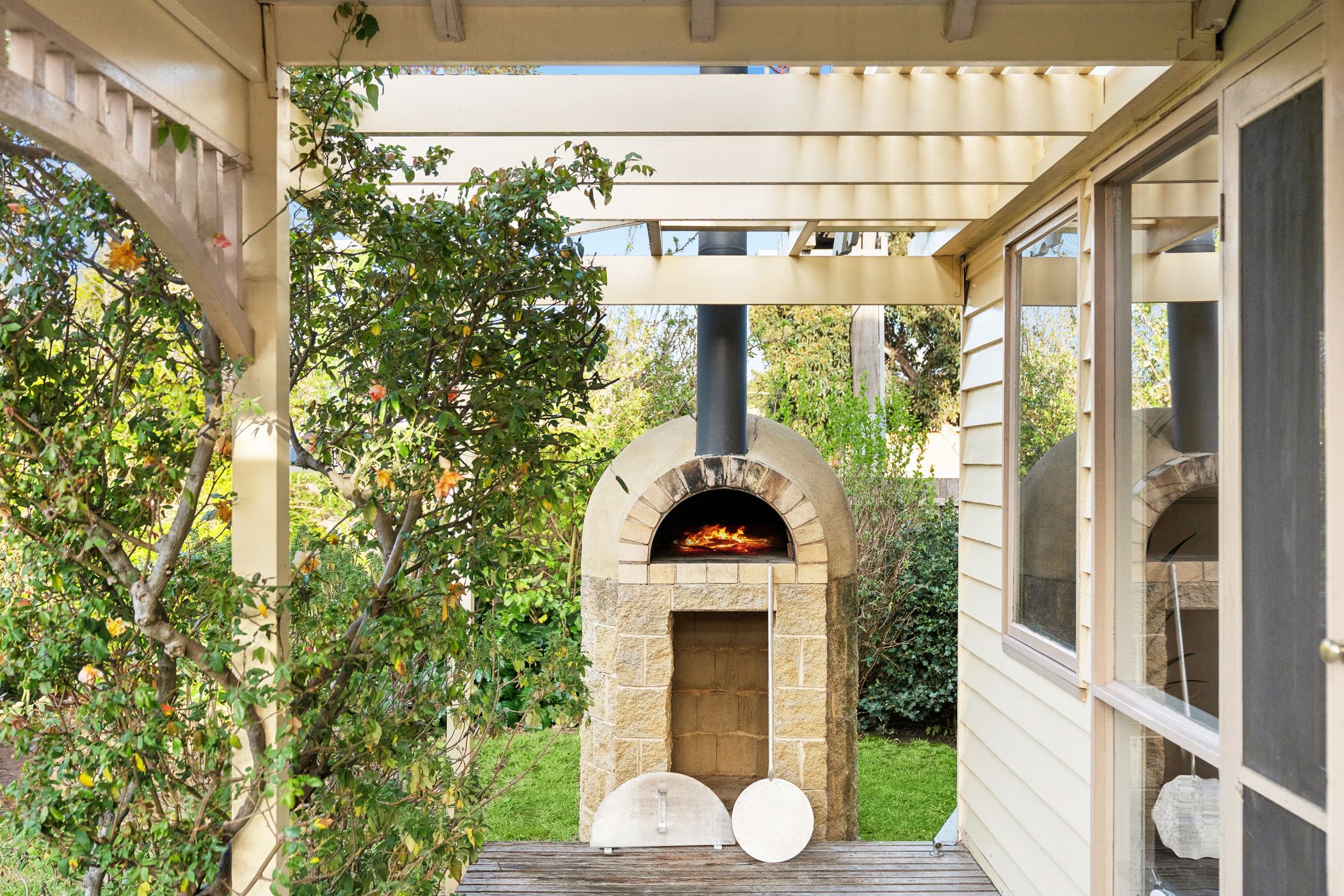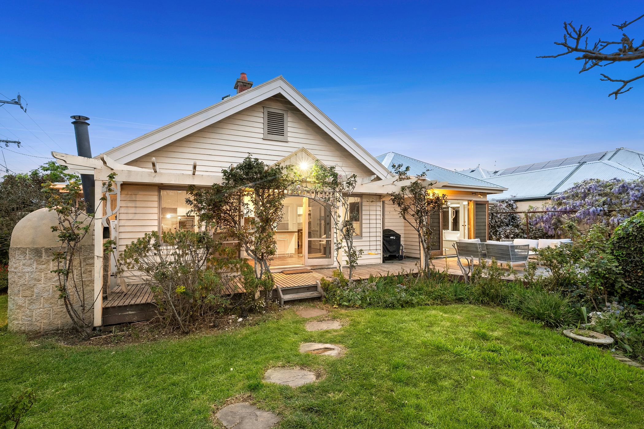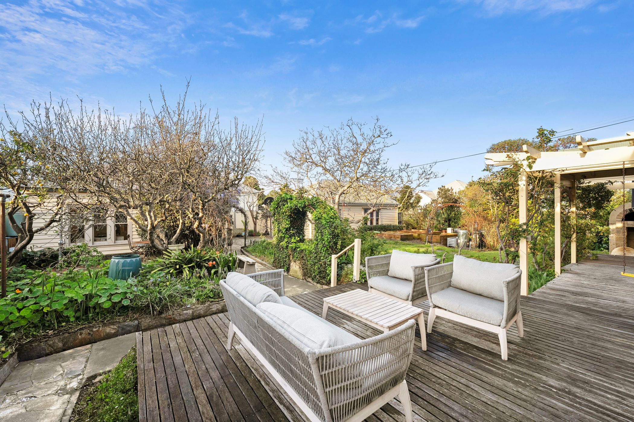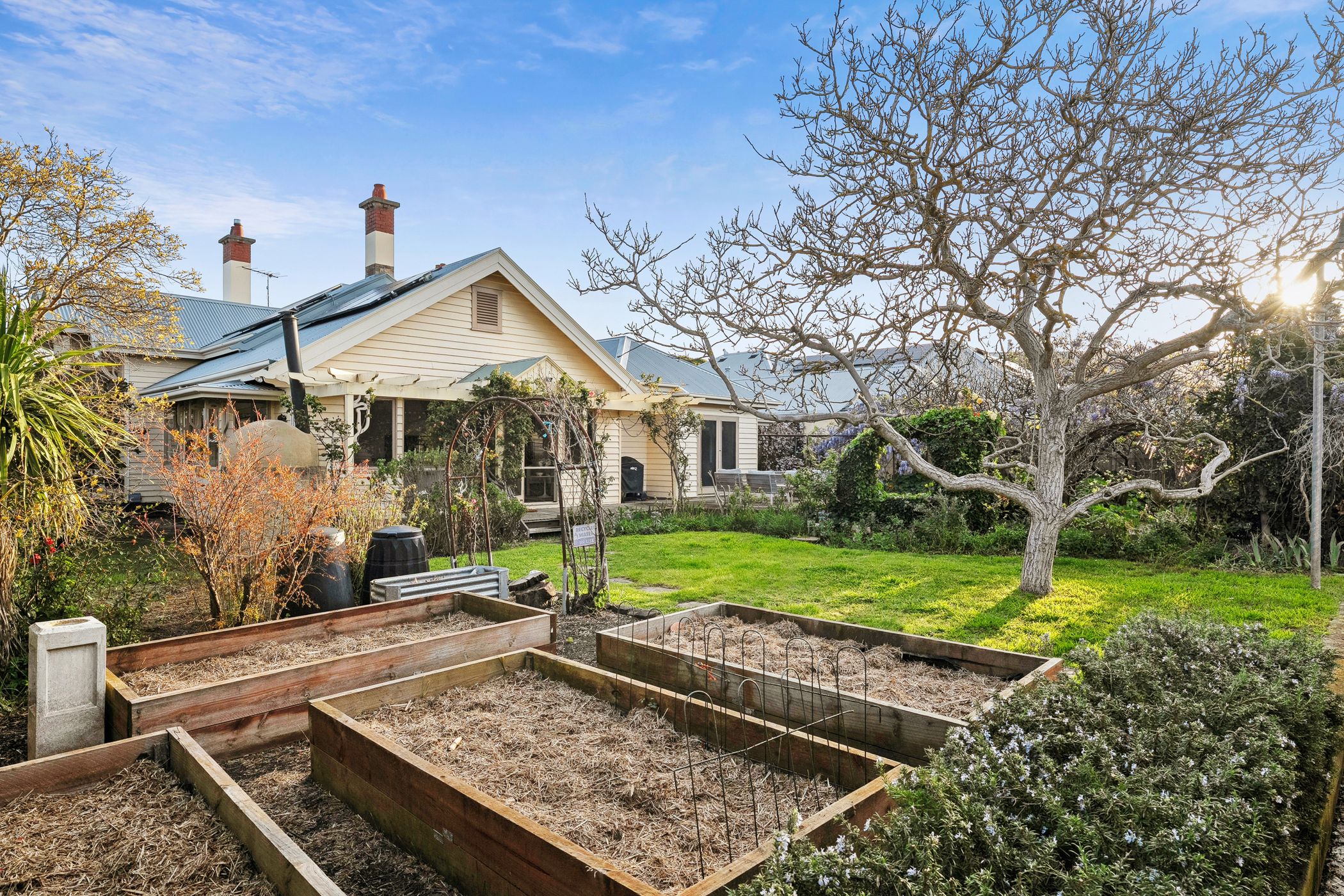 Overlooking the lush north-facing gardens and sun-drenched alfresco deck, the kitchen features a long island bench, stone surfaces, stainless steel appliances and a walk-in pantry. The grounds are anchored by a majestic 70-year-old walnut tree, encircled by established ornamental plantings, a variety of fruit trees, raised vegetable beds and a custom-built pizza oven - an idyllic setting for entertaining or simply enjoying the rhythm of the seasons.