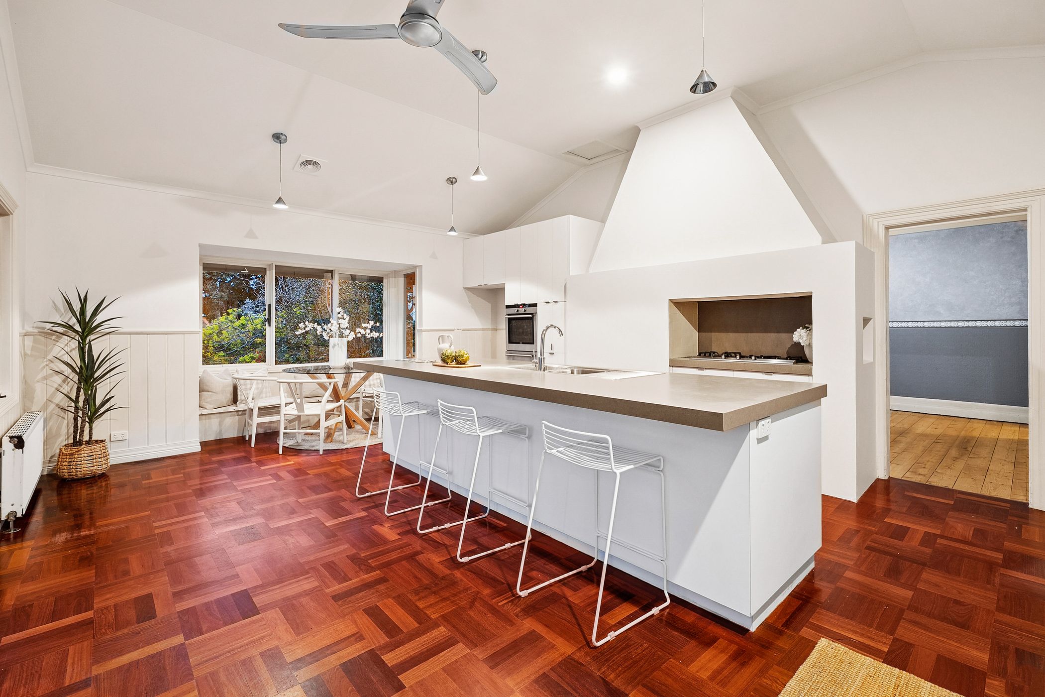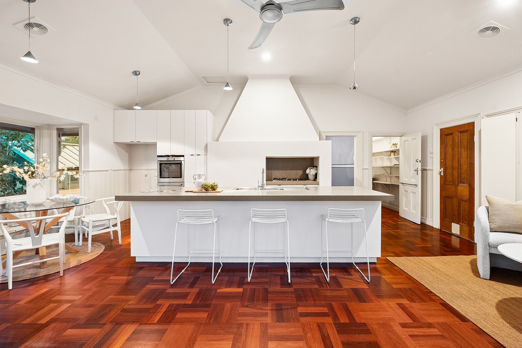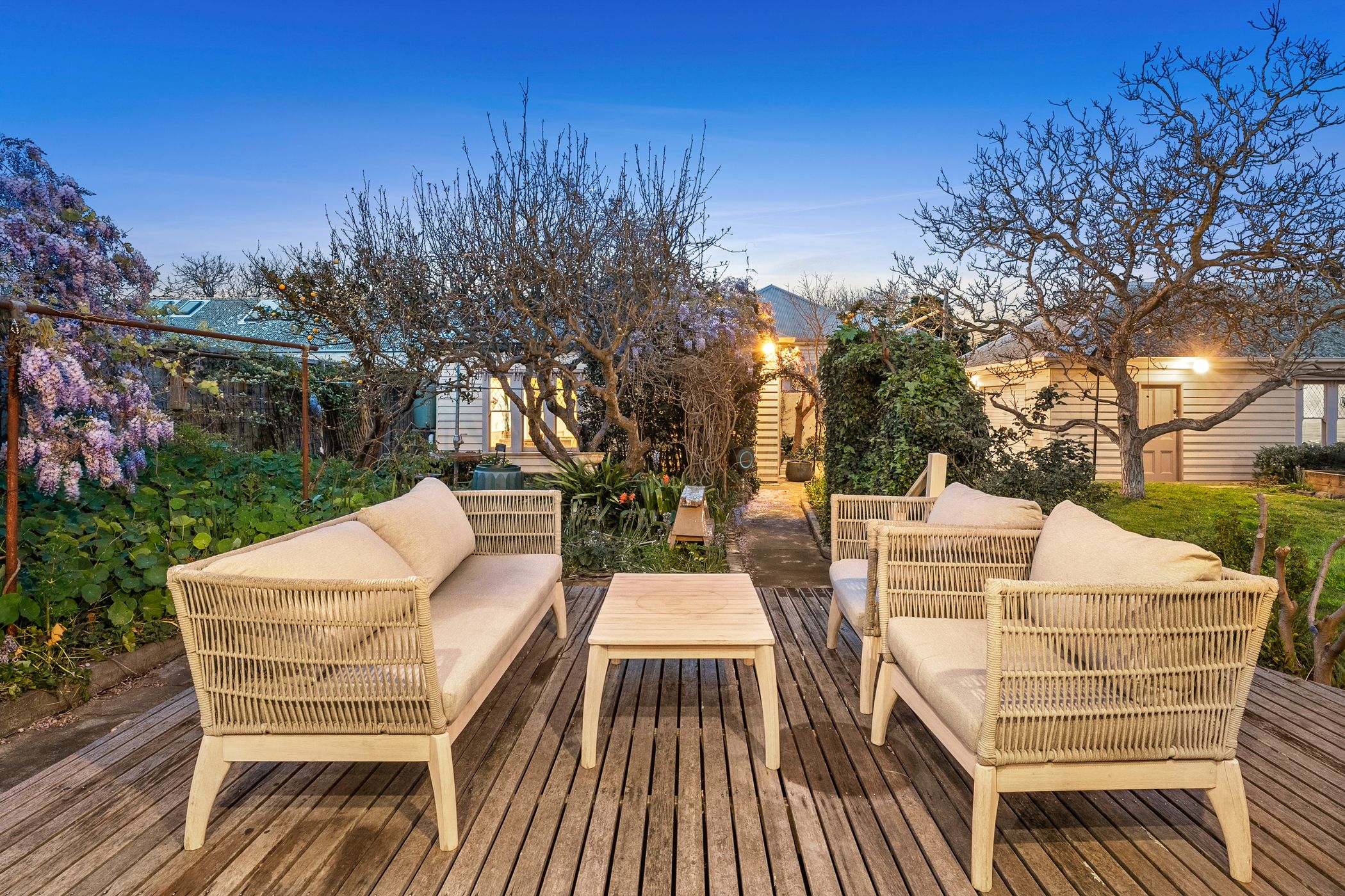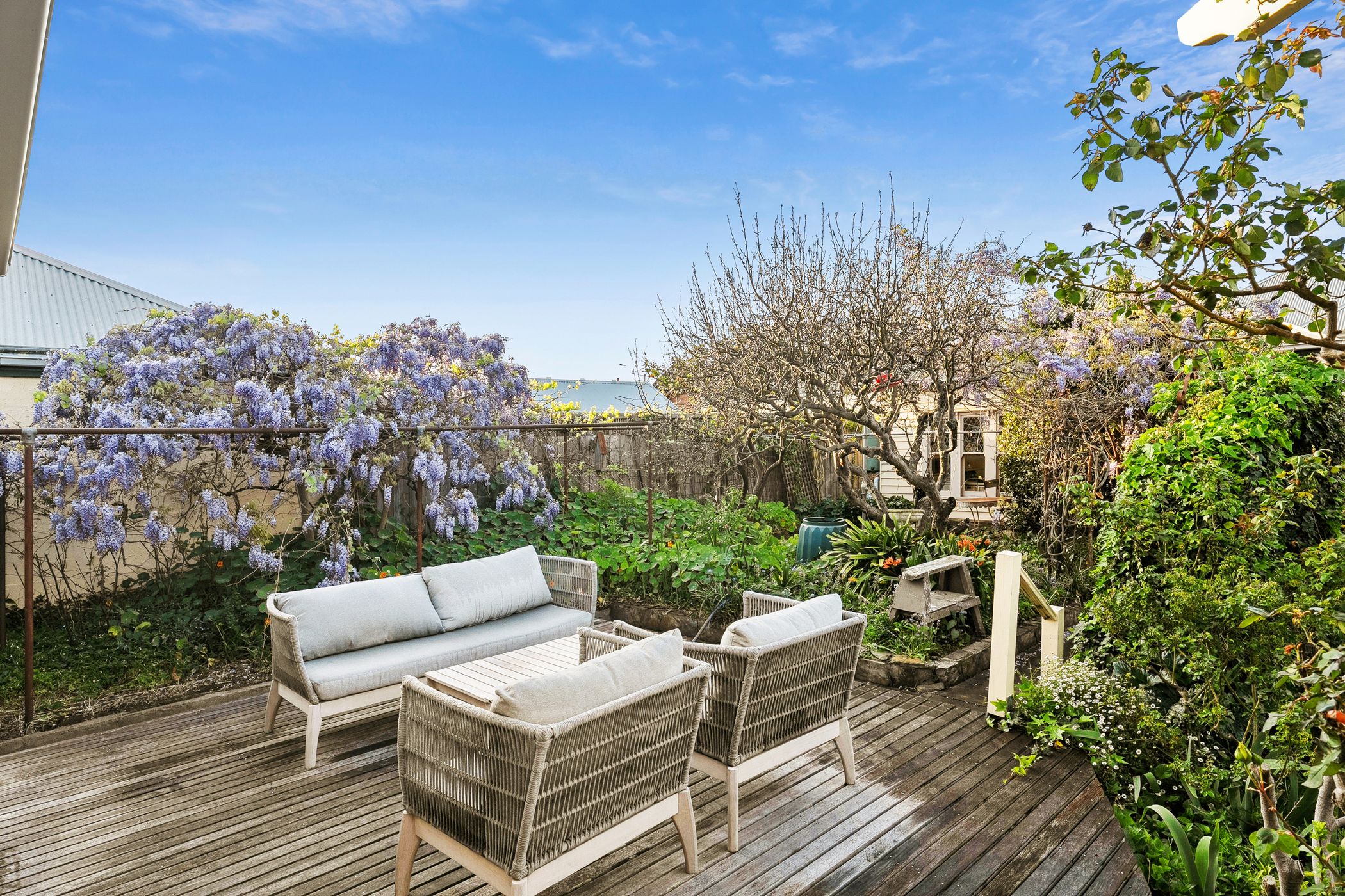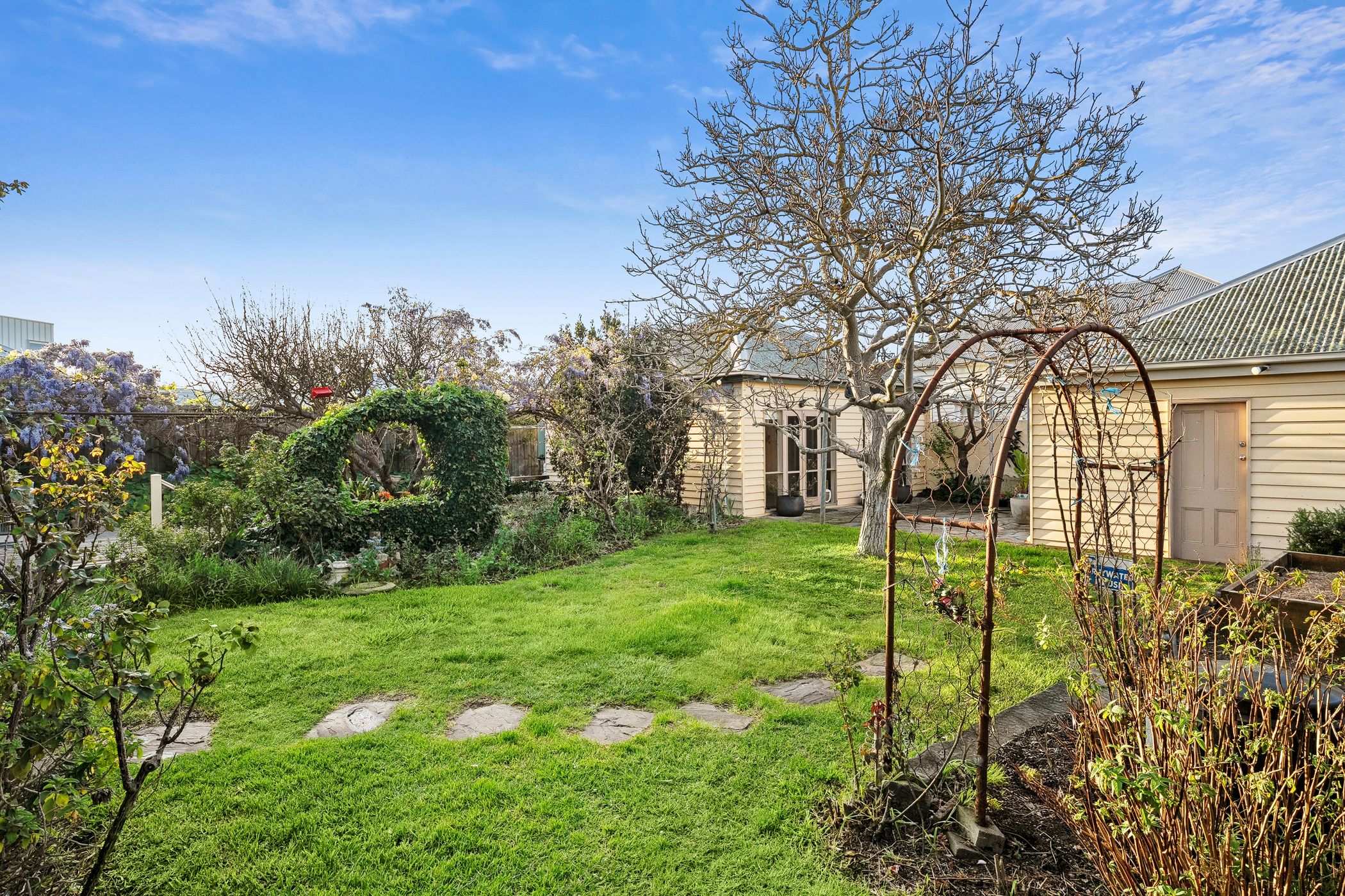 Overlooking the lush north-facing gardens and sun-drenched alfresco deck, the kitchen features a long island bench, stone surfaces, stainless steel appliances and a walk-in pantry. The grounds are anchored by a majestic 70-year-old walnut tree, encircled by established ornamental plantings, a variety of fruit trees, raised vegetable beds and a custom-built pizza oven - an idyllic setting for entertaining or simply enjoying the rhythm of the seasons.