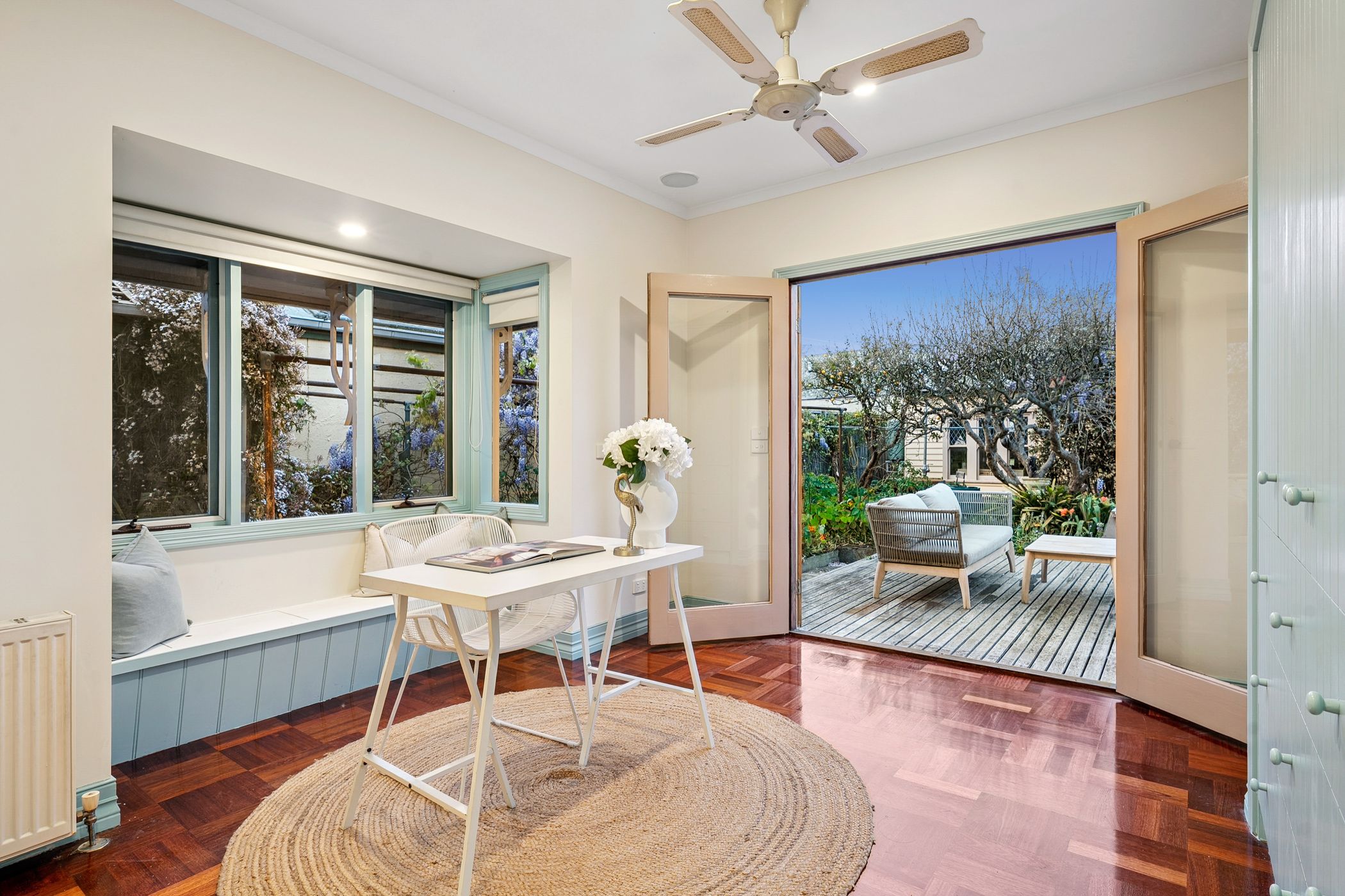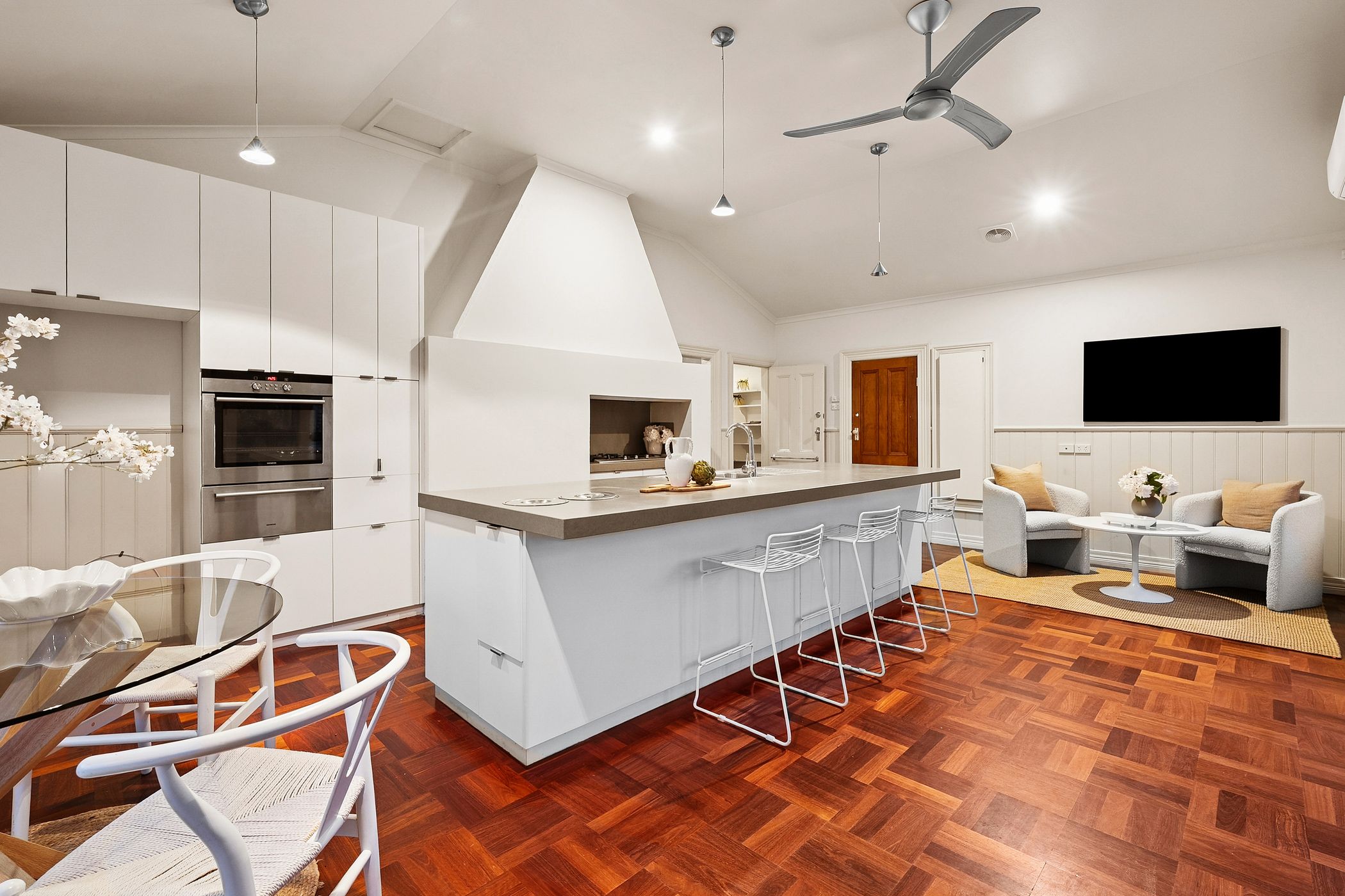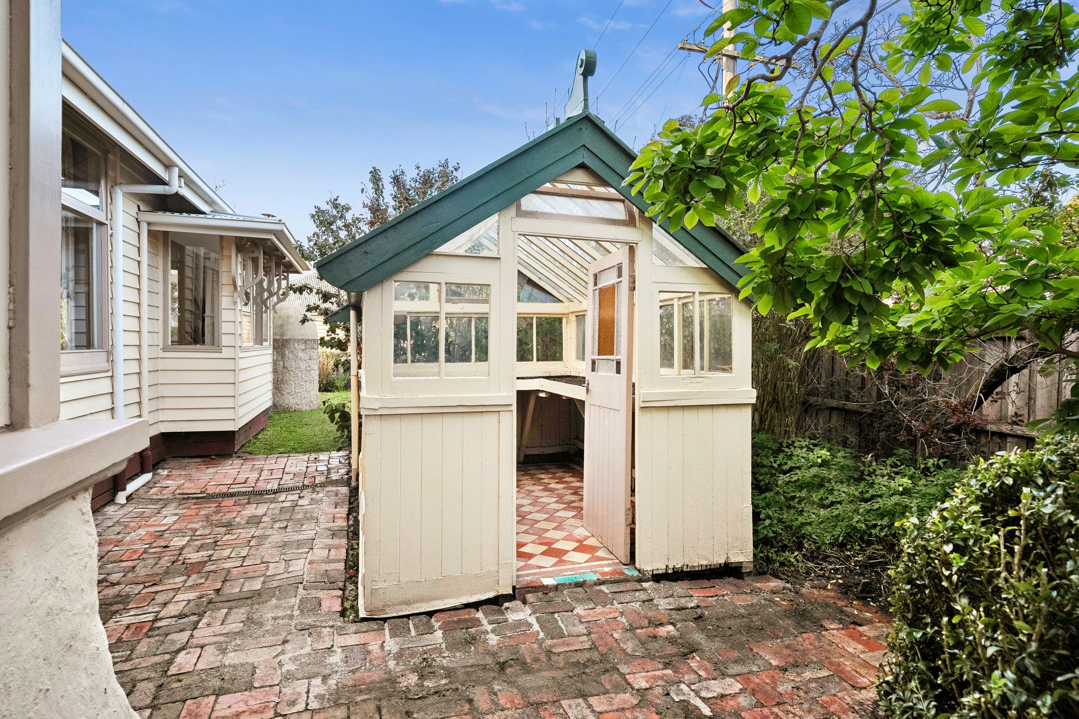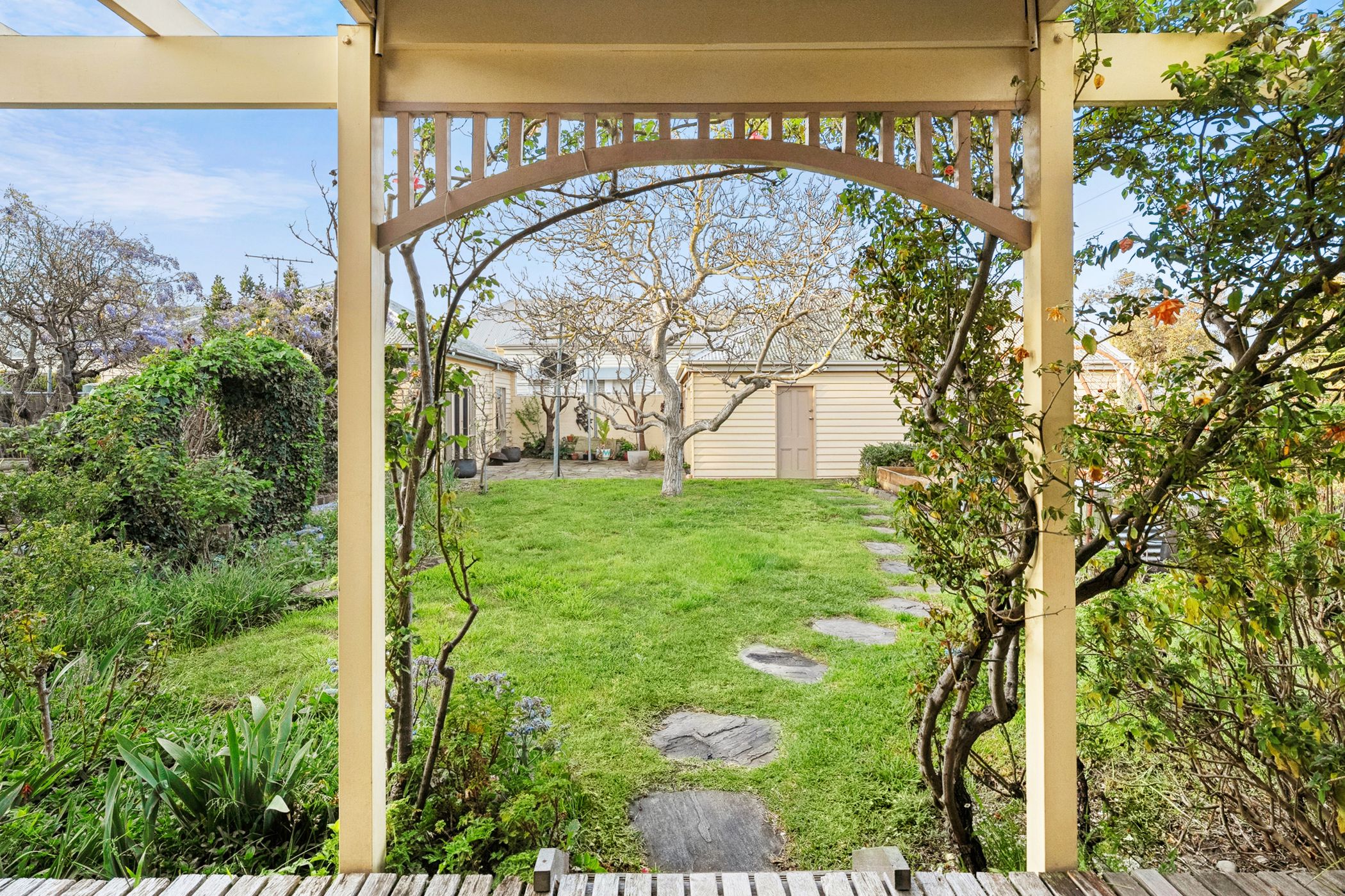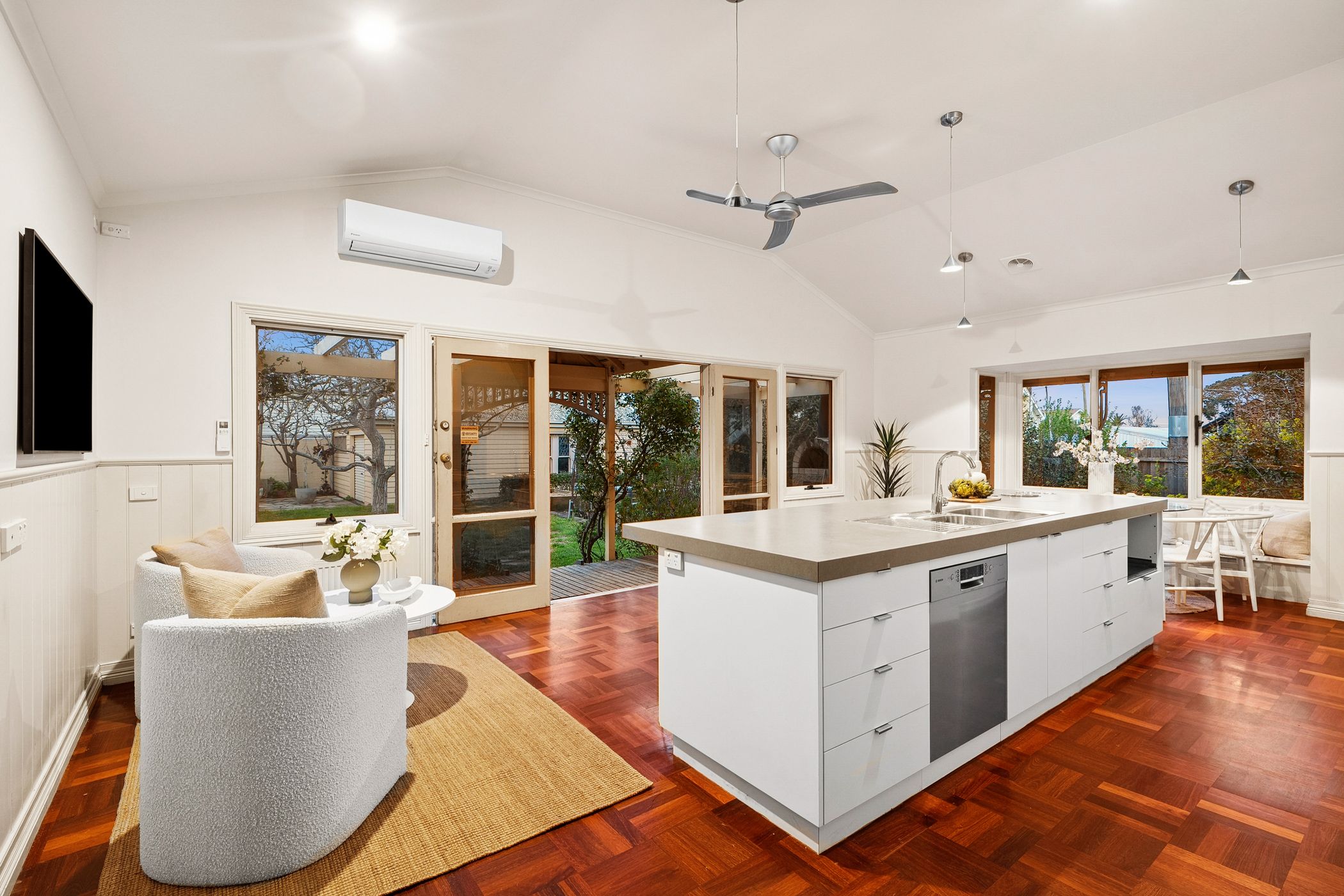 Overlooking the lush north-facing gardens and sun-drenched alfresco deck, the kitchen features a long island bench, stone surfaces, stainless steel appliances and a walk-in pantry. The grounds are anchored by a majestic 70-year-old walnut tree, encircled by established ornamental plantings, a variety of fruit trees, raised vegetable beds and a custom-built pizza oven - an idyllic setting for entertaining or simply enjoying the rhythm of the seasons.