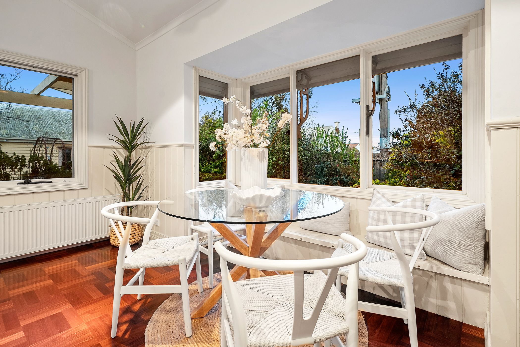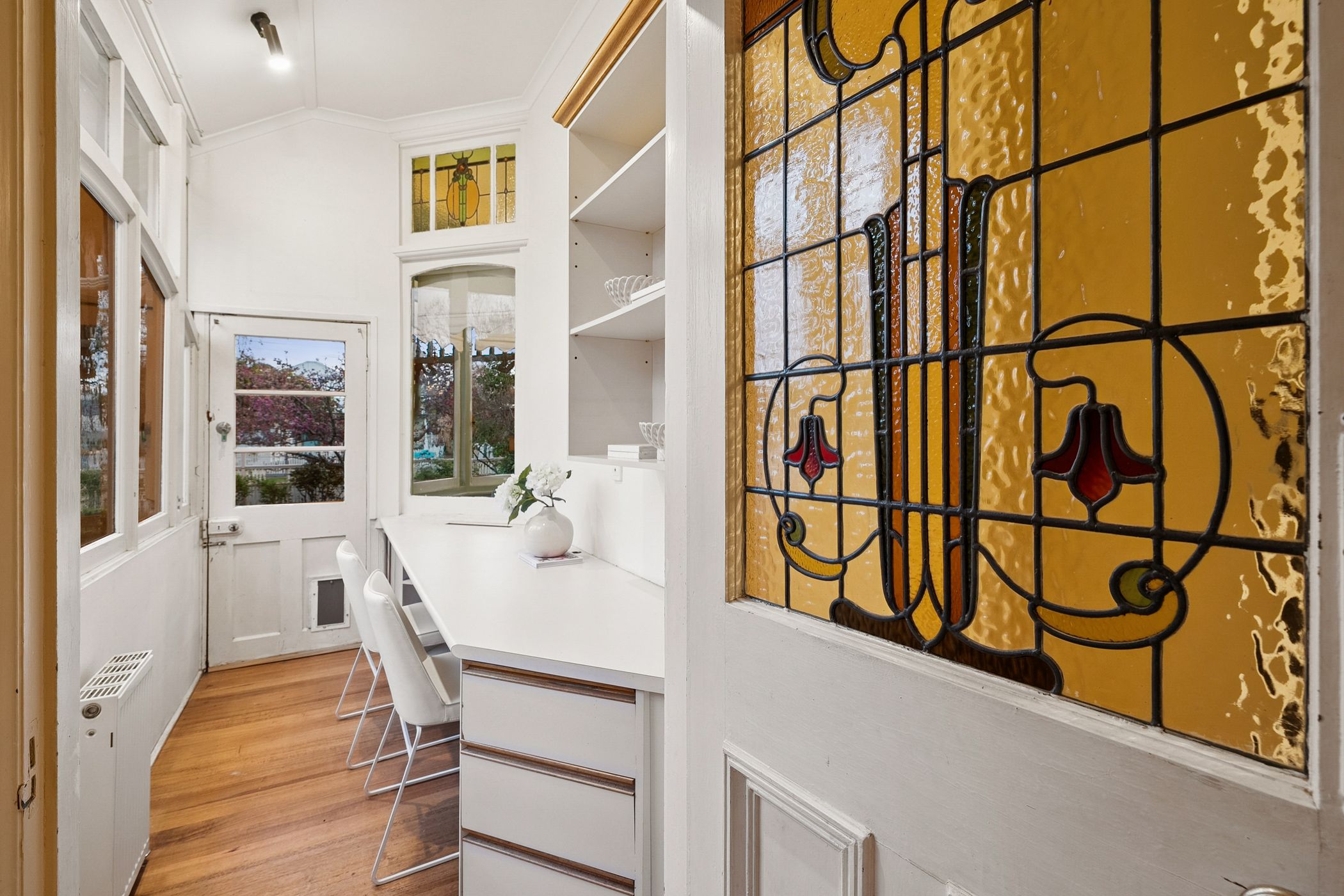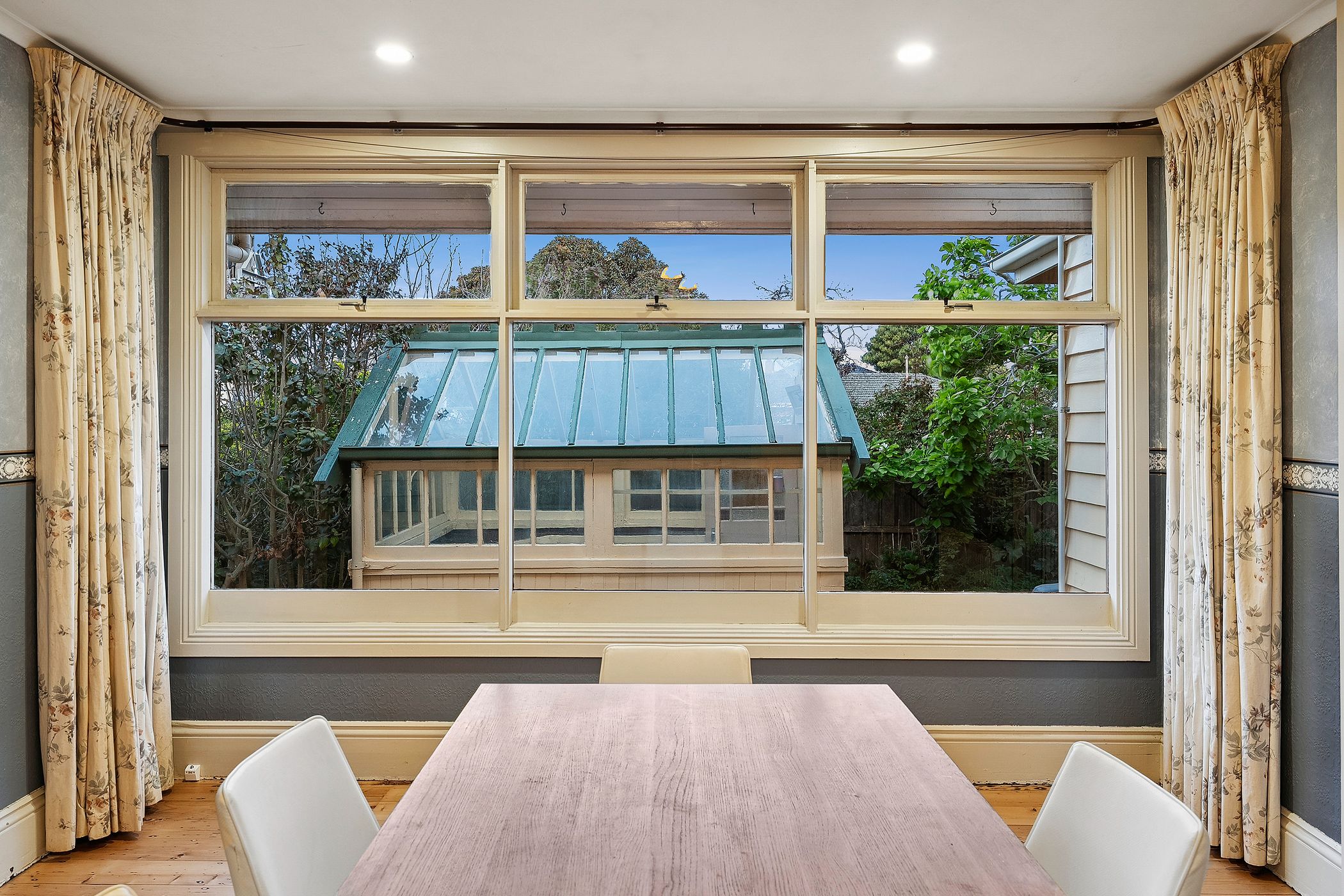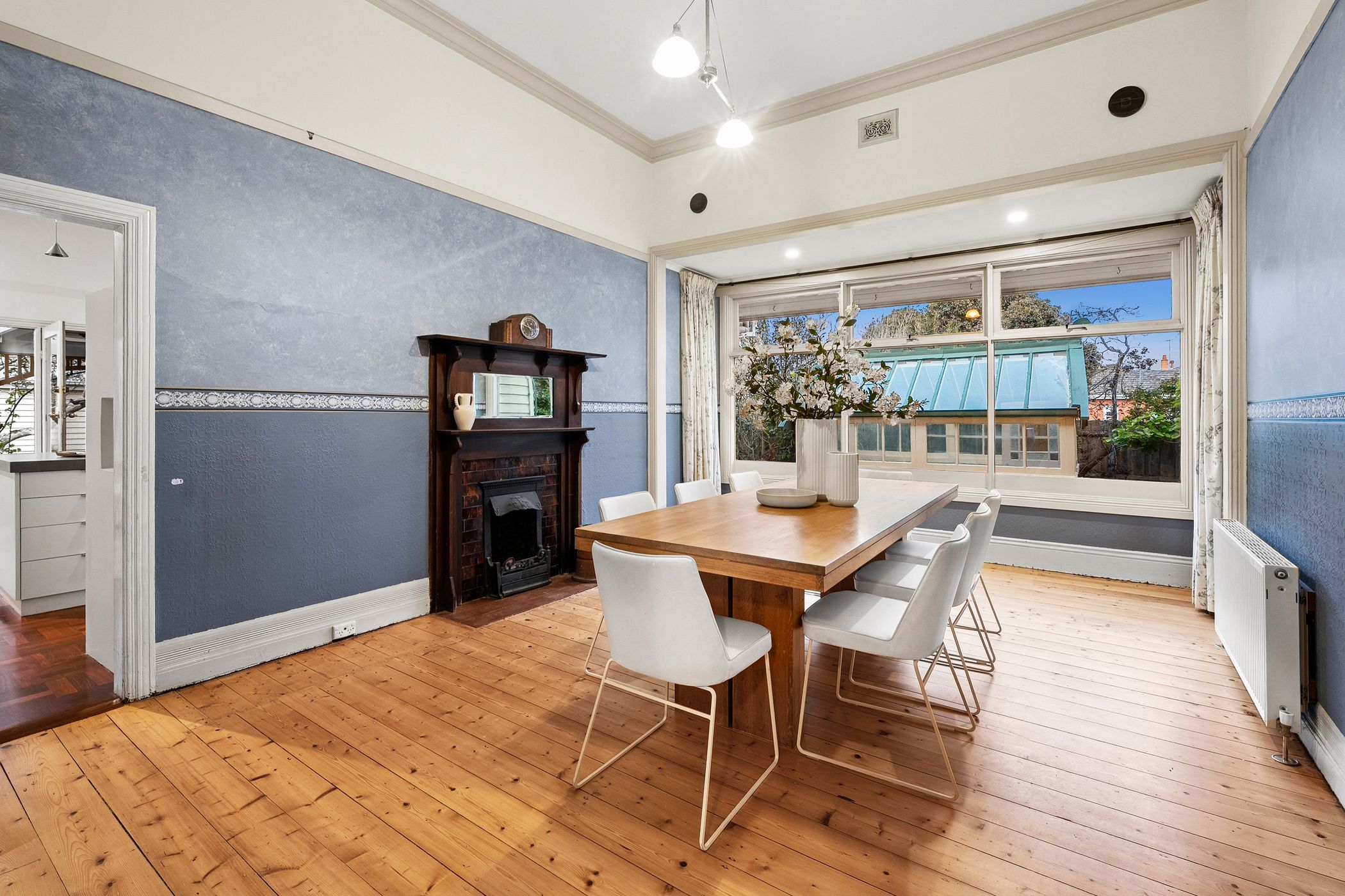 Its grandeur is matched by generous proportions, with a flowing floor plan offering both formal and informal living areas. A stunning bay-windowed lounge captures glimpses of the water, while a second sitting room with a cosy wood fire adjoins a private study - perfect for quiet reflection or remote work. The formal dining room is bathed in natural light and gazes toward the original hothouse, a charming nod to the property's horticultural heritage.