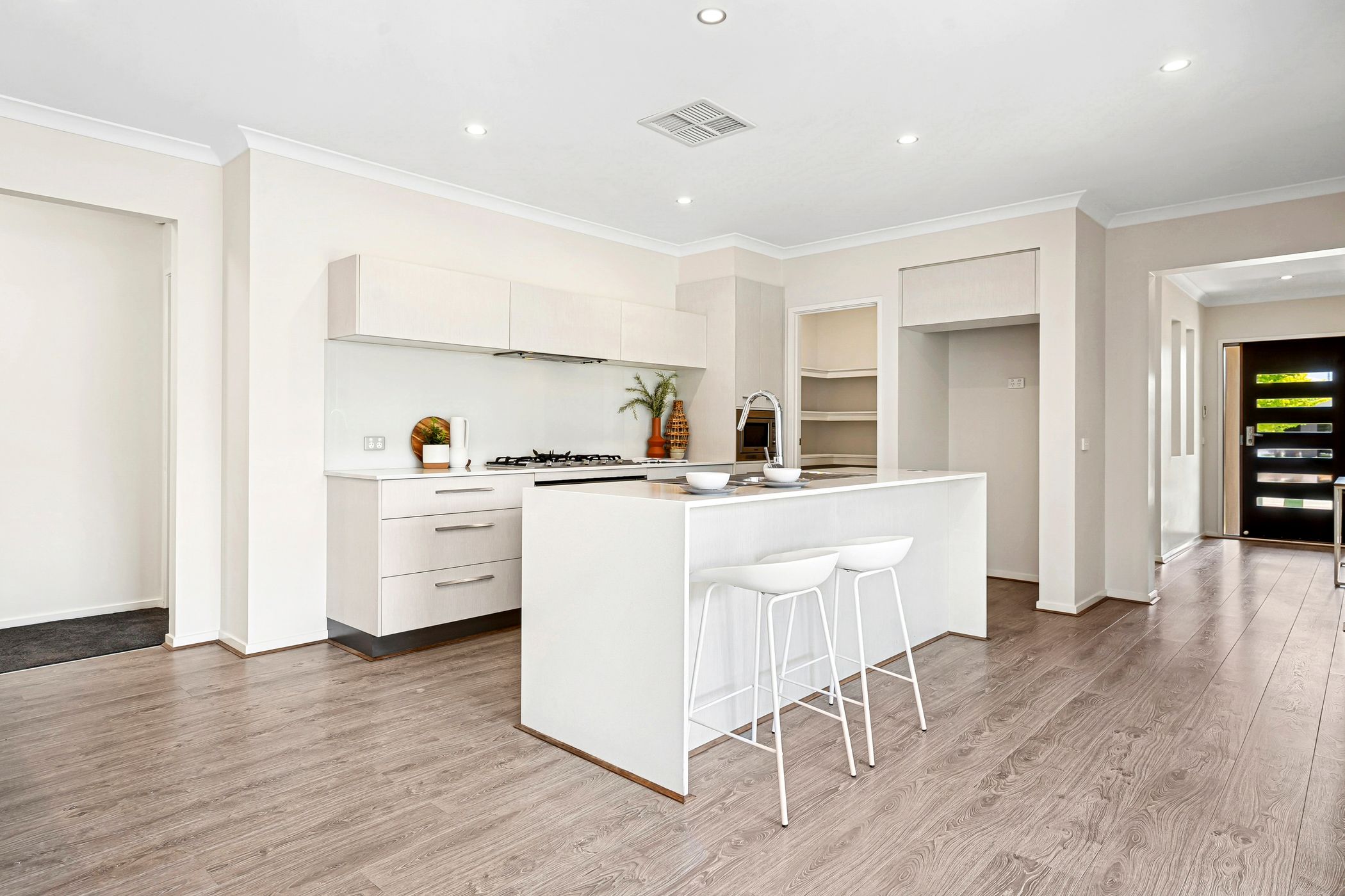 The home is rich with quality features, floating floorboards, and thoughtful upgrades throughout. The kitchen is beautifully equipped with 20mm waterfall stone benchtops, wide drawers and pot drawers, a walk-in pantry, Technika appliances including a 900 mm in built oven, a five burner gas cooktop, microwave and dishwasher, overhead cabinetry, a double under mounted sink, and a pop-up power hub on the island bench. The rear bedroom wing provides three spacious bedrooms with built in robes, a family bathroom with stone finishes and a separate toilet, and a well-appointed laundry. Outside, kids have plenty of room to run around the large backyard, with a garden shed also available for the mower and gardening tools.