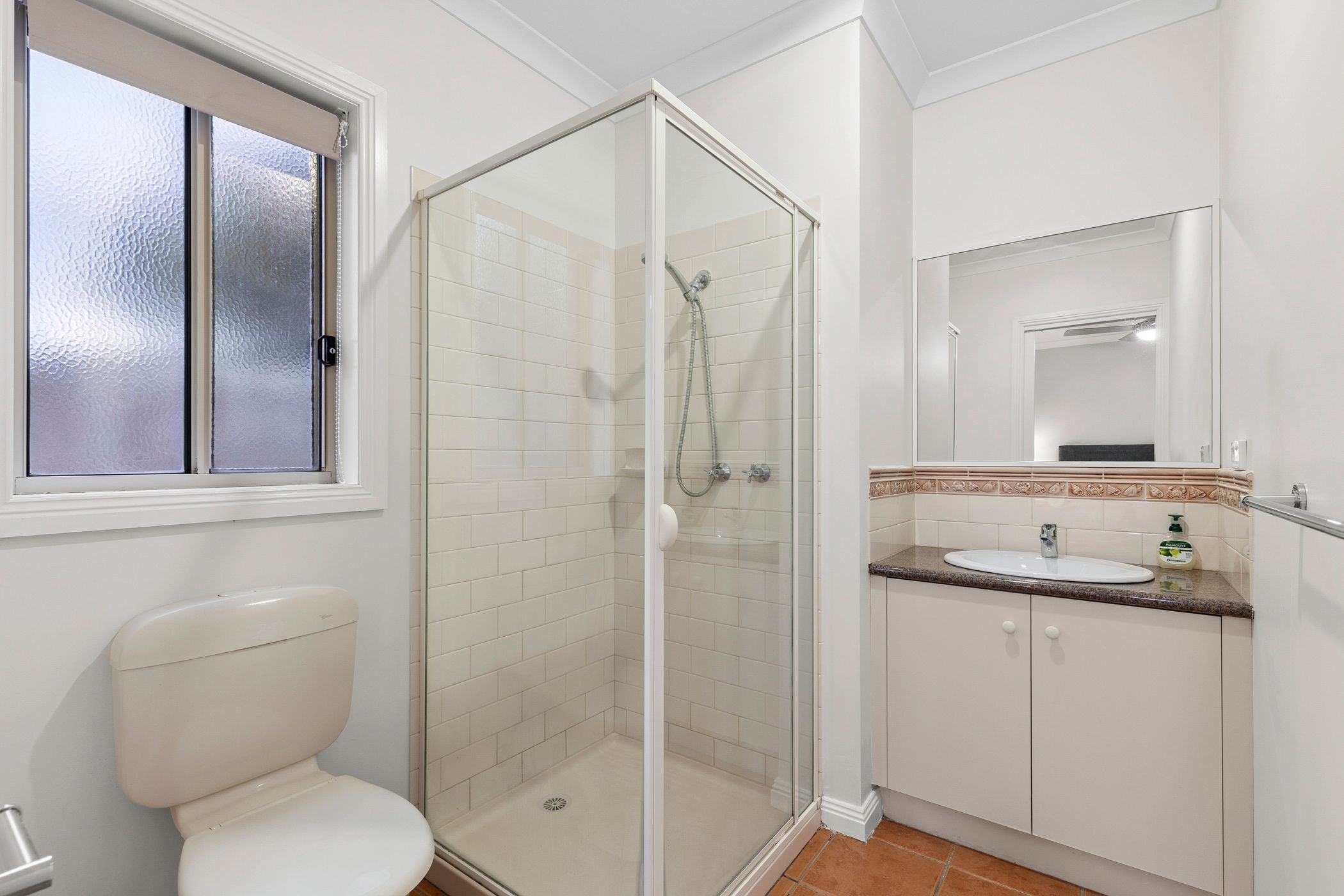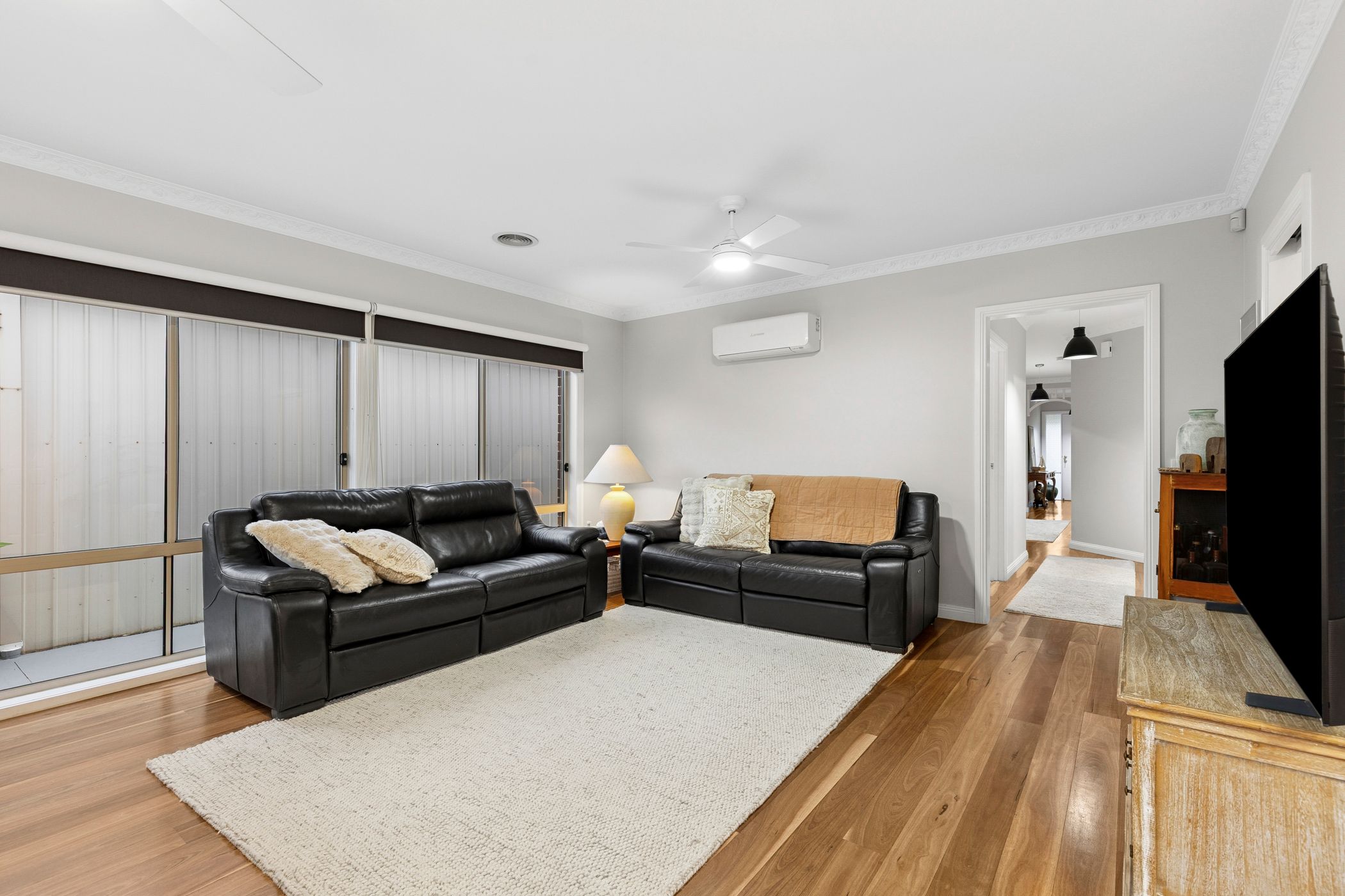 Accommodation includes a master bedroom with a walk-in robe and private ensuite, while two additional bedrooms with built-in robes share a central family bathroom. A separate laundry enhances everyday functionality with direct access to the clothesline. Comfort is assured year-round with ducted heating, multiple split-system air conditioners, and ceiling fans throughout.
