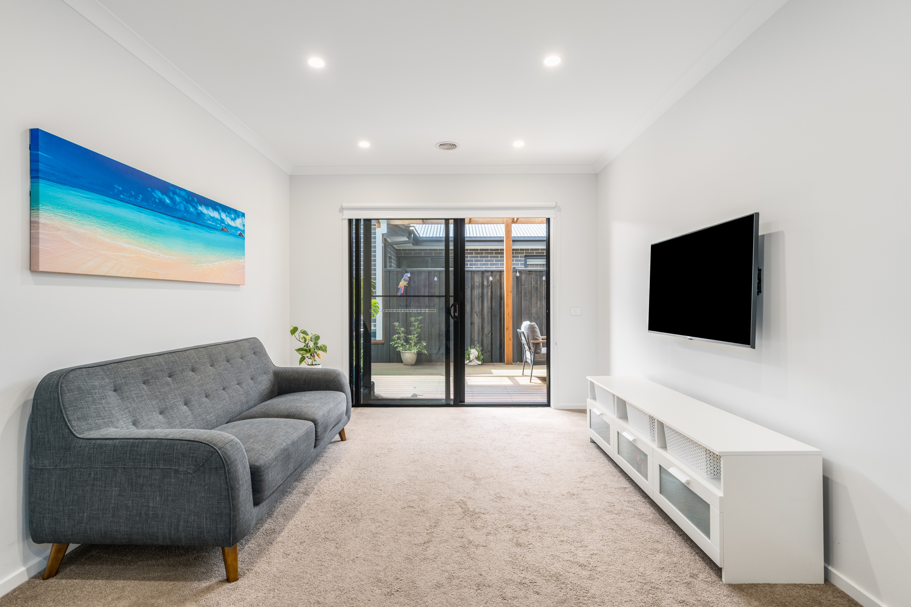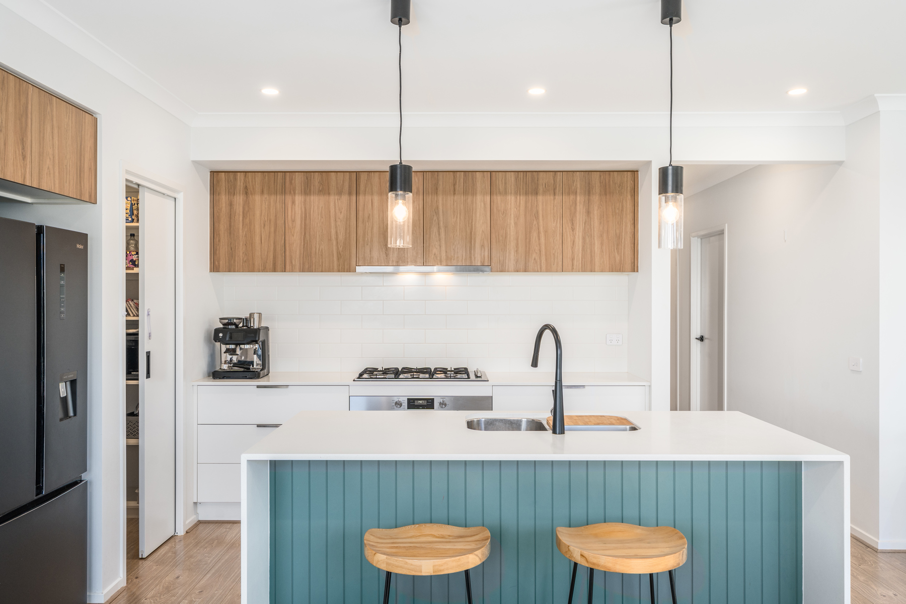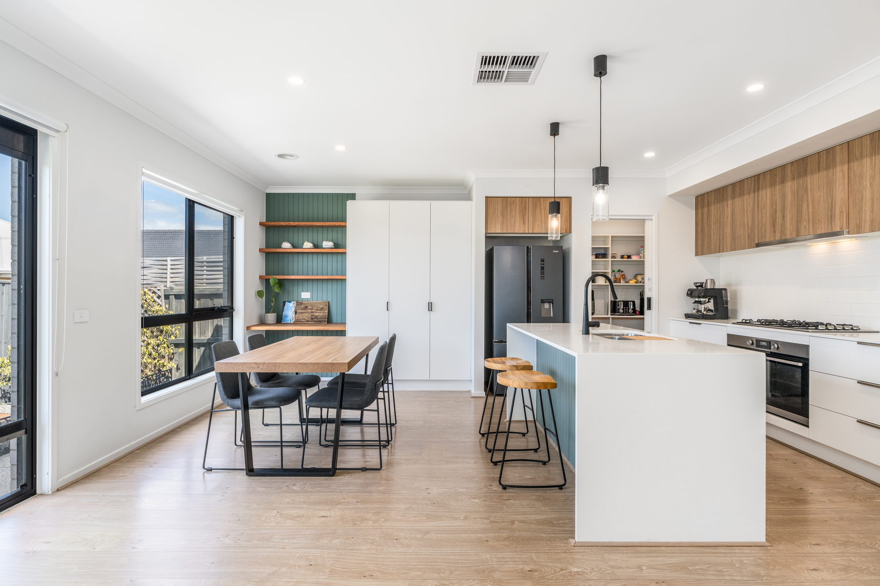 The striking street presence and landscaped surrounds create an immediate sense of style, while the interior reveals a thoughtful floorplan designed for family living. A light-filled open-plan kitchen and living zone forms the heart of the home alongside a designated study nook and ample storage. Sleek stone countertops and plenty of cabinetry are further complimented by a functional walk-in pantry and stainless-steel appliances, perfect for the daily demands.